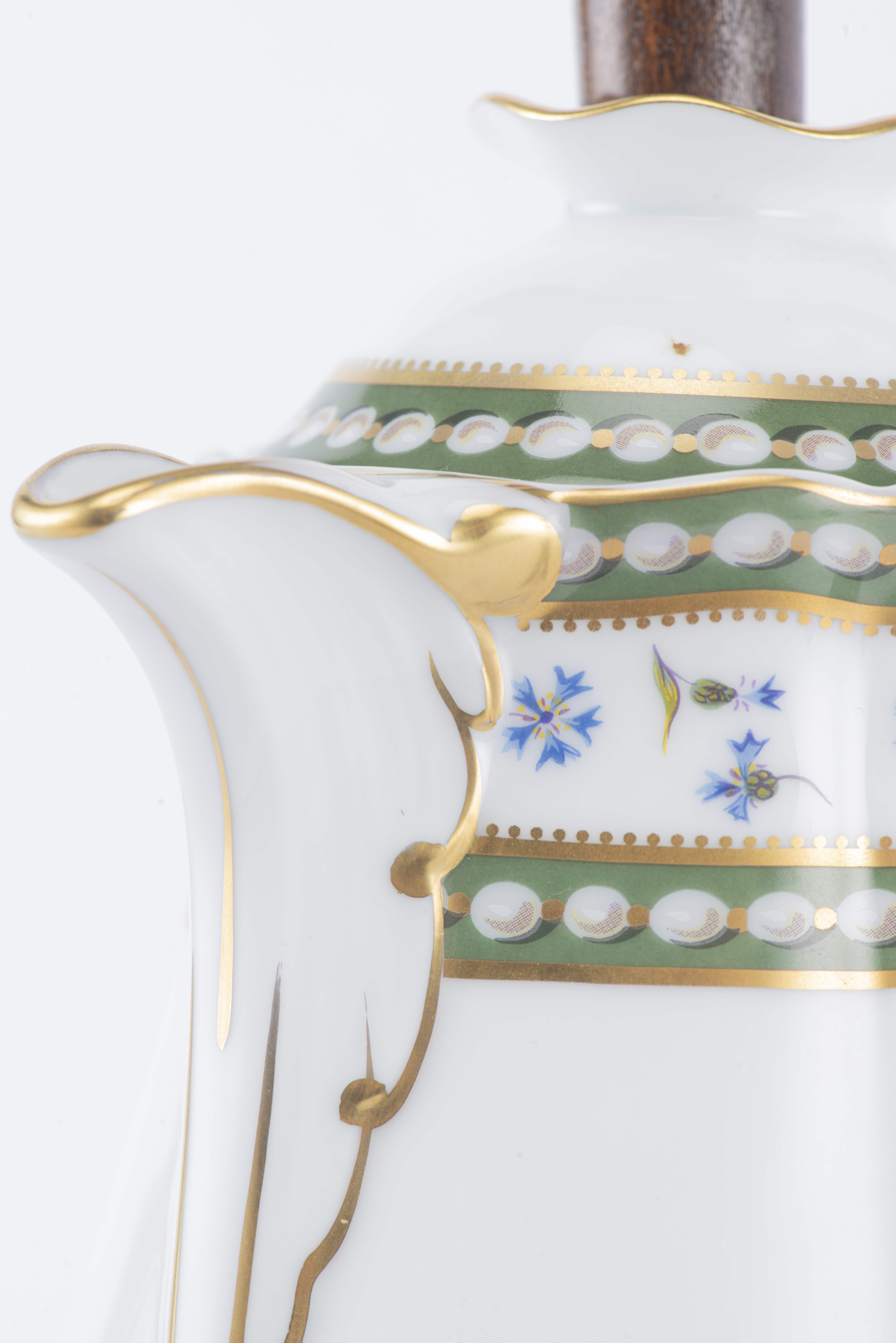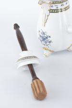 Bernardaud France, chocolatière en porcelaine de l'Ancienne Manufacture Royale de Limoges, décor Marie-Antoinette à perles et barbeaux, avec son couvercle et moussoir en bois. XXe.