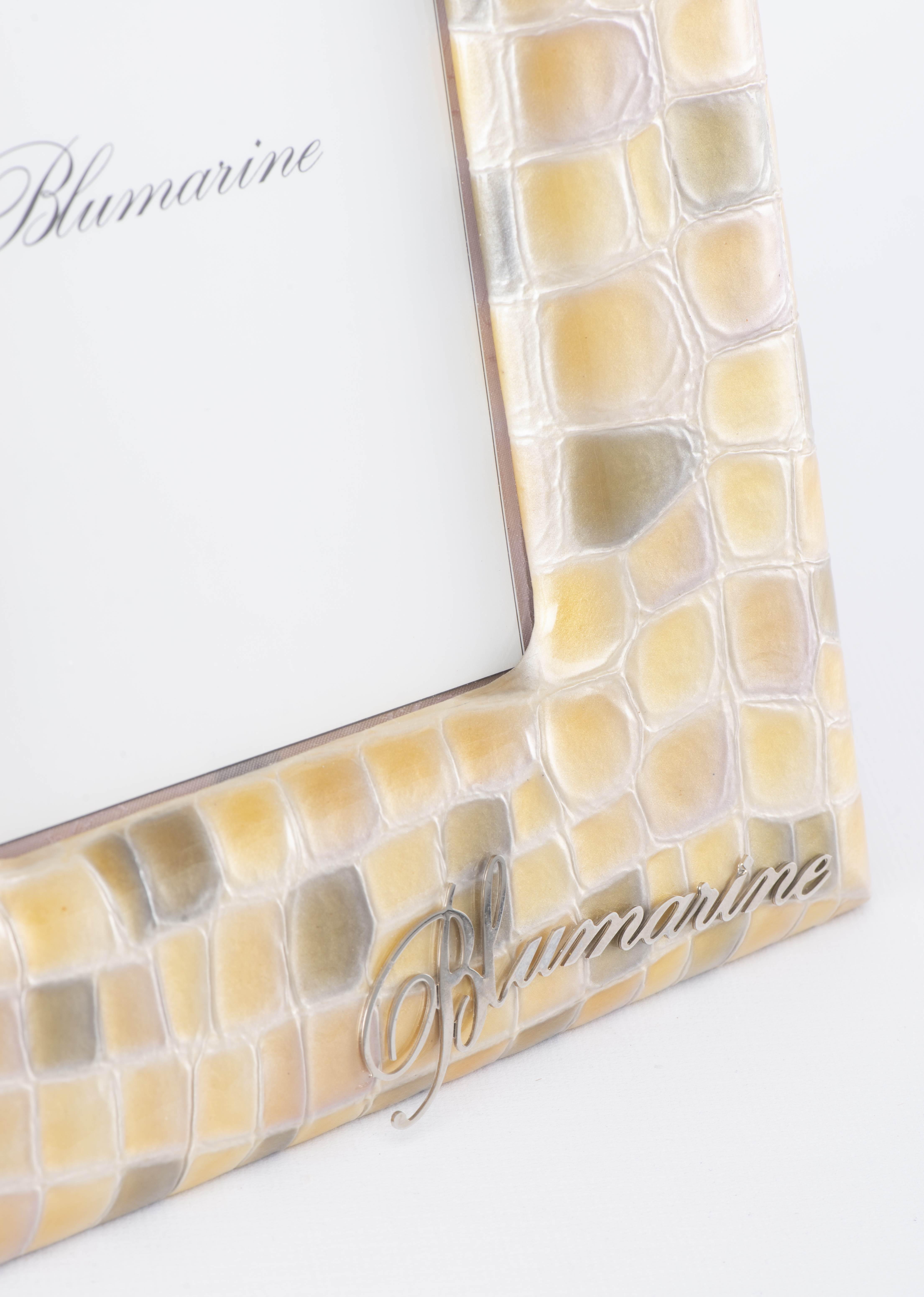Blumarine, cadre de photo avec encadrement en croco clair, dans une pochette en daim et son carton d'origine.