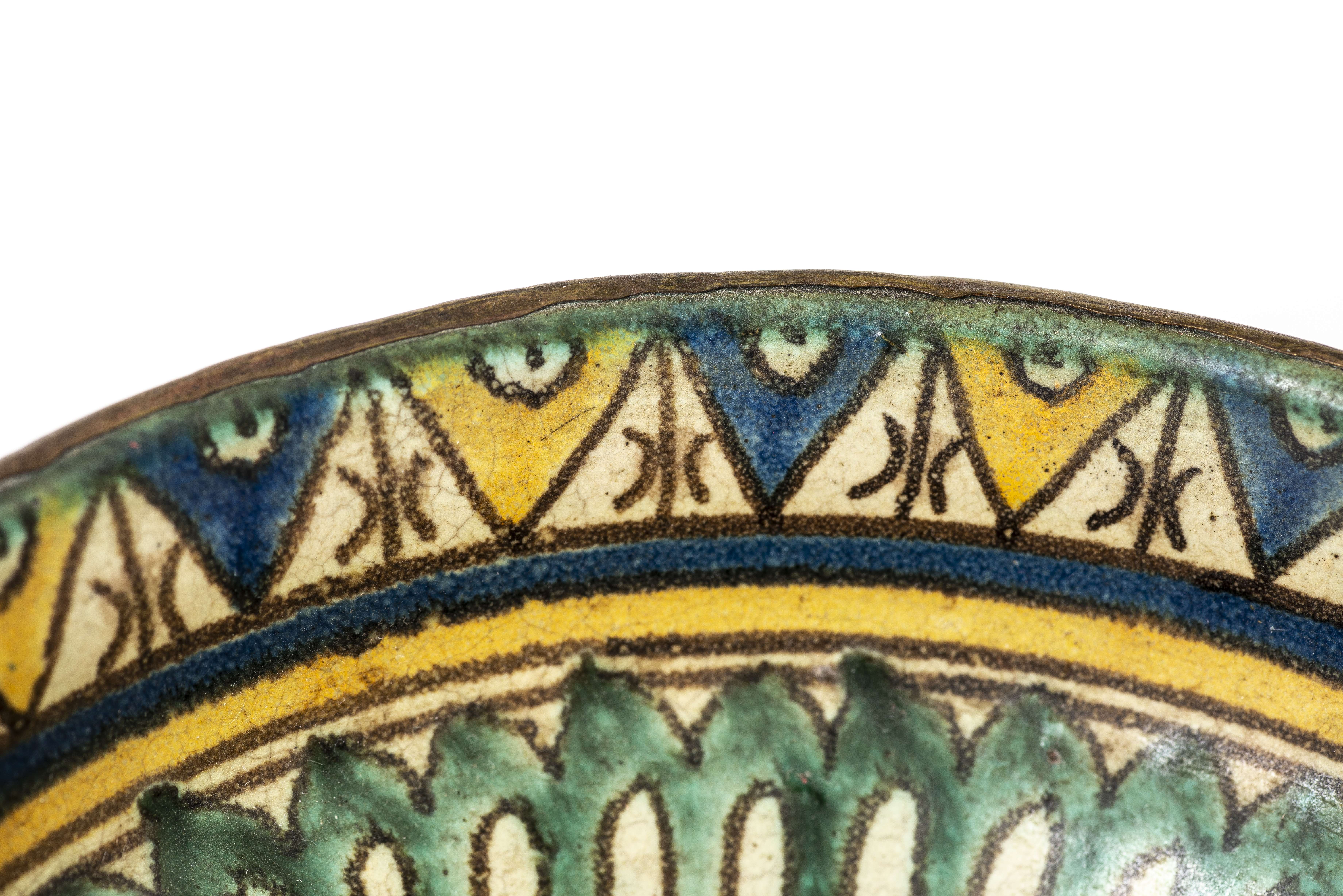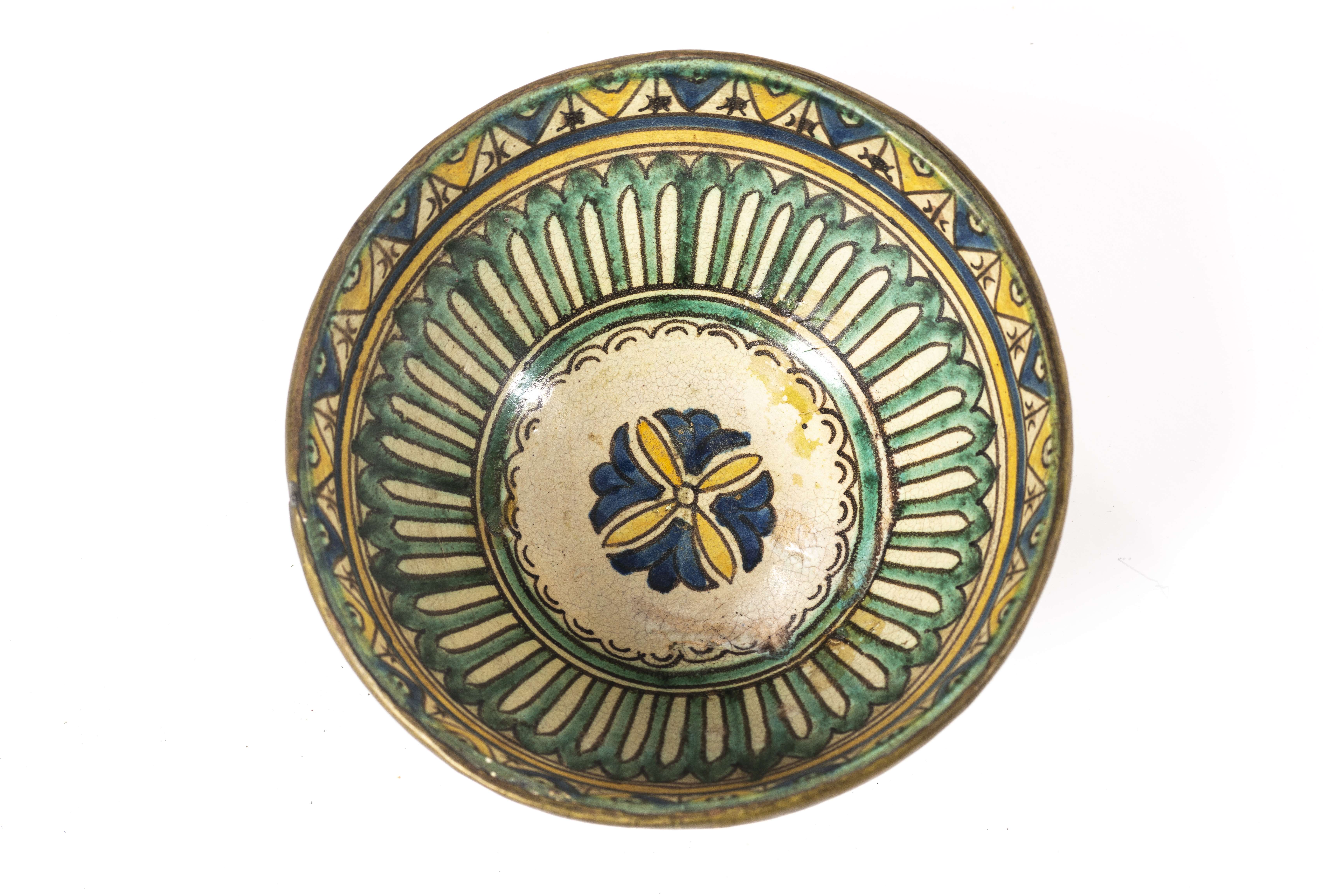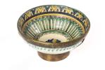 Bol en céramique probablement Iznik, à pieds et lèvres cerclés de métal, décor intérieur de motifs géométriques et floraux en vert, bleu et jaune.