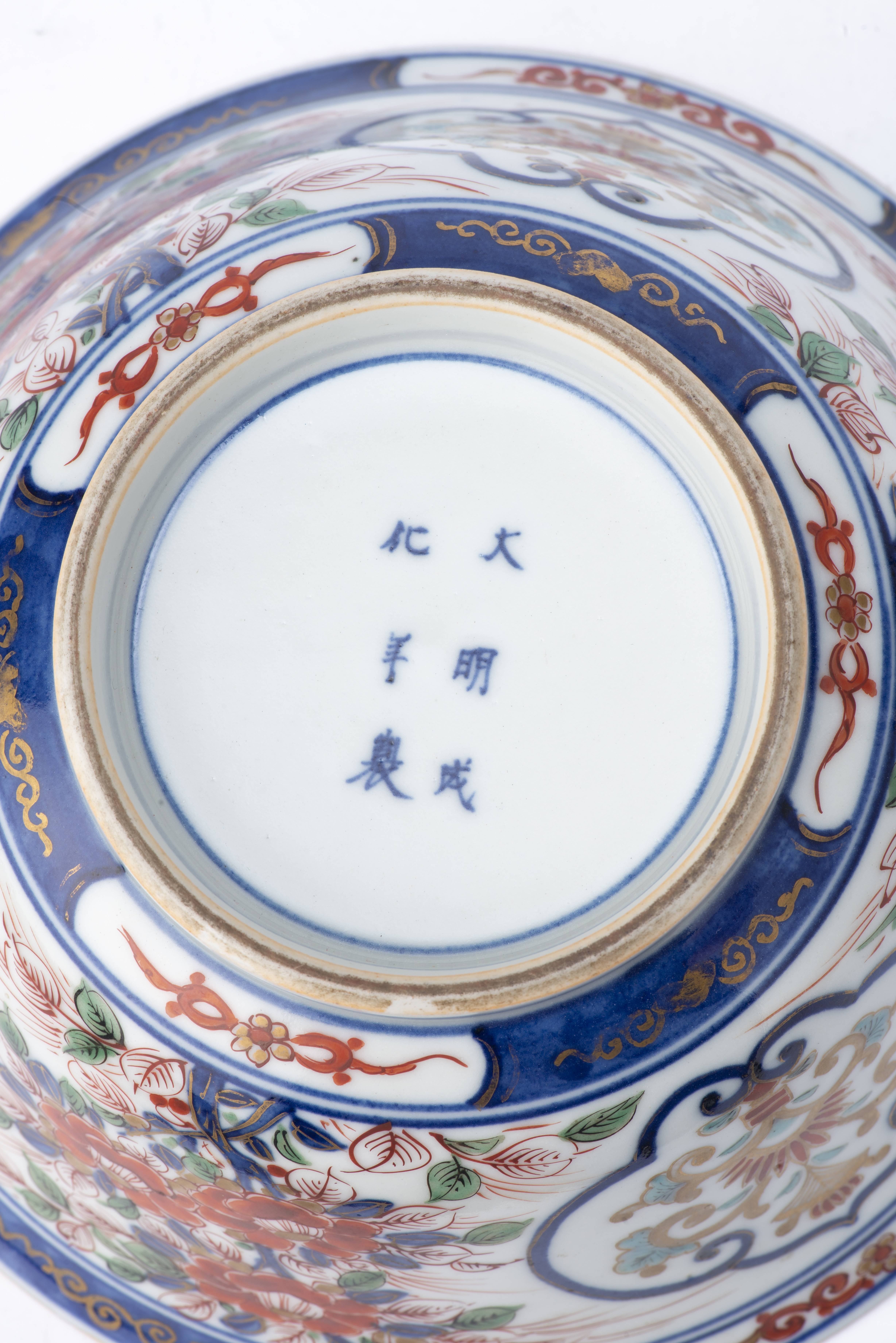 Bol en porcelaine de Chine Imari à décor floral rouge, cobalt, vert et or. Marque apocryphe à 6 caractères sous la base.