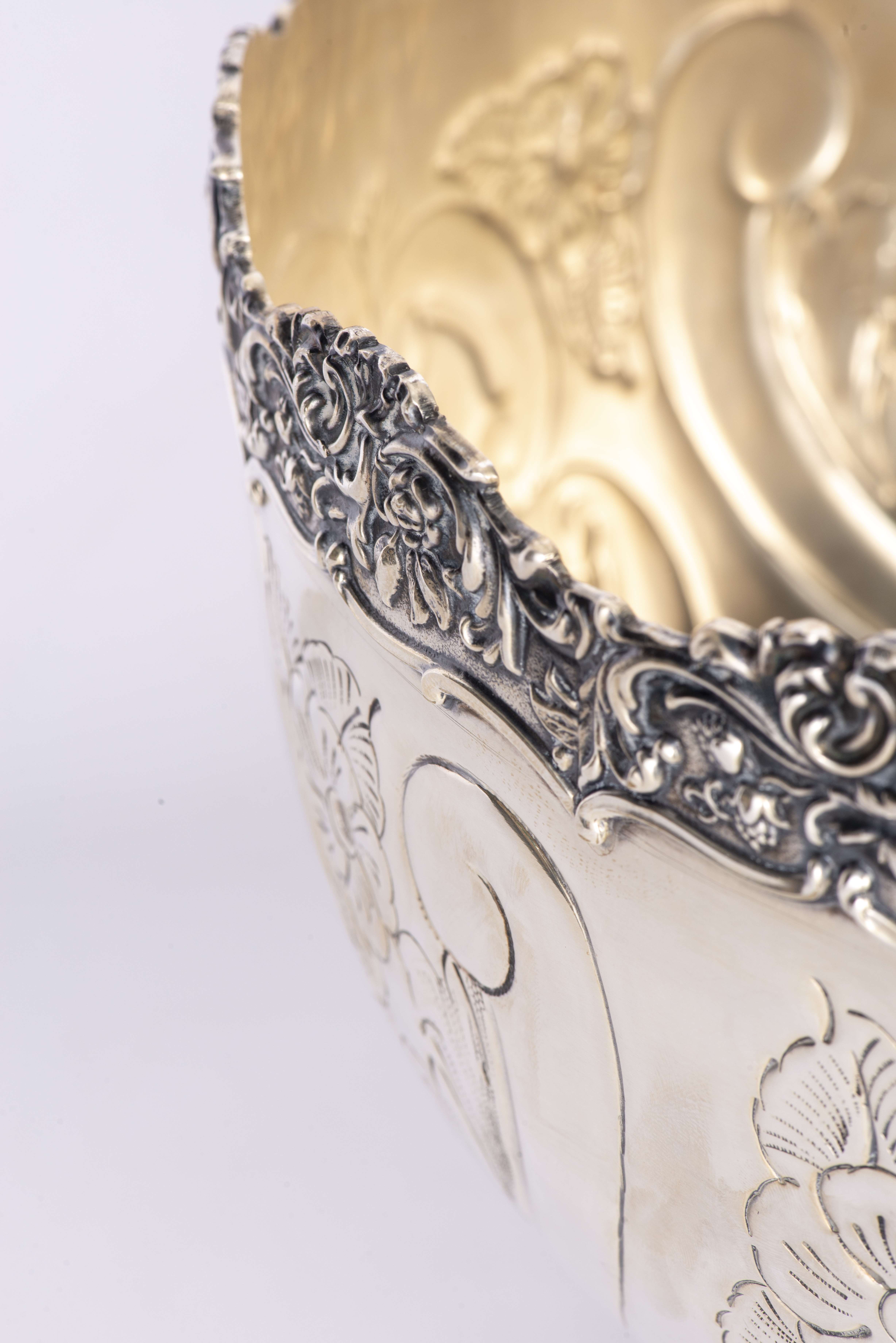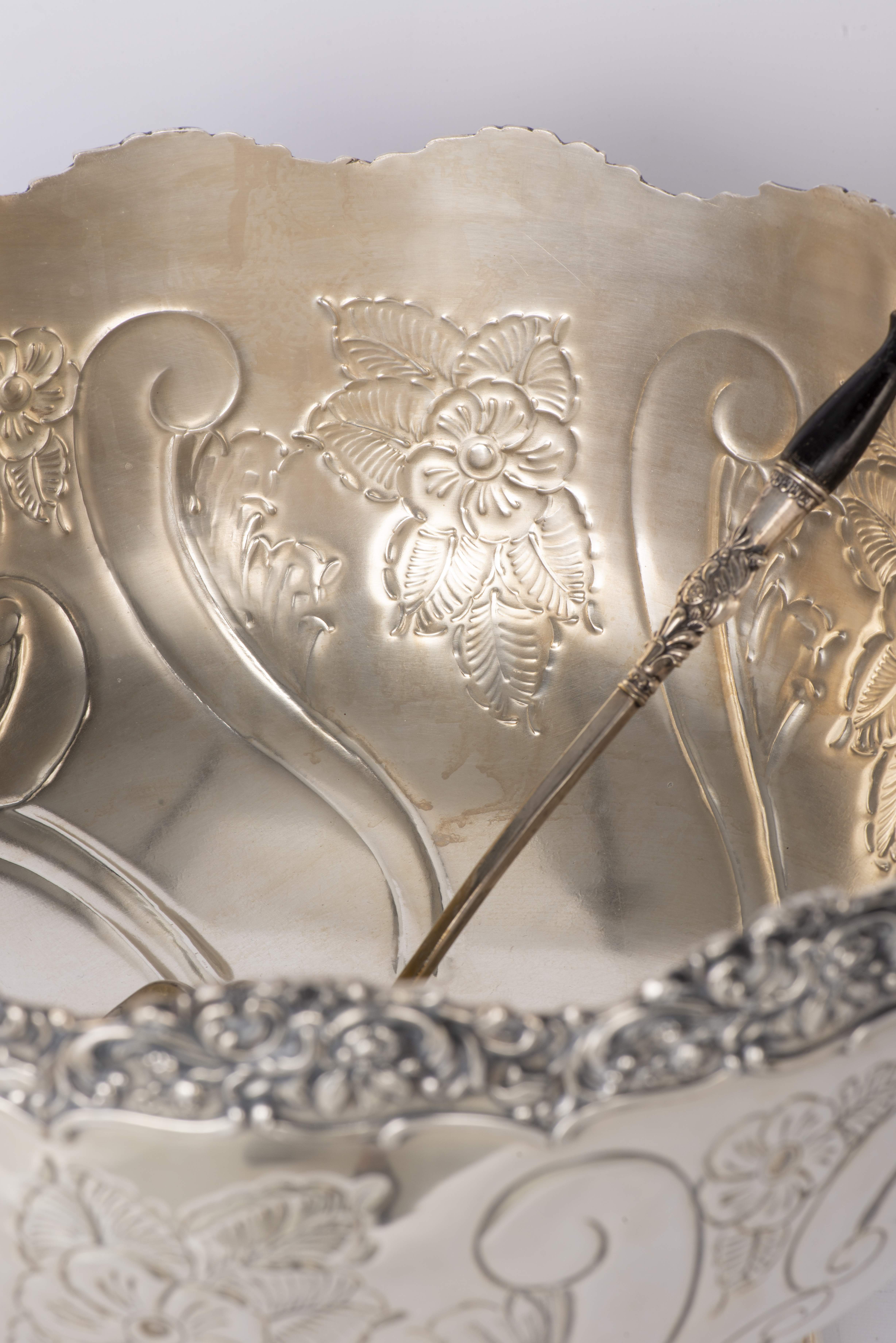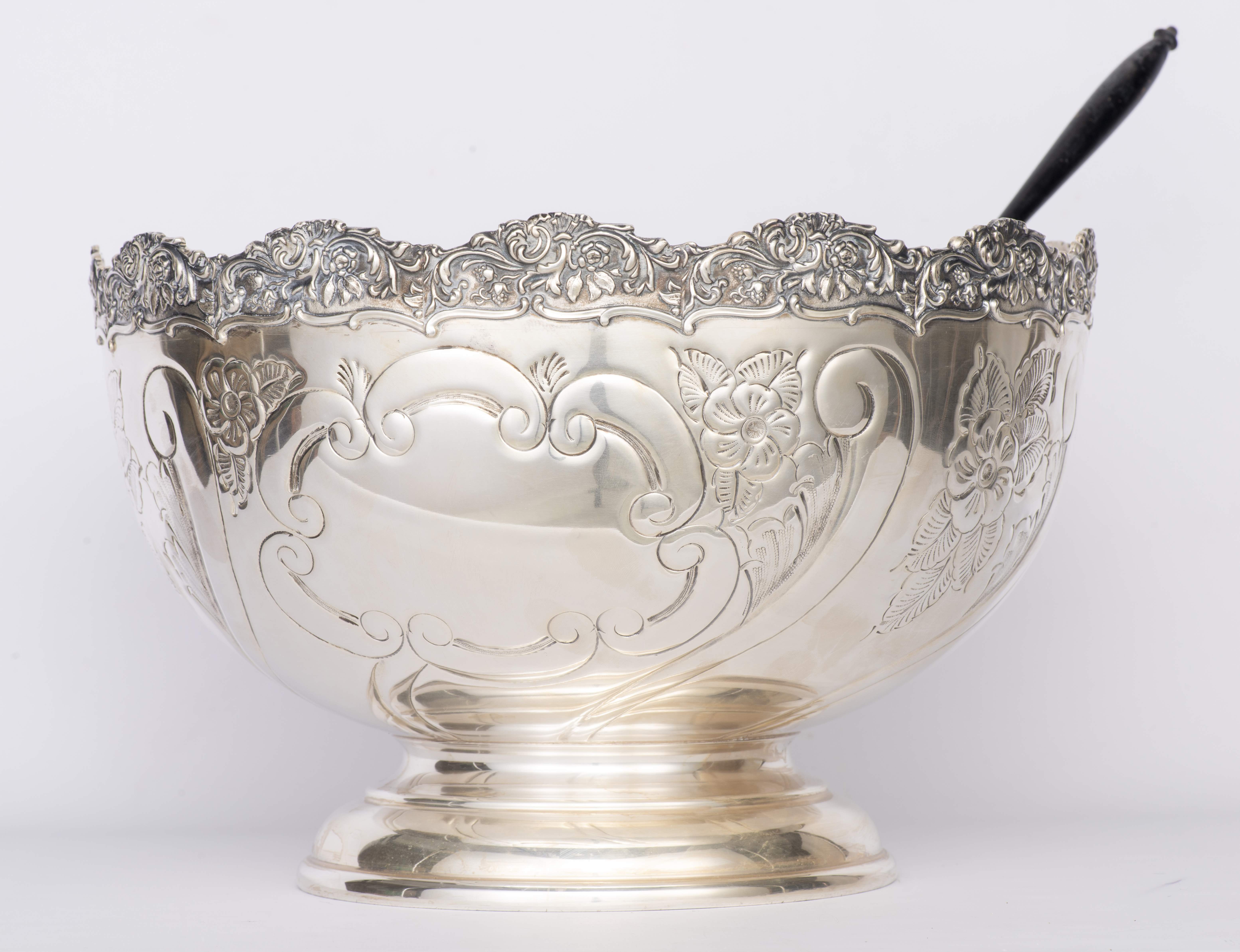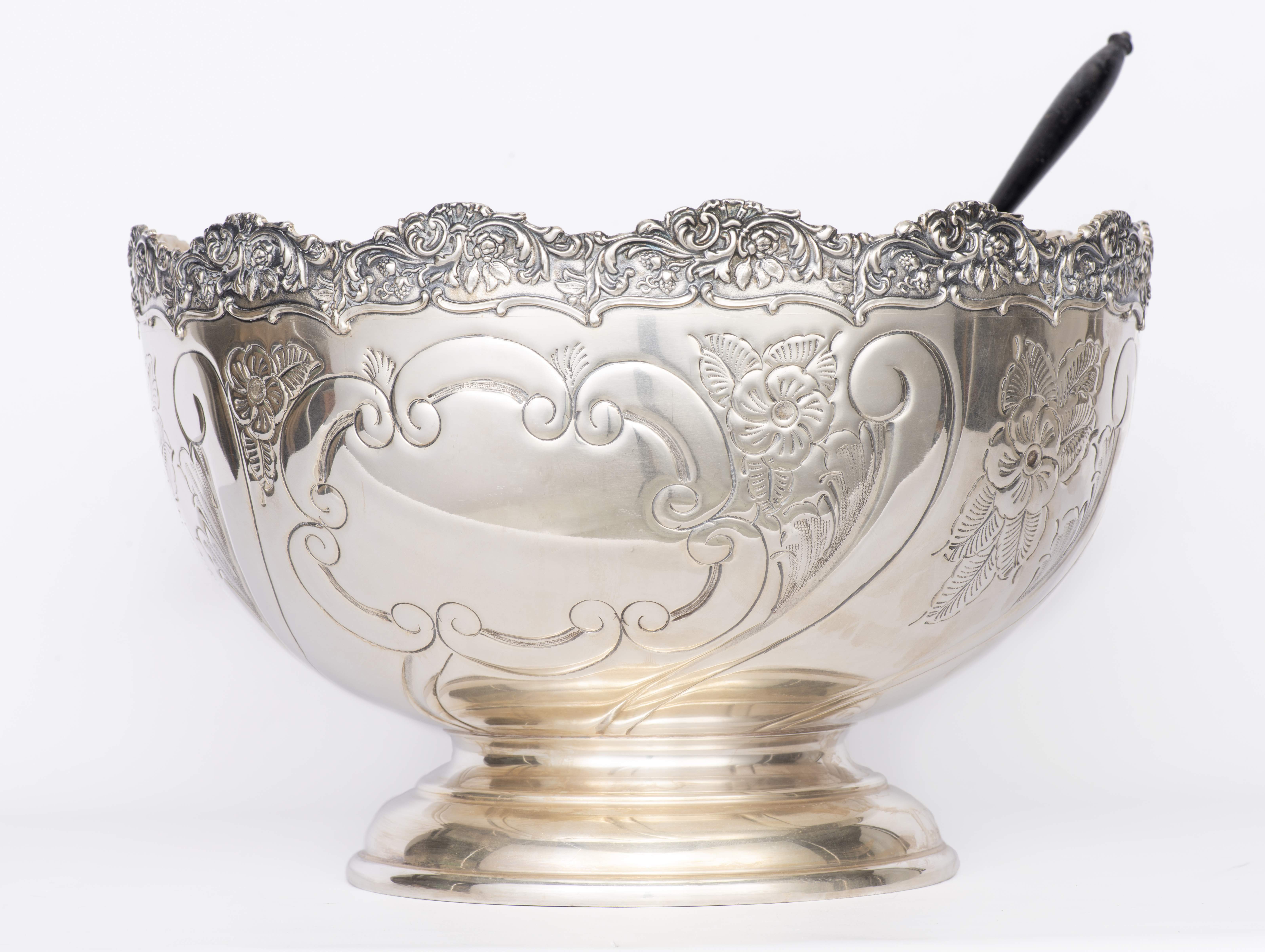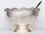 Bol à punch sur piédouche en métal argenté, bordure mouvementée, panse à décor de fleurs et feuillage, marque sous la base "Mounts Stamped From the Original "Boulton and Watt" Dies Circa 1774 reproduction of alde English Plate Hand Chased, Made in England.