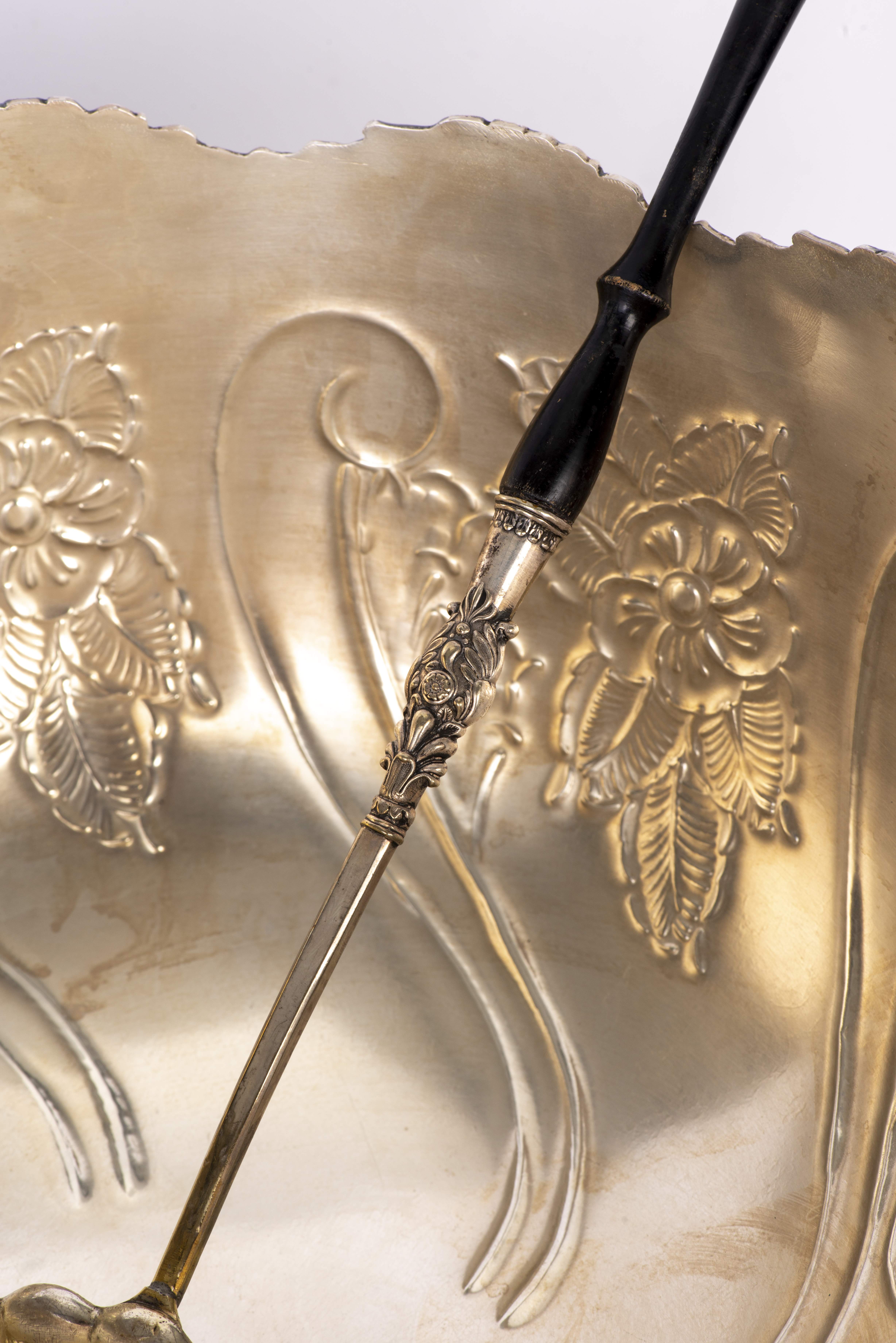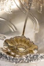 On y joint une louche à punch en métal argenté et manche en bois.
