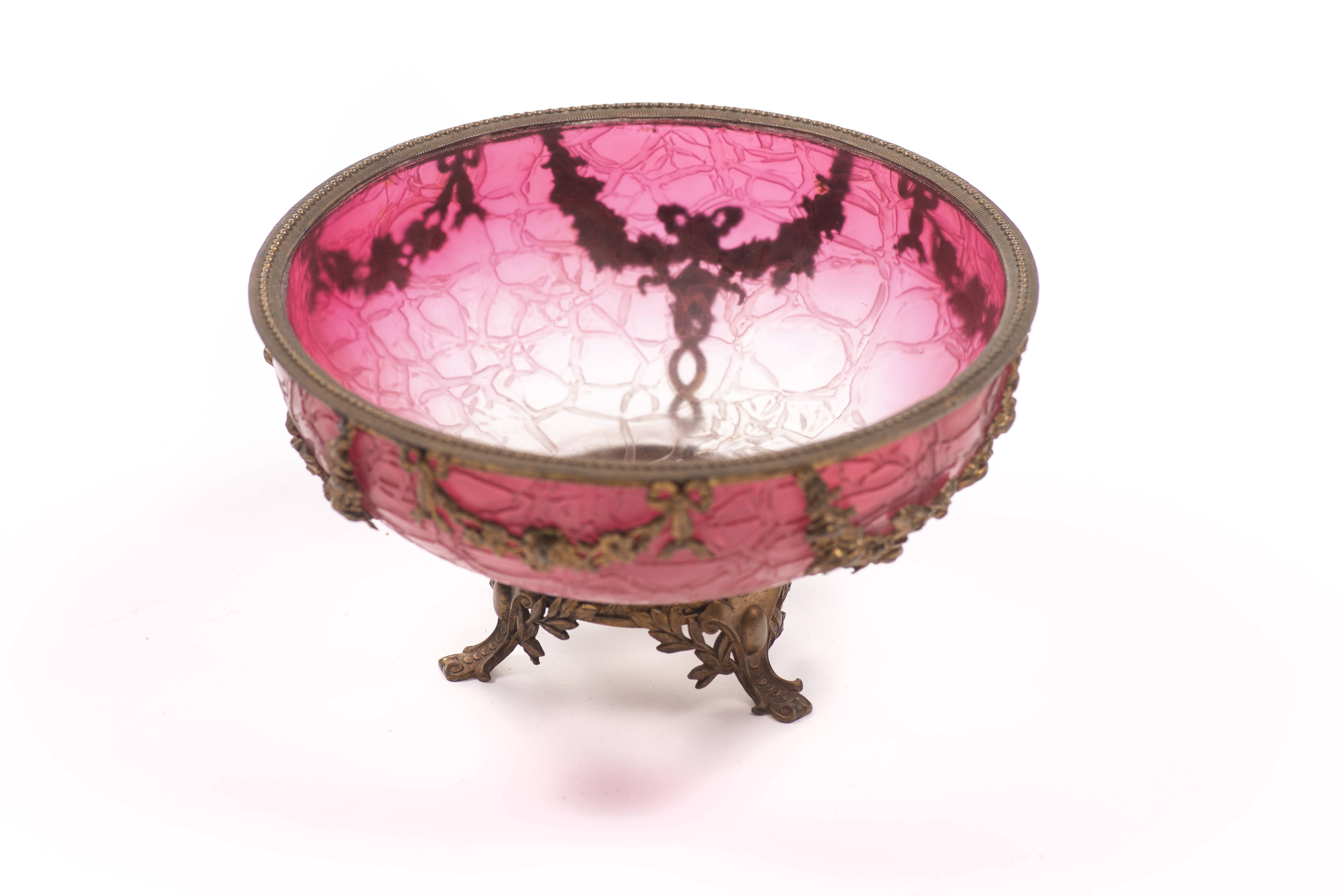 Bol sur pied en bronze de style Nap. III en verre dégradé rose et blanc à décor en creux de sillons désorganisés, cerclage et guirlandes en bronze à décor de roses et de rubans sur le pourtour.