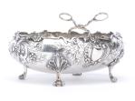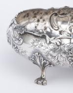 Bonbonnière en argent français 1er titre sur 4 pieds et marli à décor végétal en repoussé.