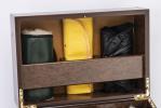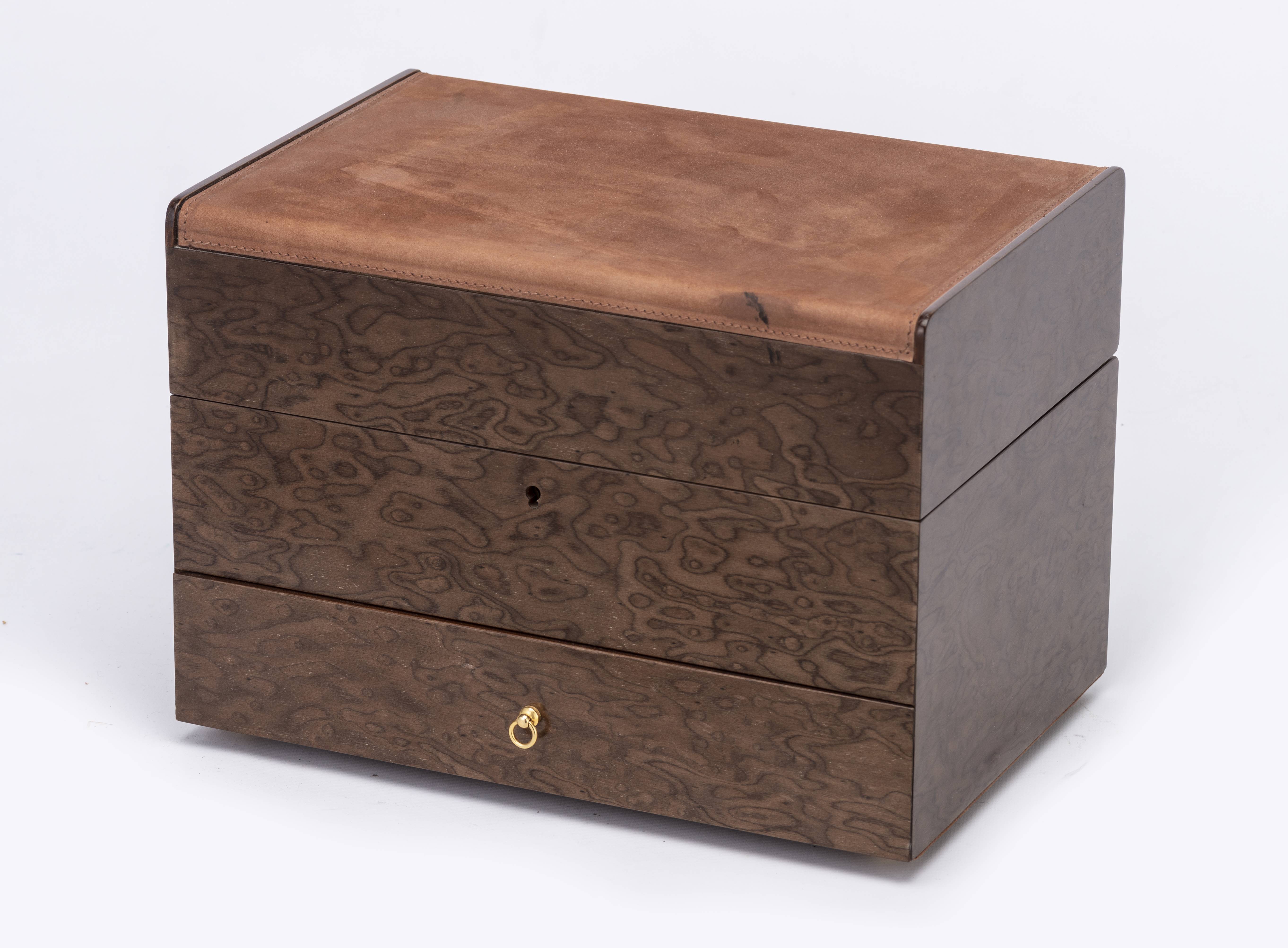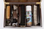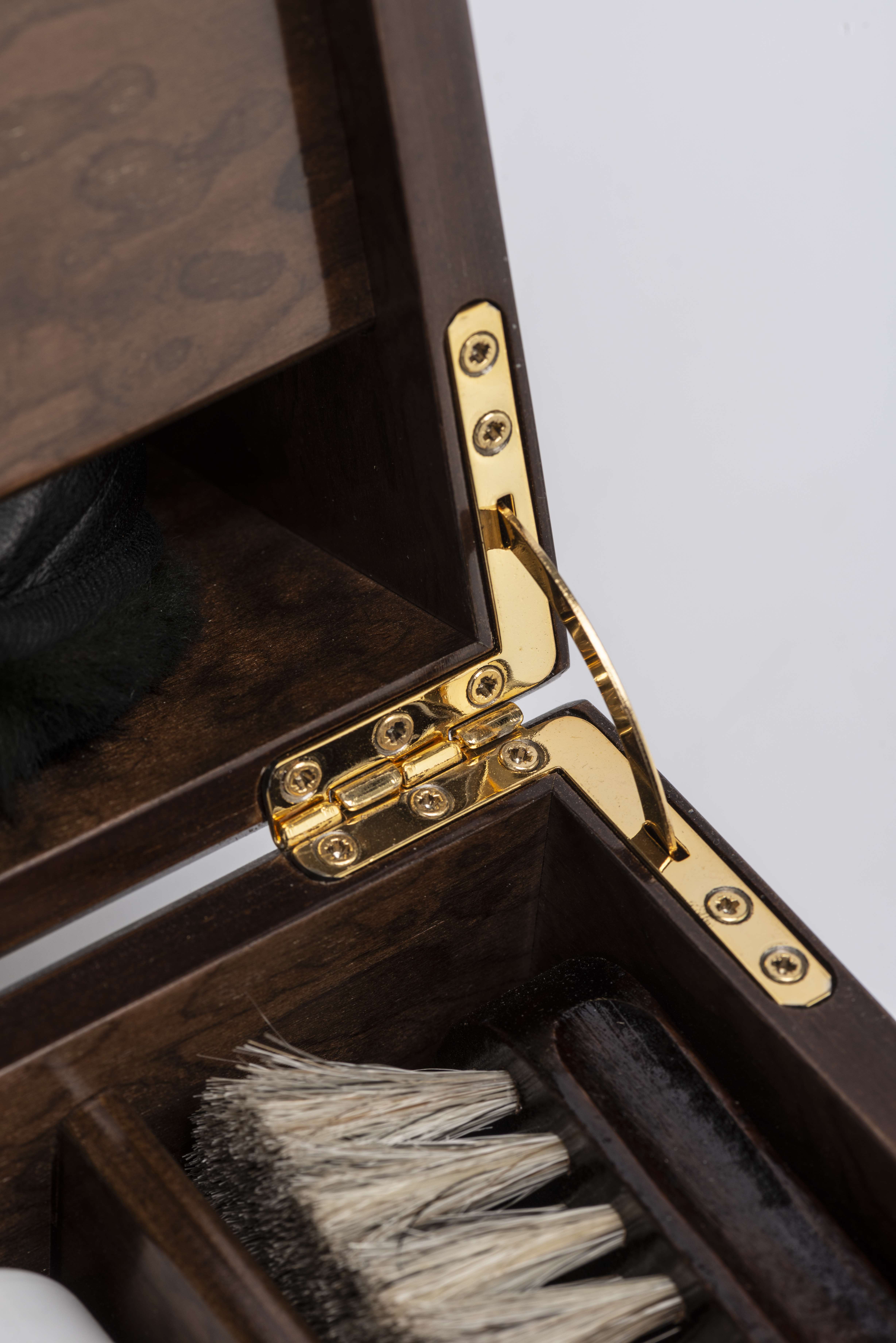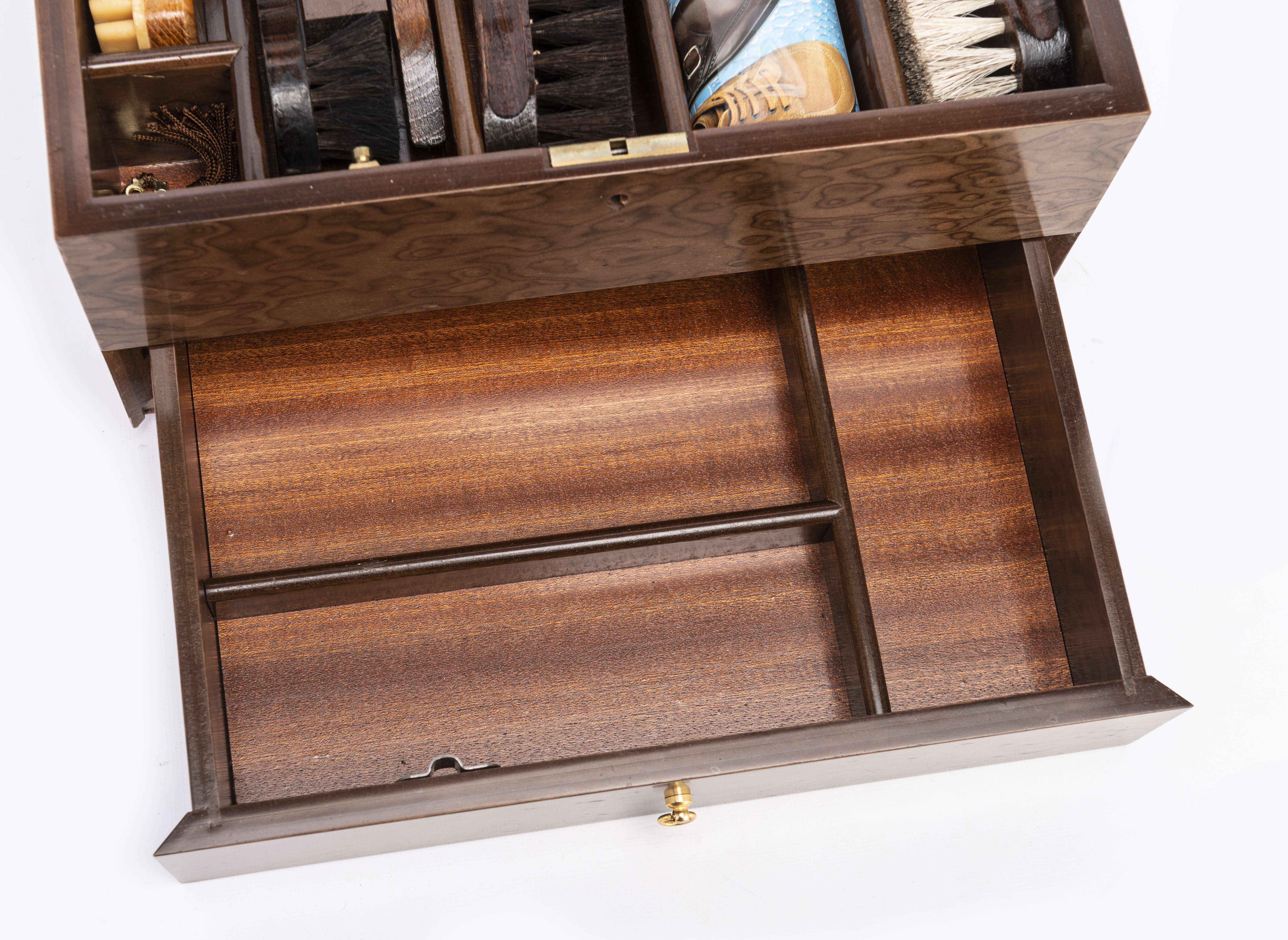 Boîte en plaquage de bois imitant la loupe à un tiroir avec couvercle pour y ranger les brosses à chaussure et divers cirages.
