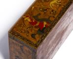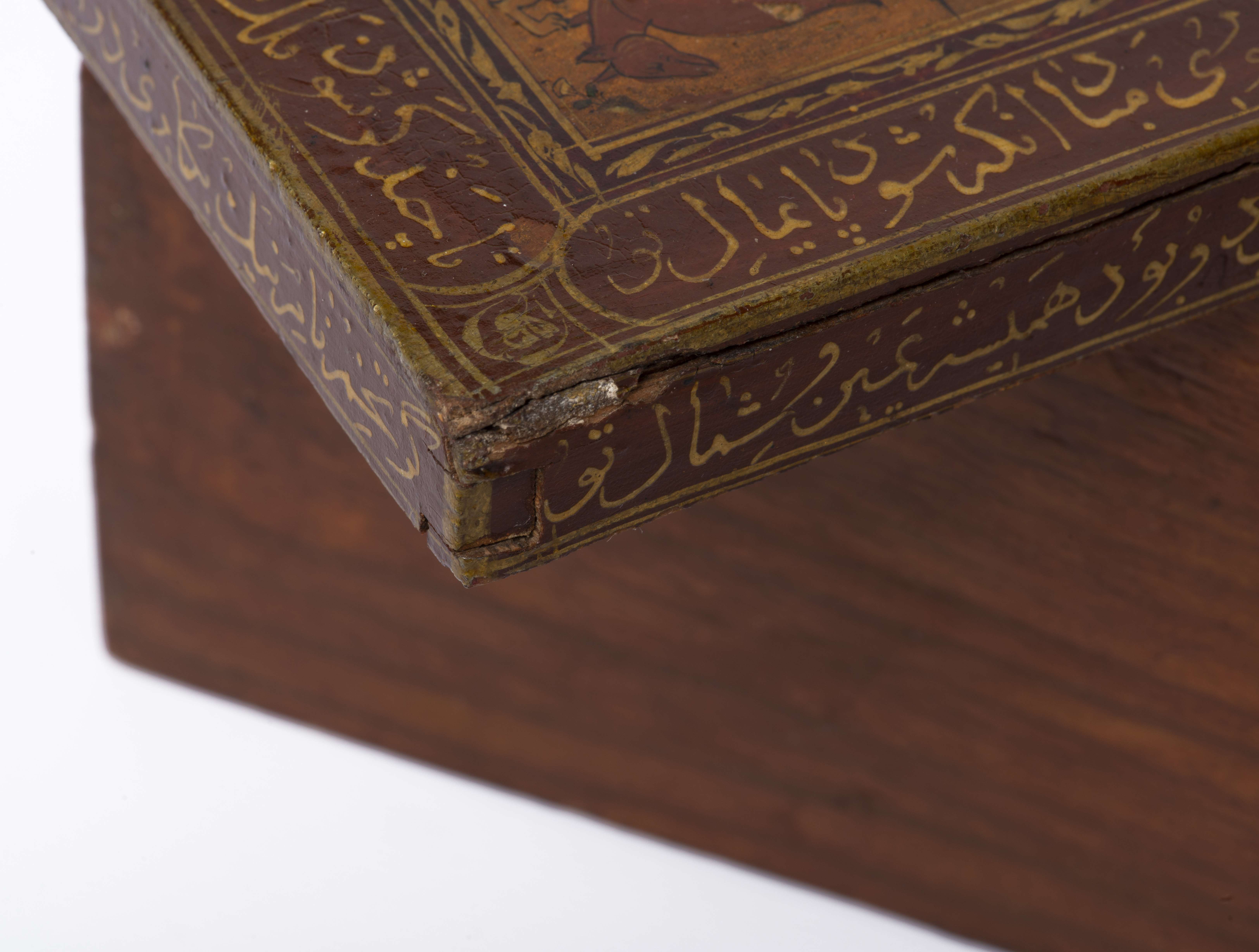 Boîte en bois iranienne peinte à décor Quajar de scène de chasse, pourtour à frise à versets persans, fin XIXe.