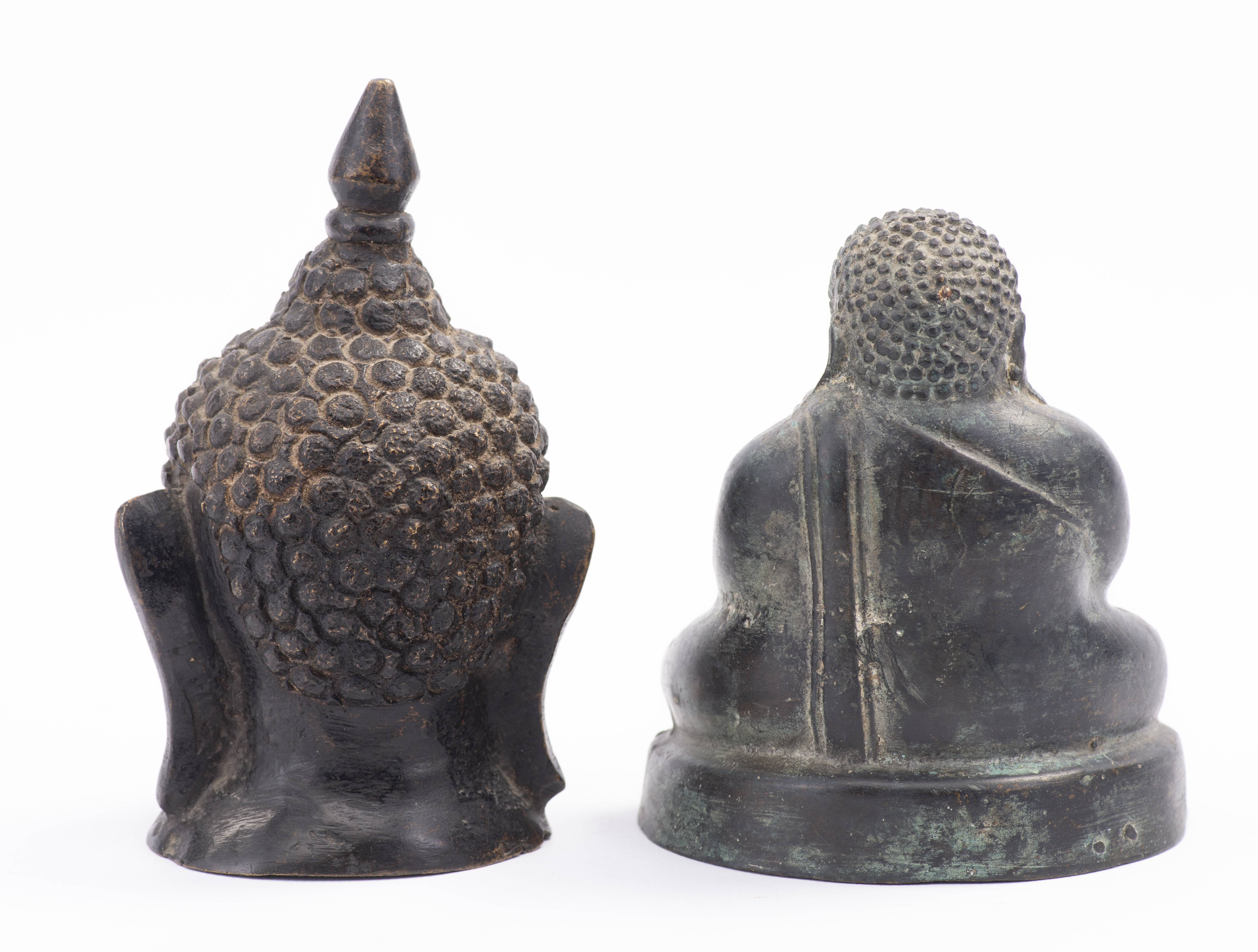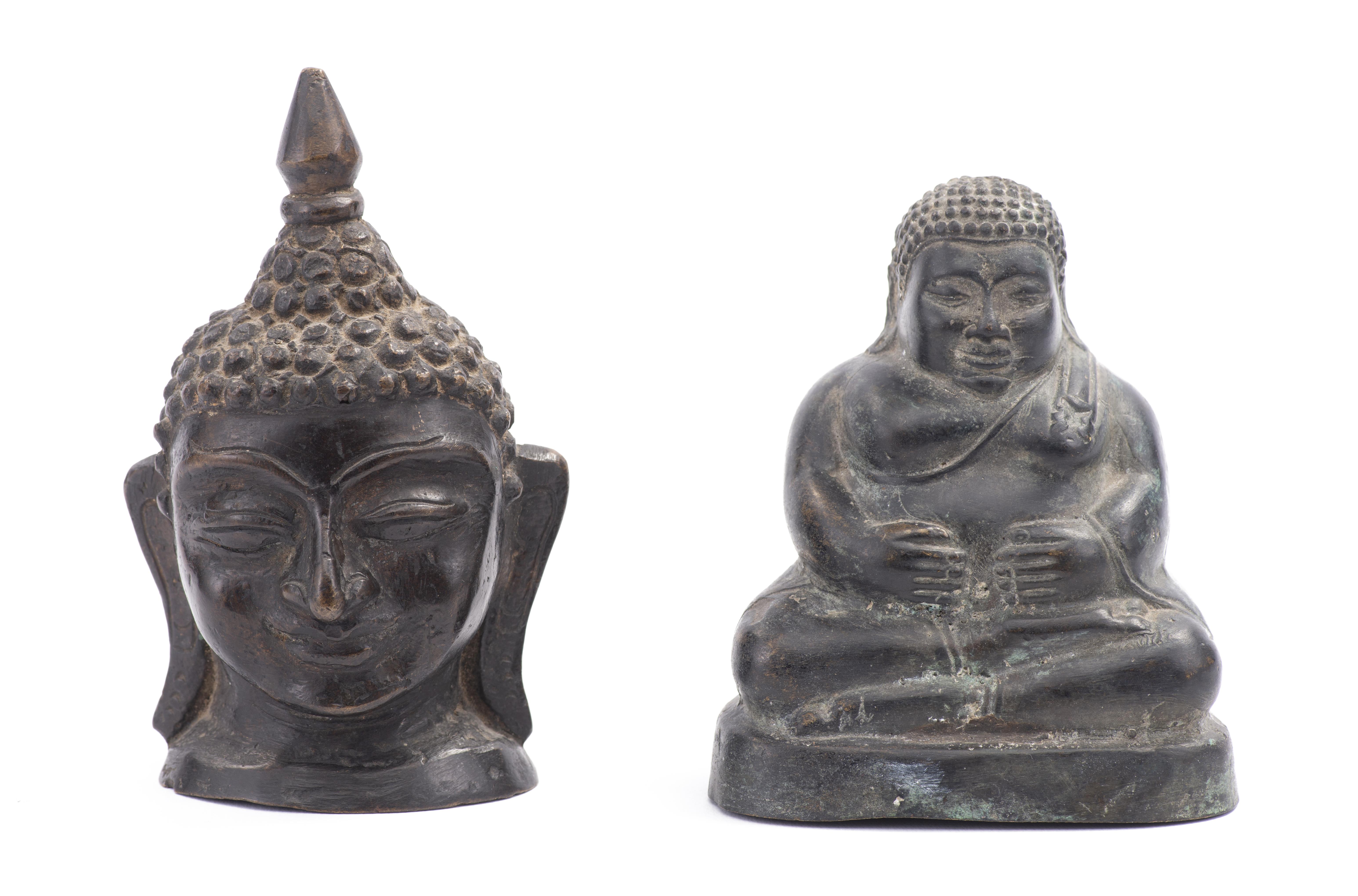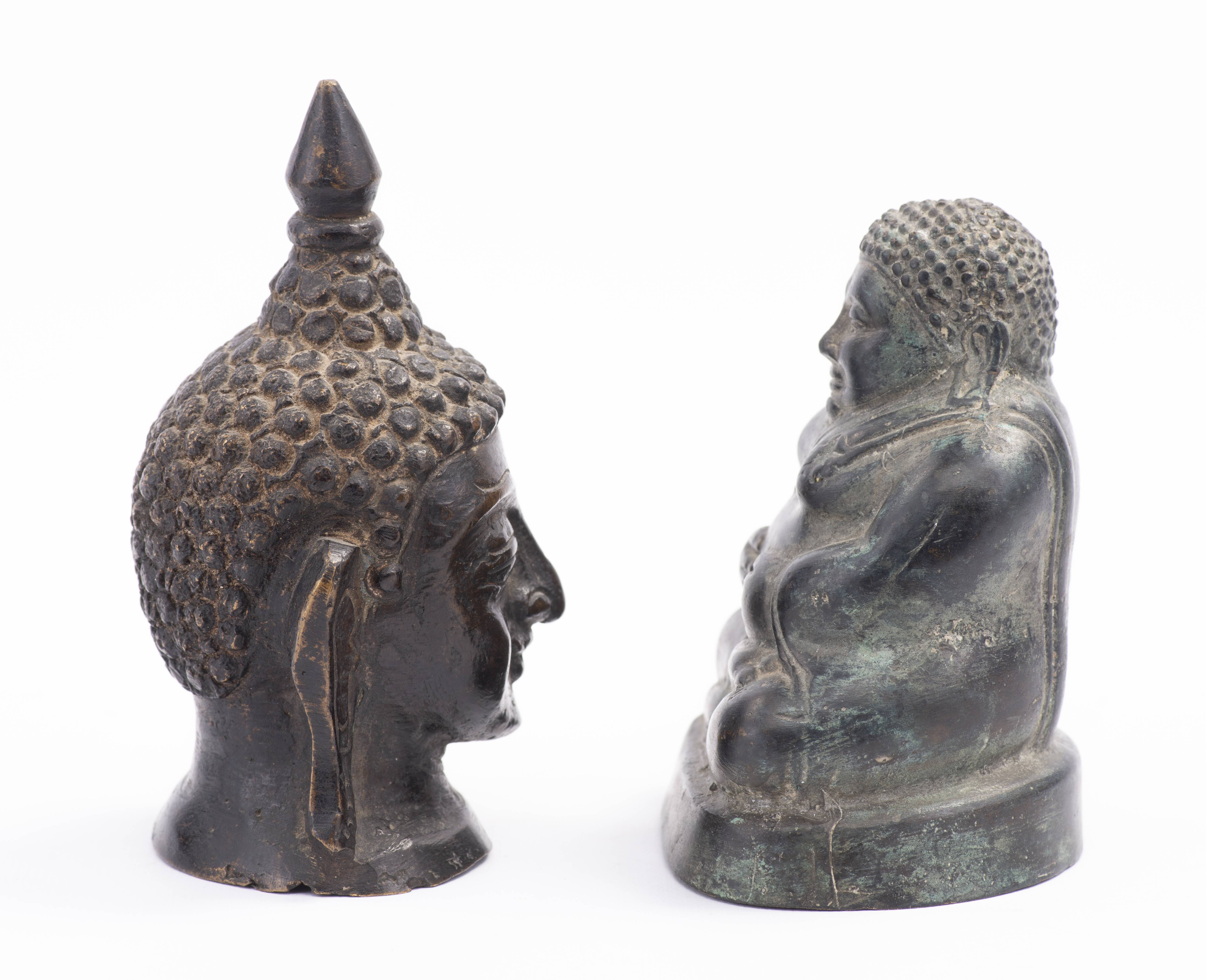Boudai assis et tête de Bouddha en bronze. Birmanie
