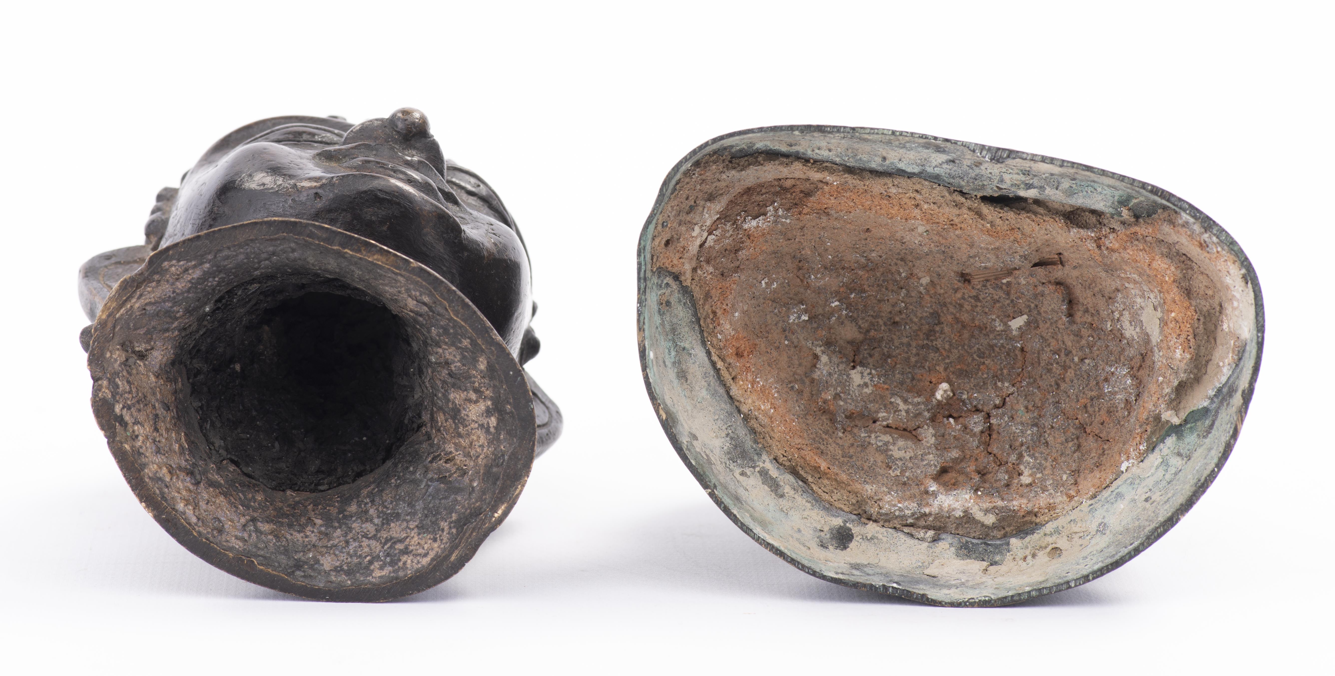 On y joint une tête de Bouddha (Buddha) en bronze de Birmanie à patine brune.