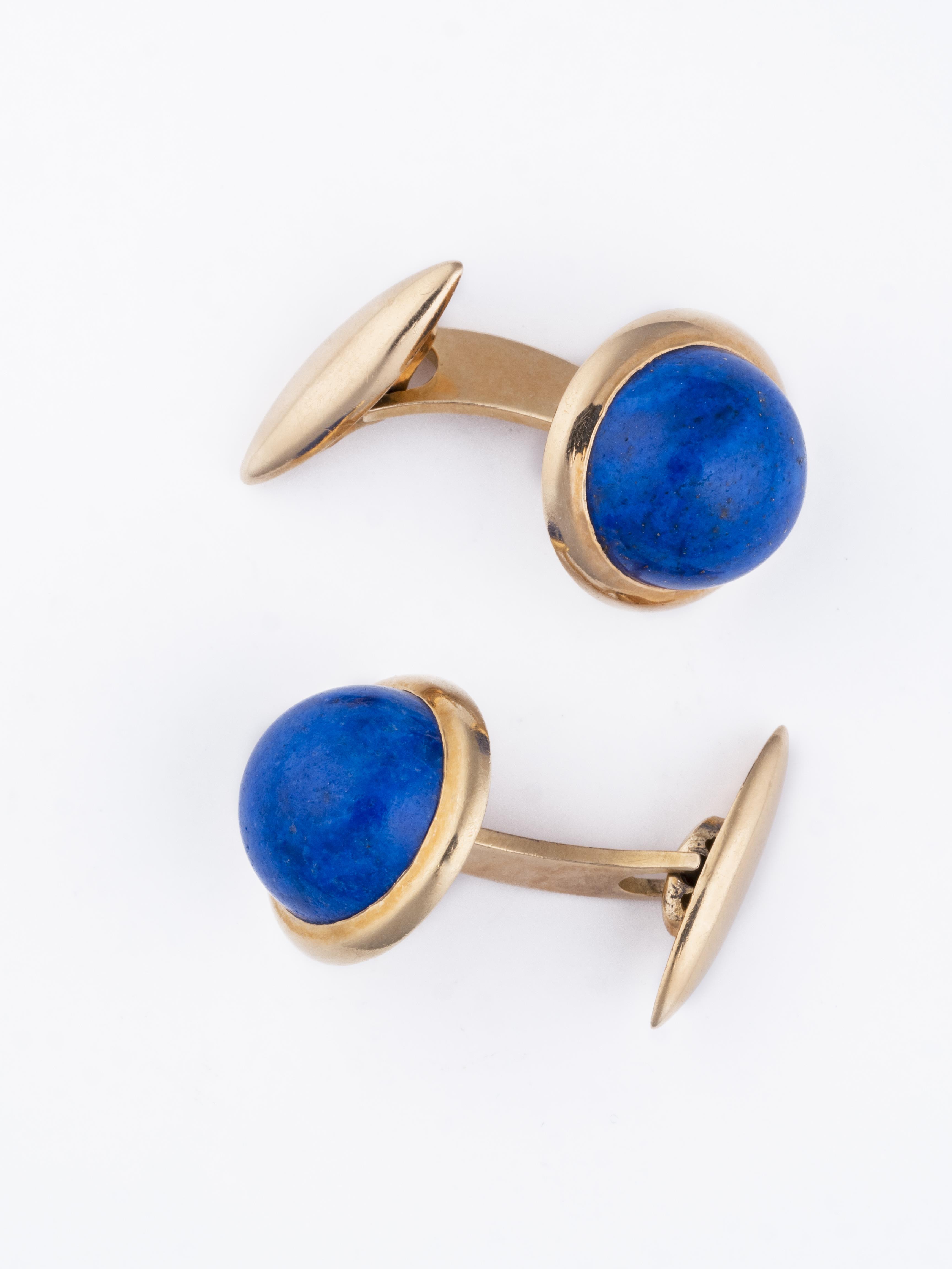 Paire de boutons de manchettes en or jaune .750 avec demi-boule de lapis poli.