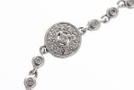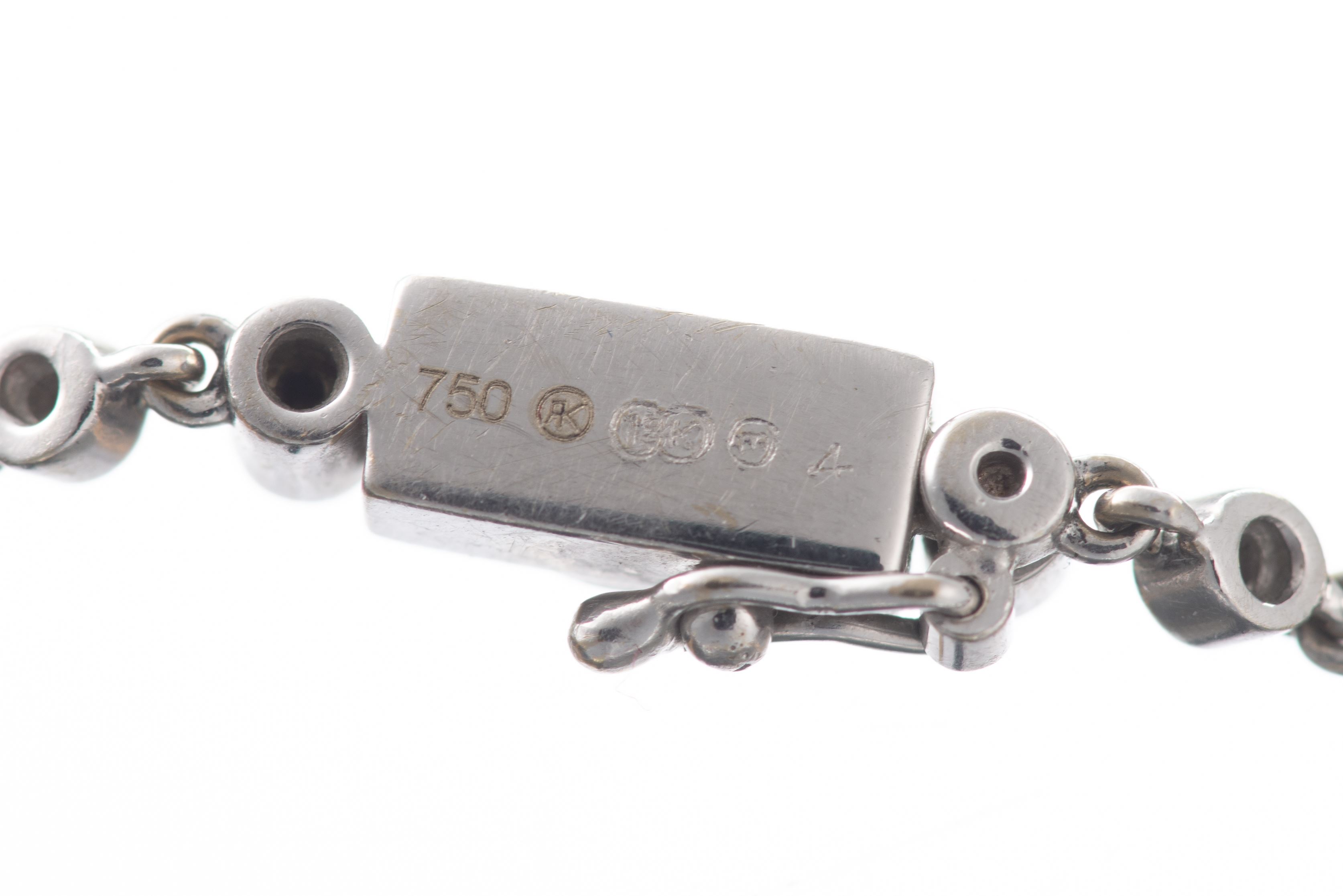 Bracelet rivière en or gris .750 serti de 90 diamants de taille brillant pour un total de 0.51 ct coul H. Décor de 4 motifs en forme de disque et 4 éléments en forme de goutte.