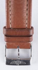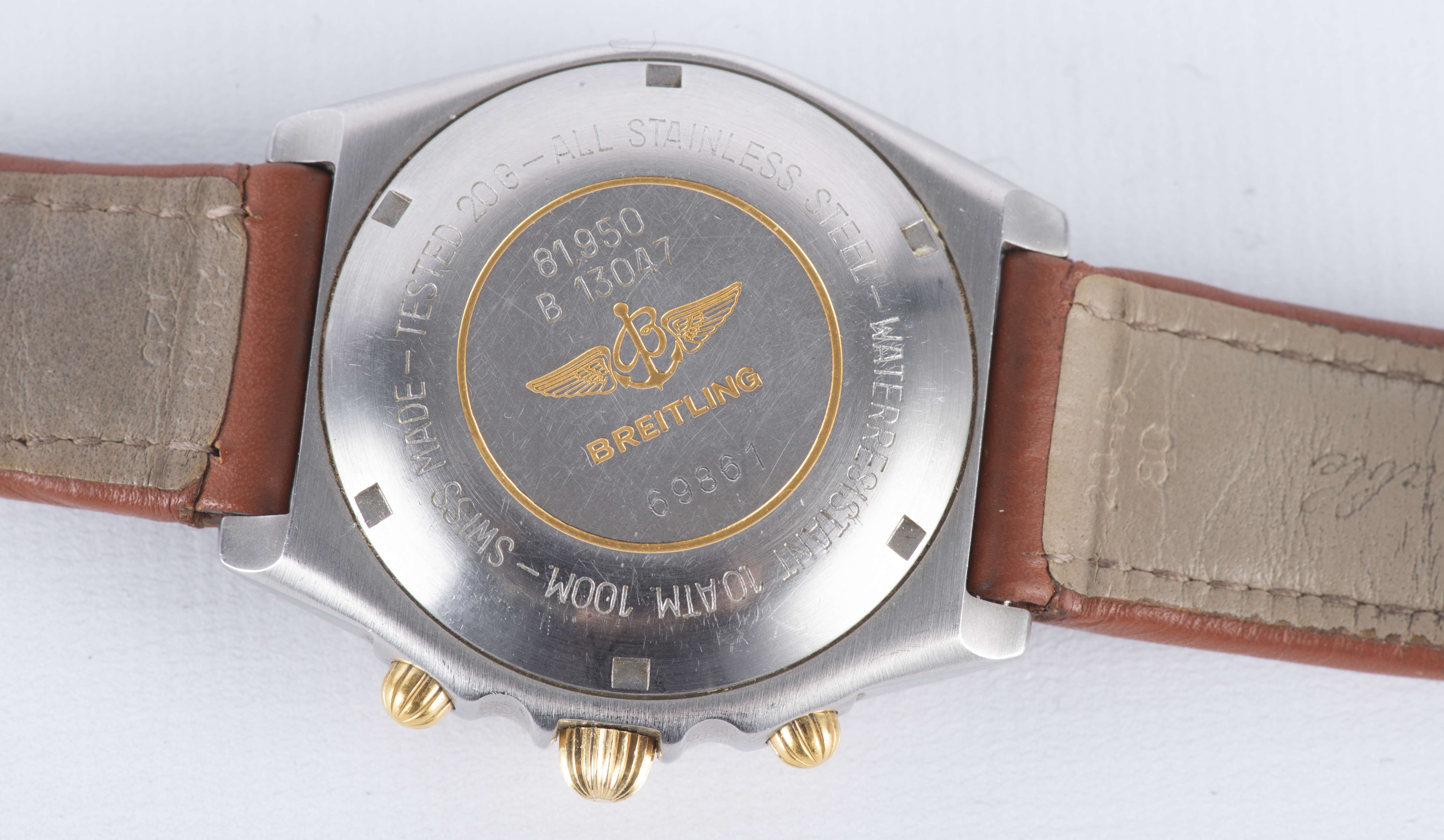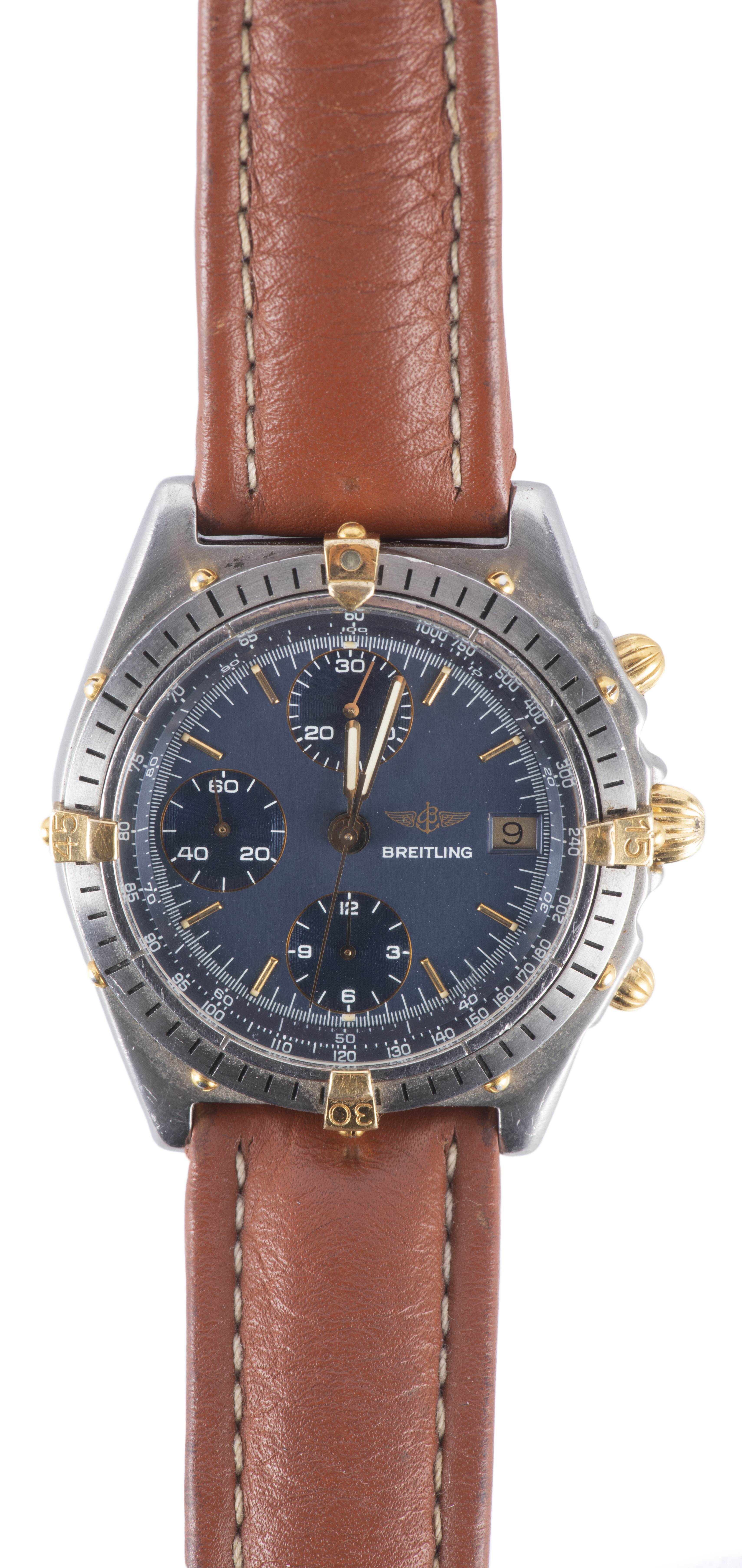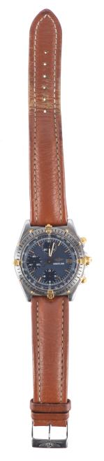 Breitling B 13047 montre-bracelet homme automatique en acier à trois compteurs pour le chronographe et une date à guichet, un cadran bleu foncé, fond vissé et lunette tournante graduée avec index et vis en or et index bâton appliqués en or, bracelet cuir Breitling d'origine avec boucle au logo Breitling, mvt suisse Cal. Valjoux 7750 automatique, Tested 20G. Waterresistant 10 ATM 100m.