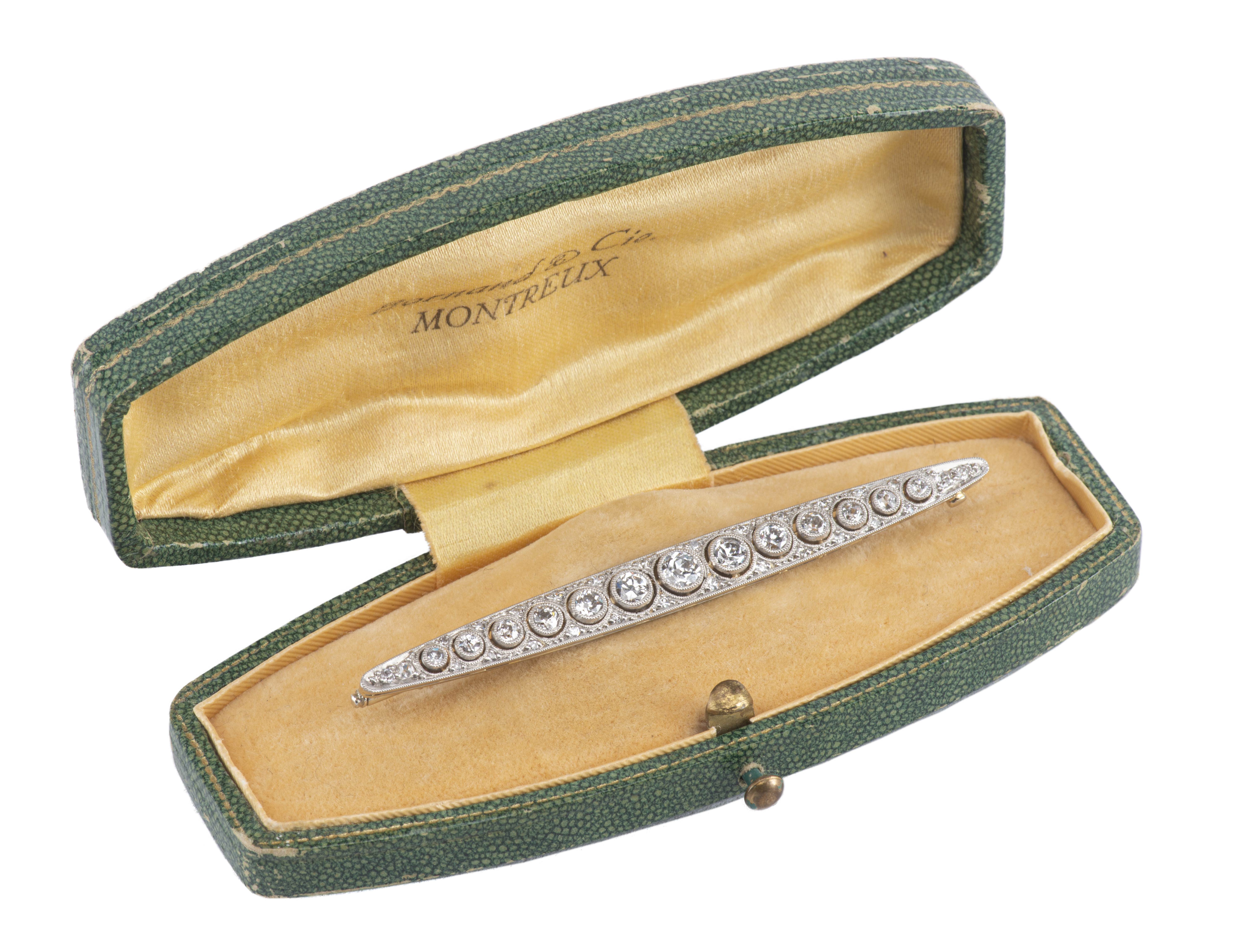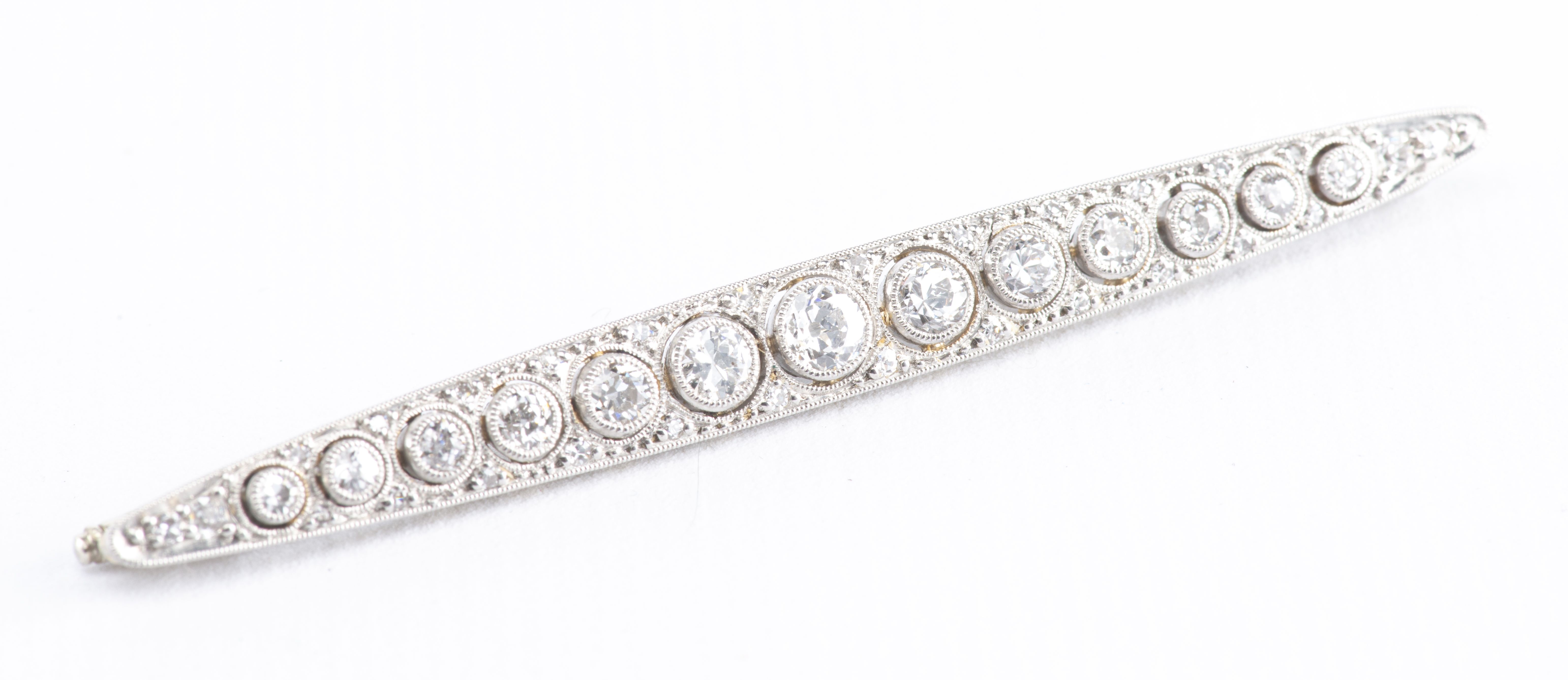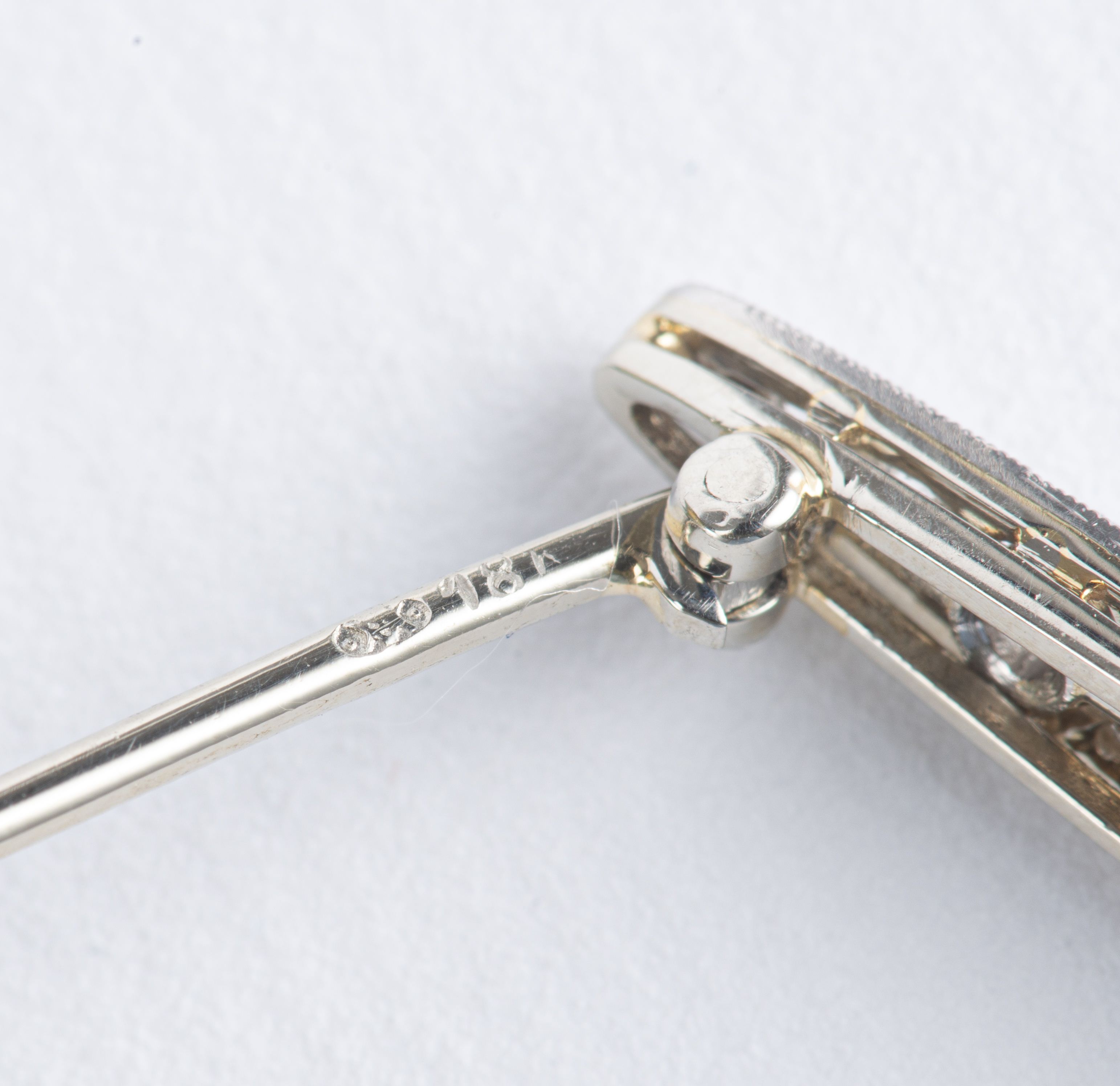 Broche baguette de style Art déco en en or gris .750 avec 35 diamants de taille ancienne pour un poids total de 0.60 ct.