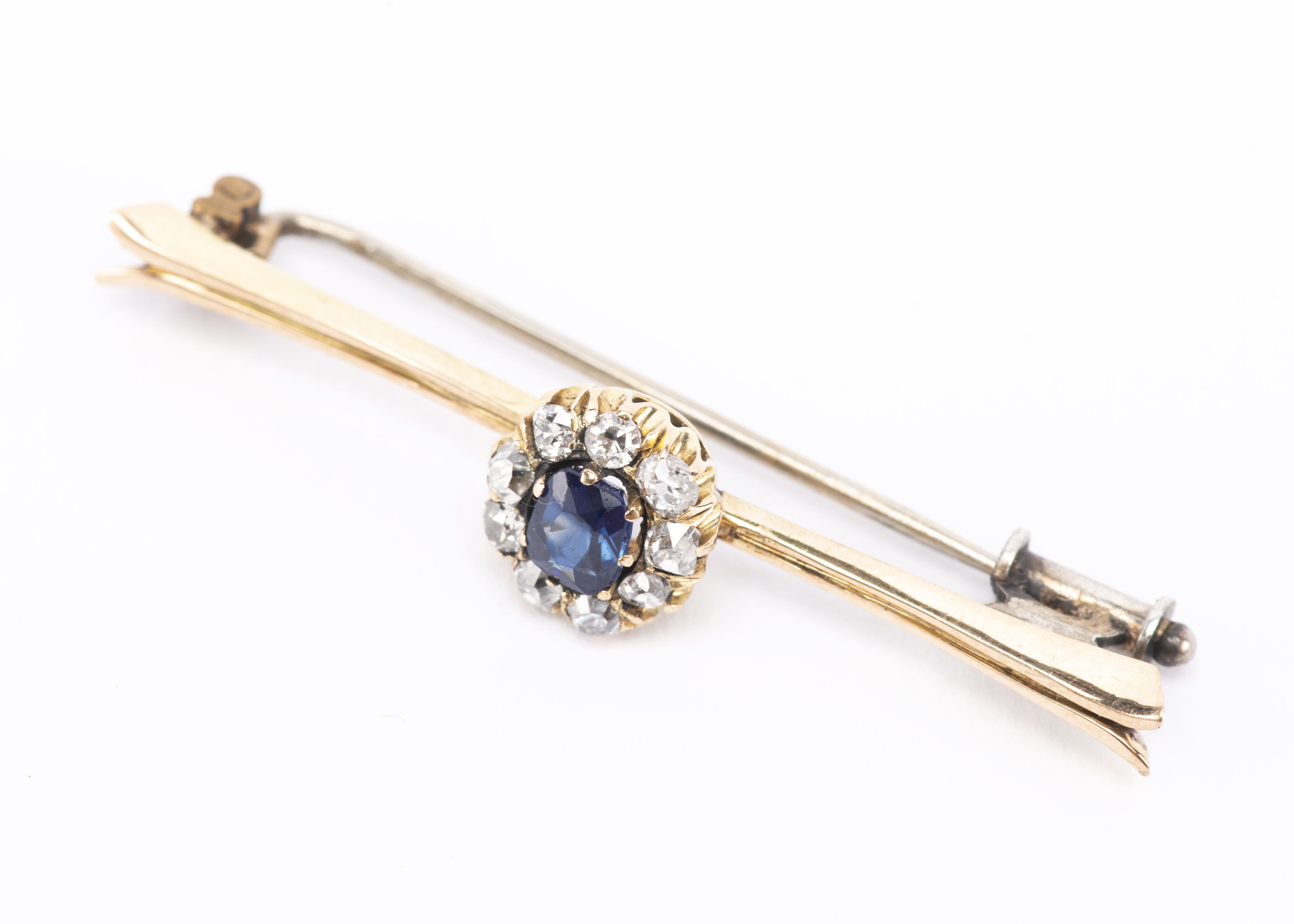 Broche en or jaune .585 avec un saphir bleu de 0.60 ct et 9 brillants de taille ancienne pour un total de 0.30 ct.