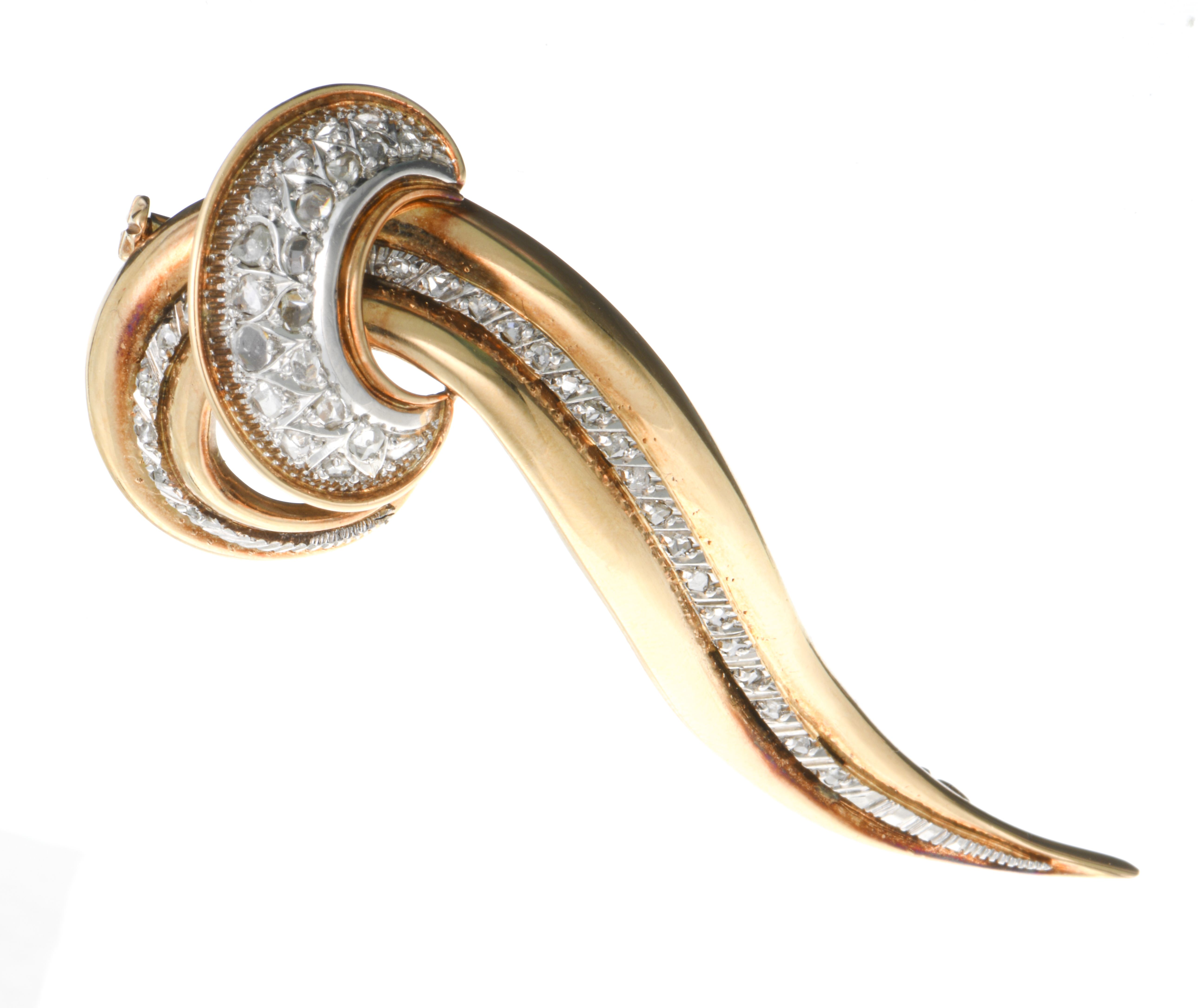 Broche mouvementée flamme en or rose et or gris .750 sertie de 38 diamants de taille rose pour un total de 0.50 ct.
