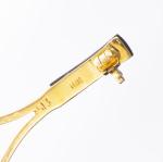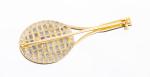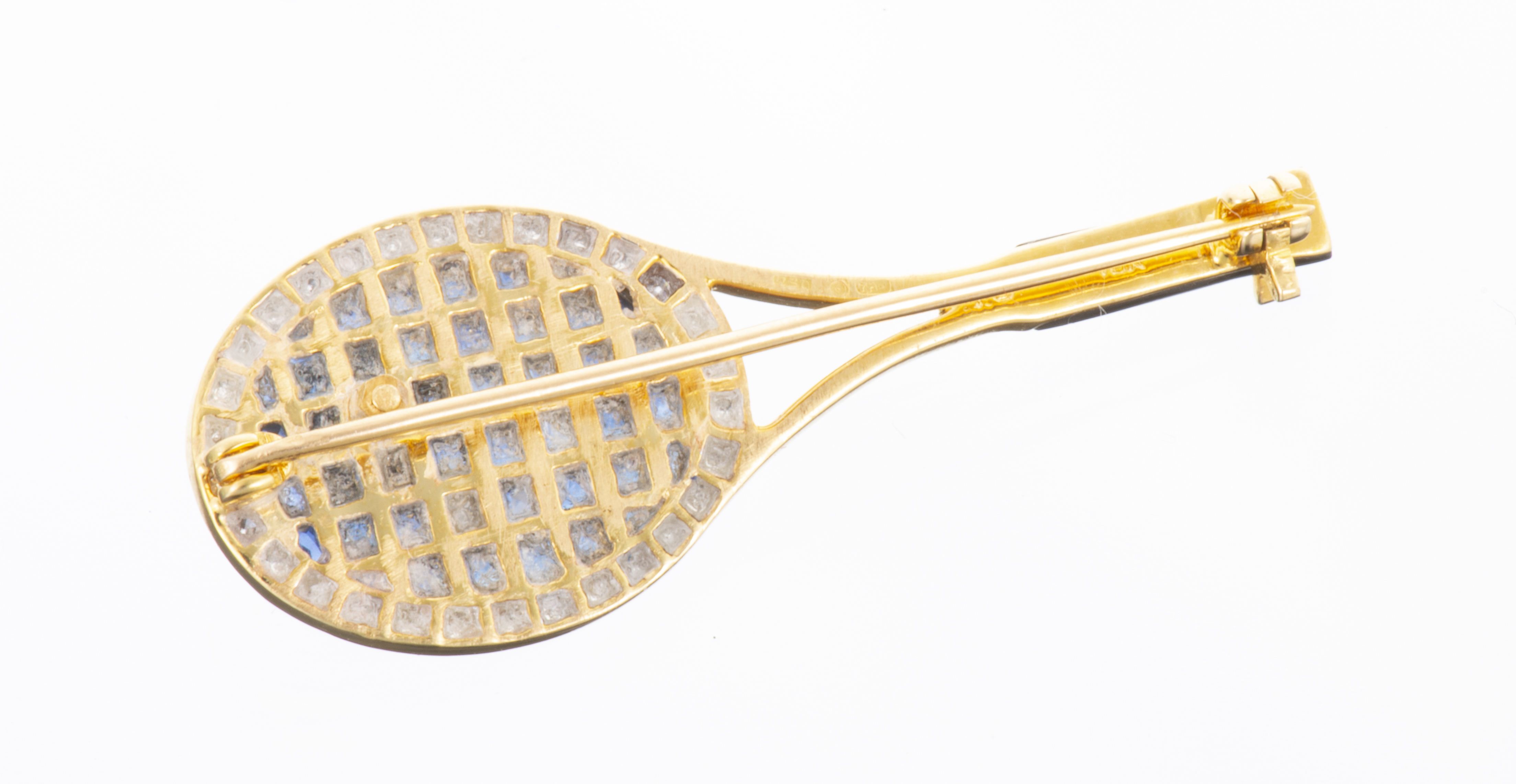 Elégante broche "Raquette" en or .750 rhodié à 34 diamants, filet en pavage de 40 saphirs sertis invisible et balle à 17 diamants, manche en onyx.