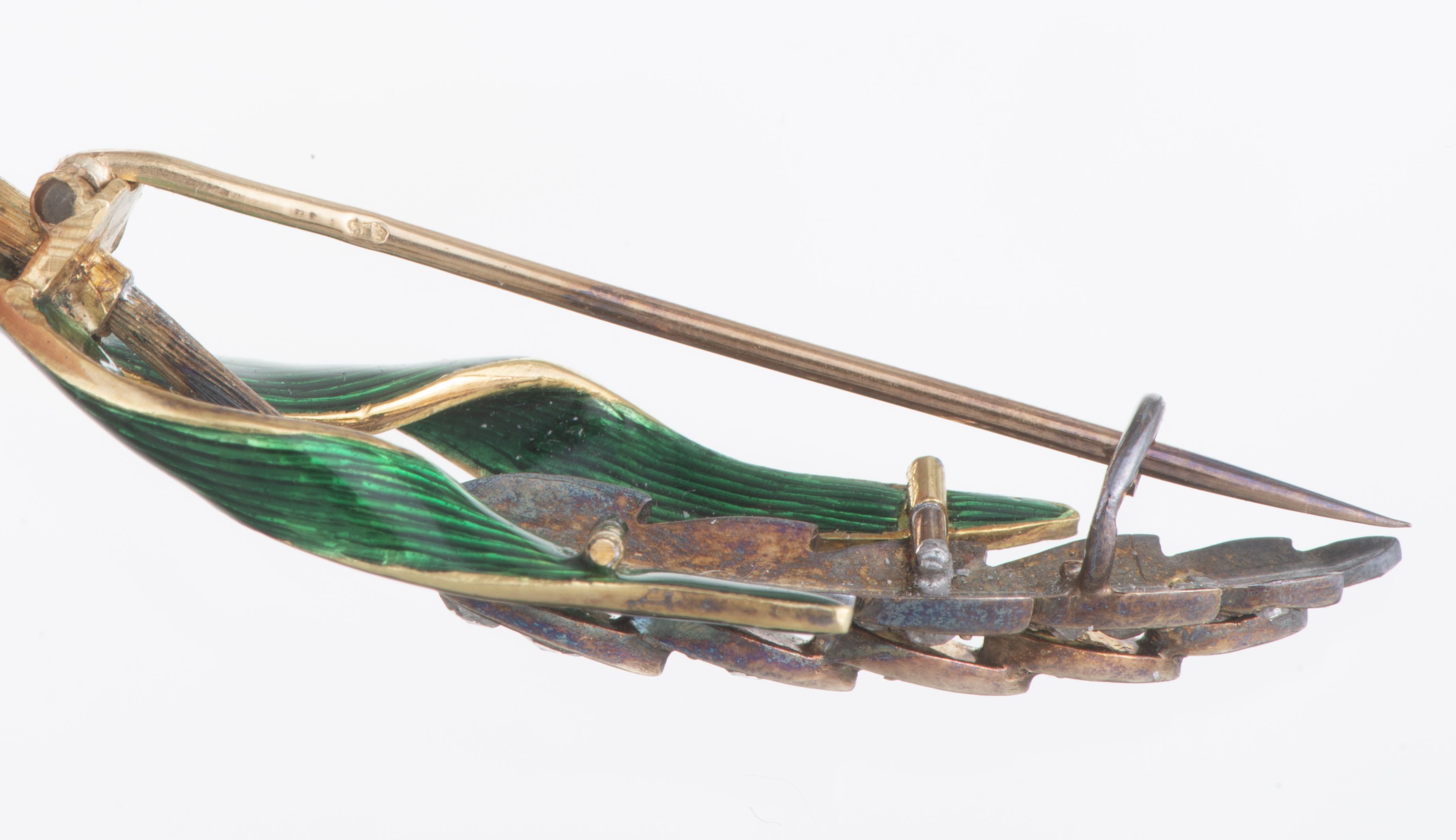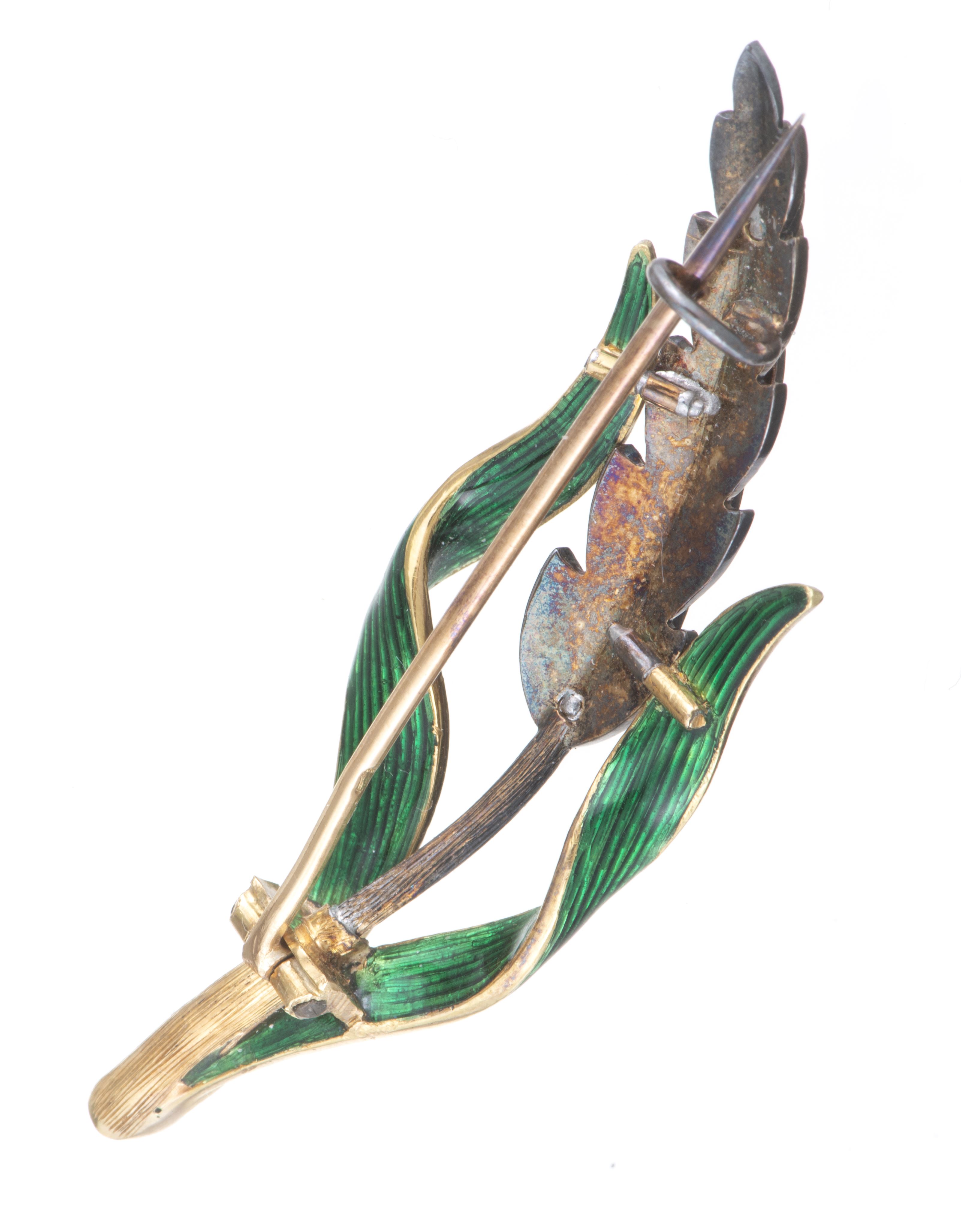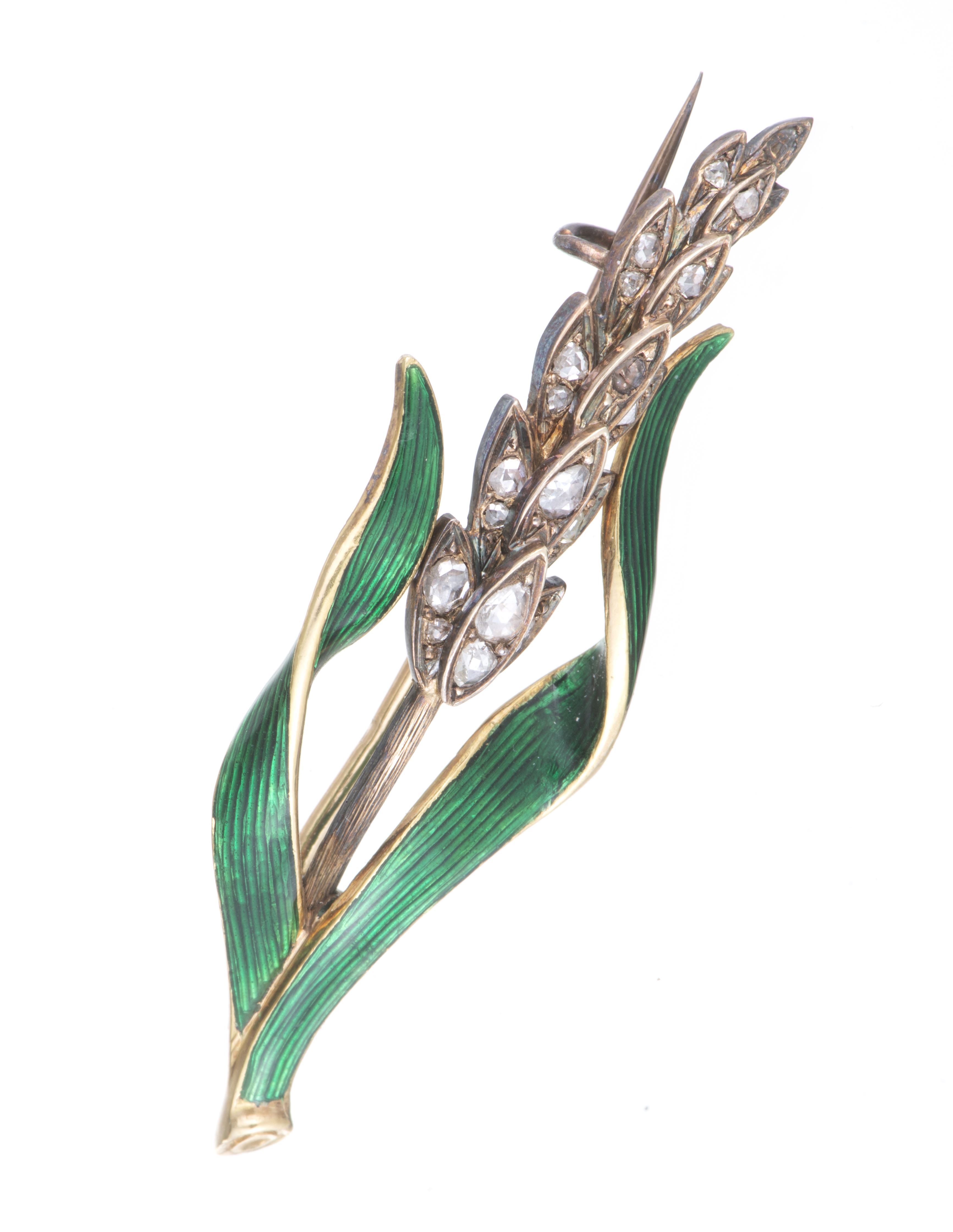 Broche victorienne émaillée en or et argent en forme de d'épi de blé sertie de 21 diamants de taille rose.