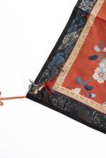 Broderie en soie de Chine à décor de lotus et papillons sur champ rouge, fin des Qing.