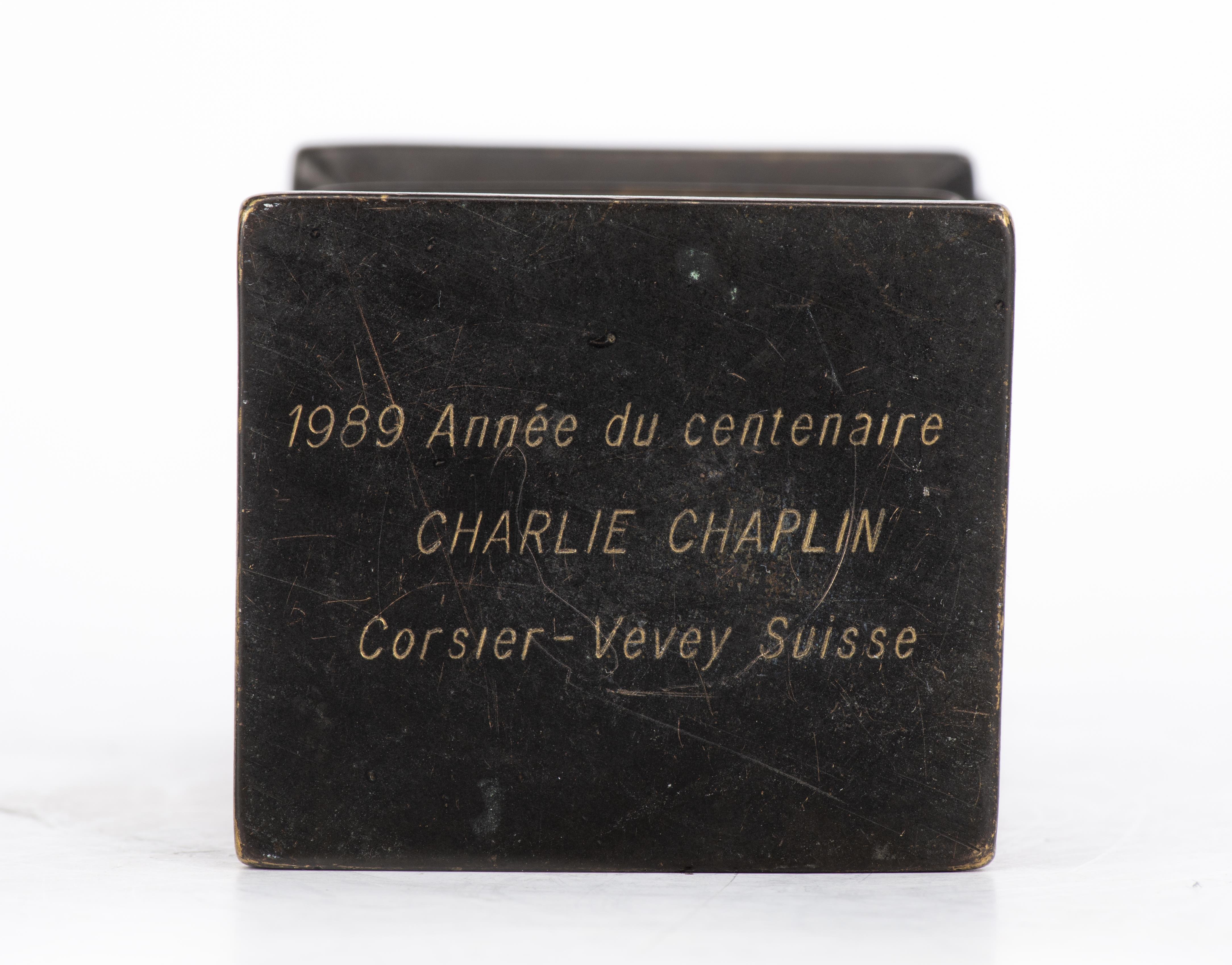 Bronze à patine brune représentant sur un piédestal le chapeau et la canne de Charlie Chaplin édité en 1989 année du centenaire Charlie Chaplin Corsier-Vevey Suisse.