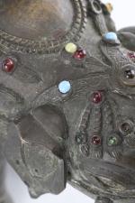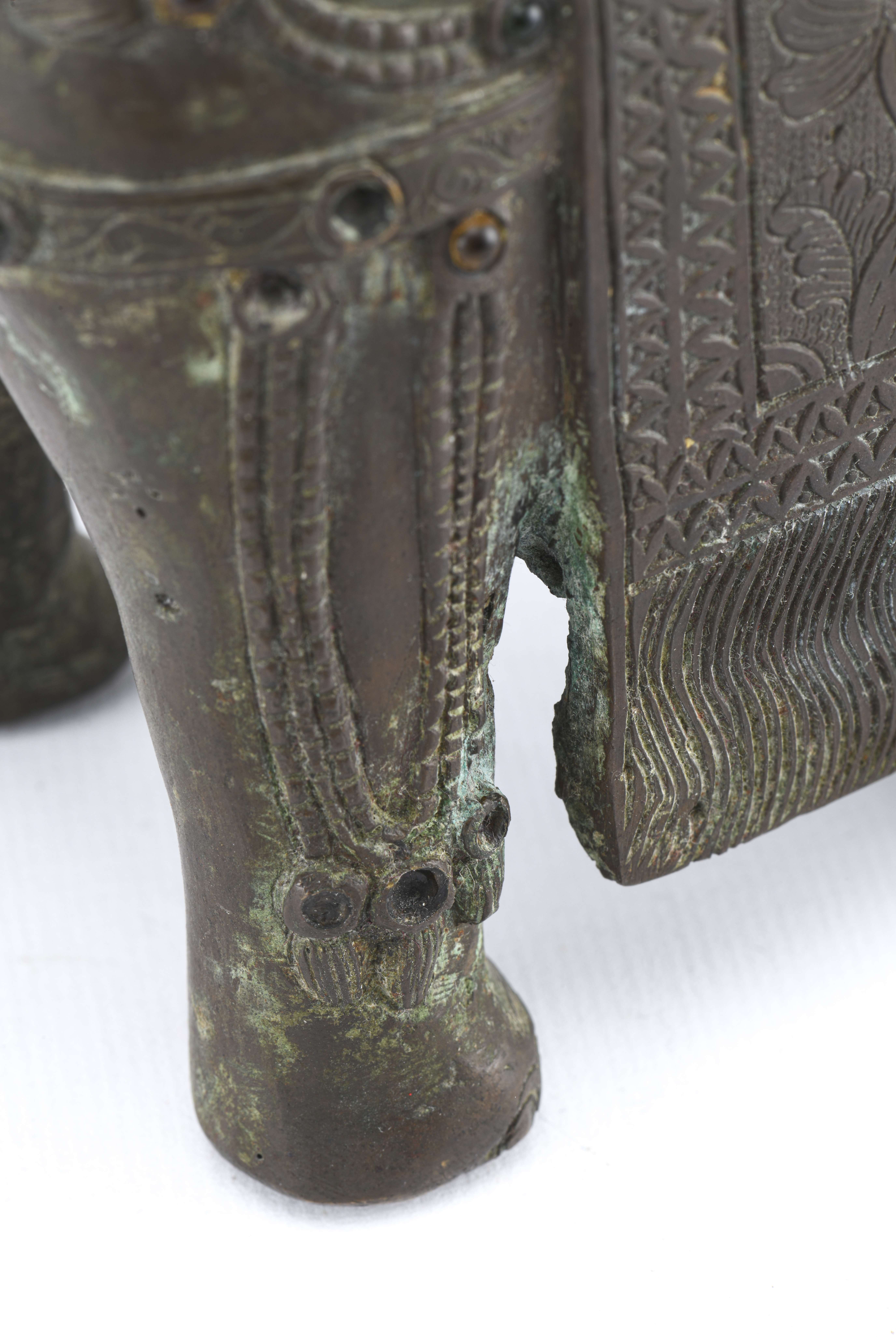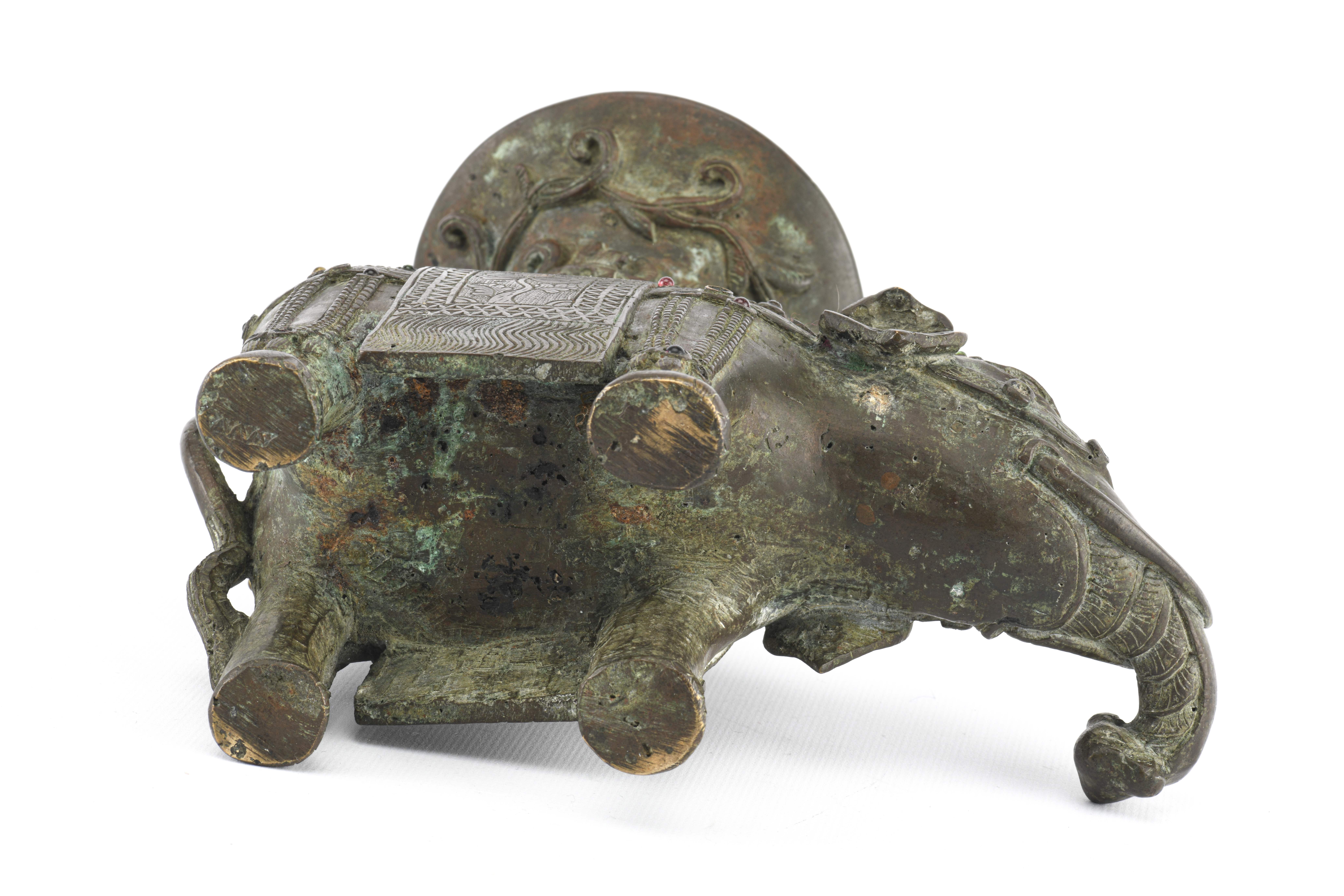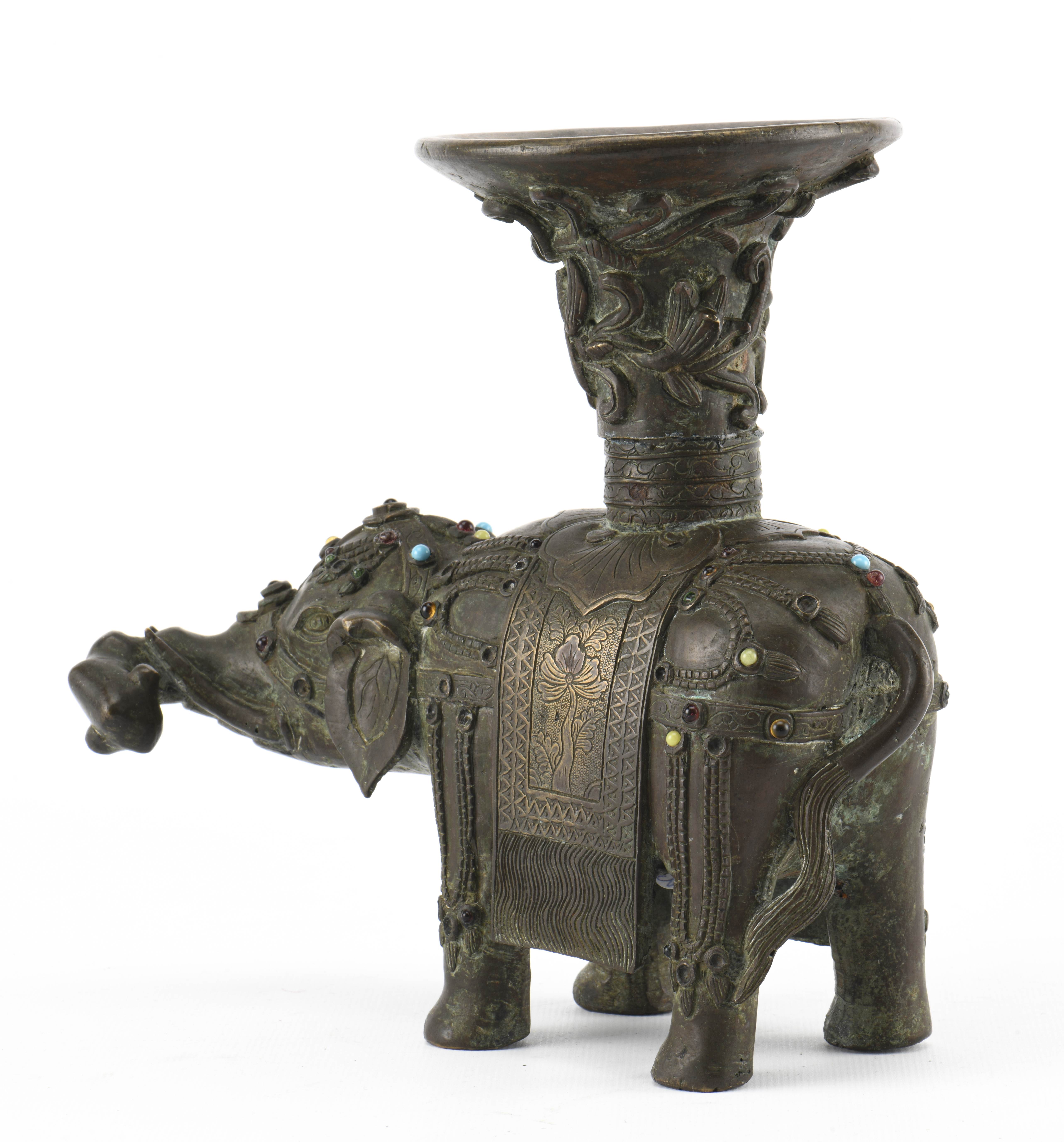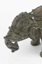 Bronze de Chine en forme d'éléphant à parure de verroterie multicolores, portant un vase trompette sur son dos à décor floral, XIXe.