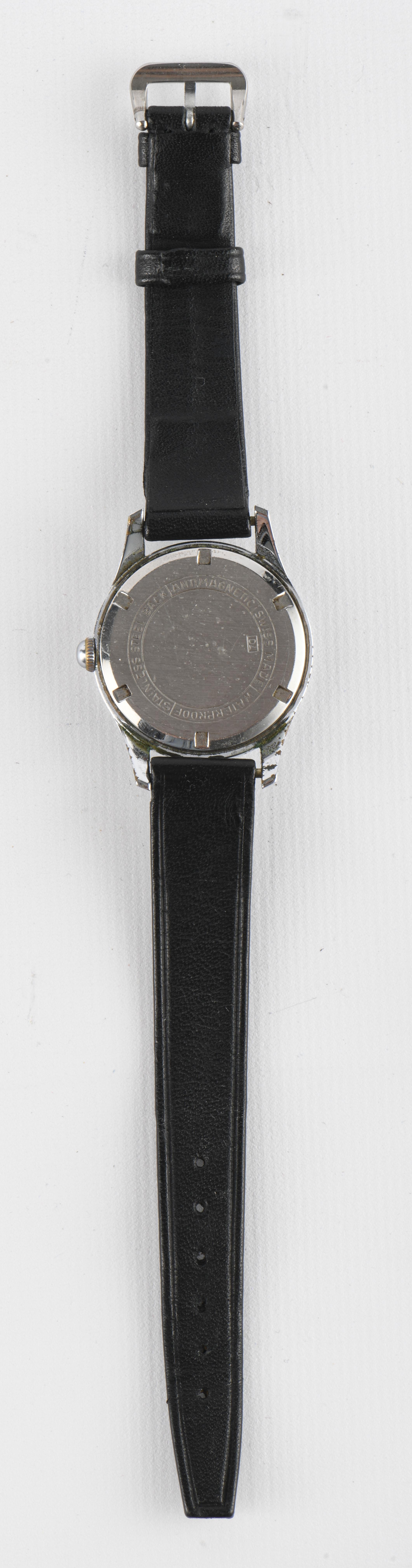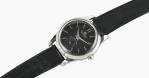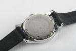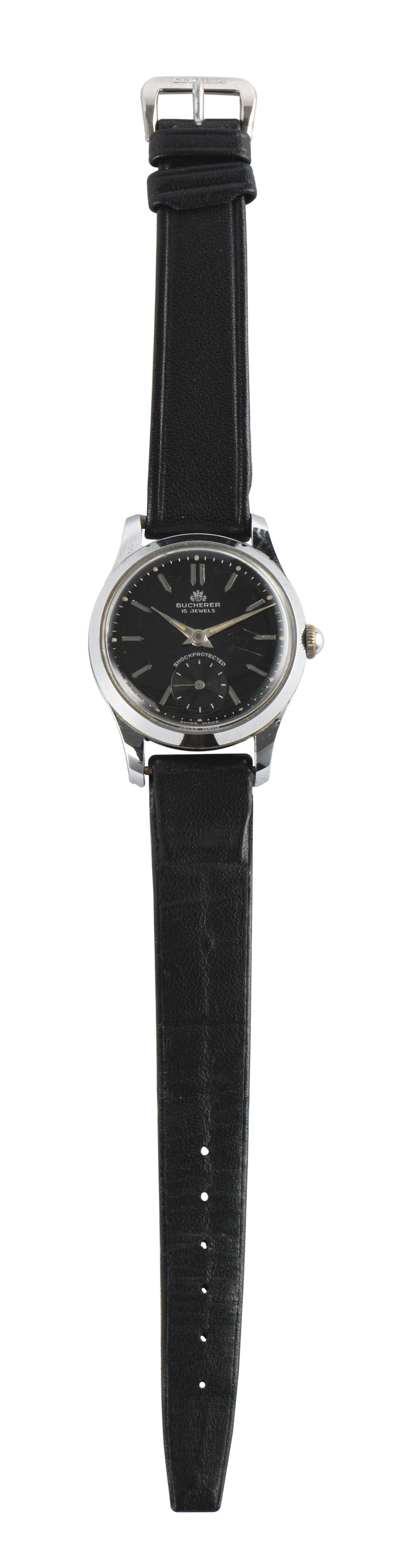 Bucherer, montre-bracelet mécanique en acier à cadran noir, index bâtons et aiguilles en pointe, petite seconde à 6h.