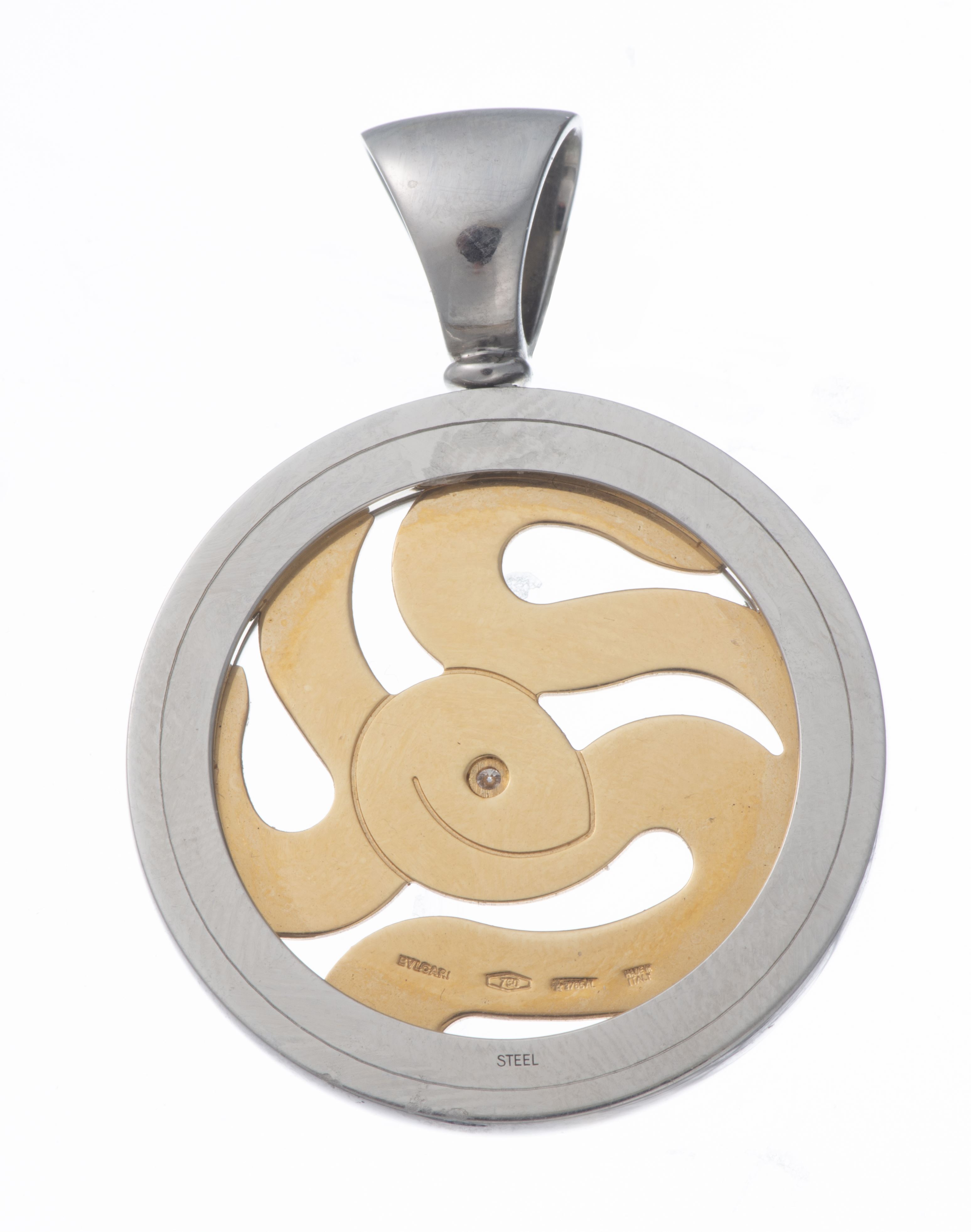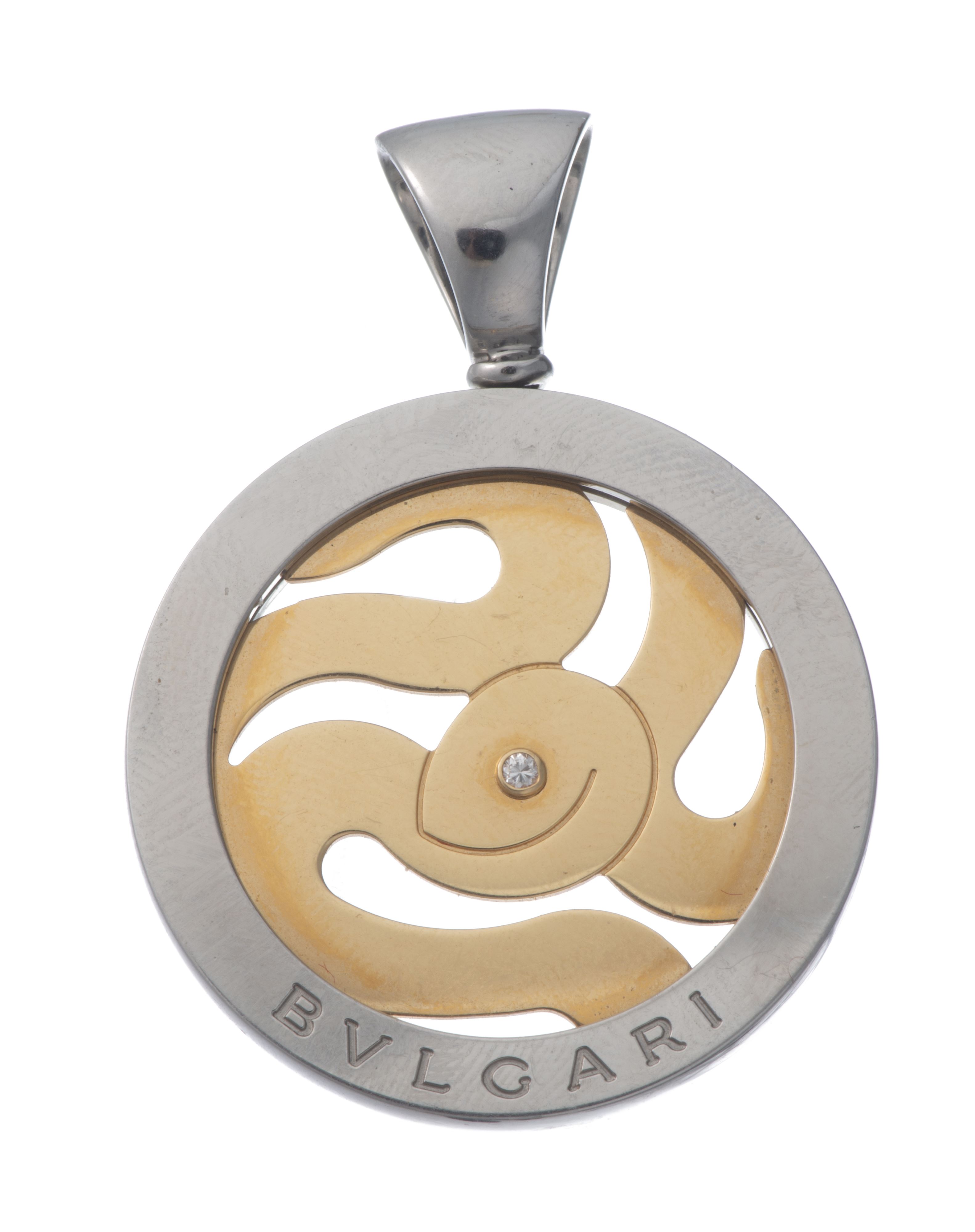 Pendentif BULGARI "Tondo snake" en acier et or jaune .750 avec un motif serpent ajouré et un diamant de 0.01 ct au centre pour l'œil.