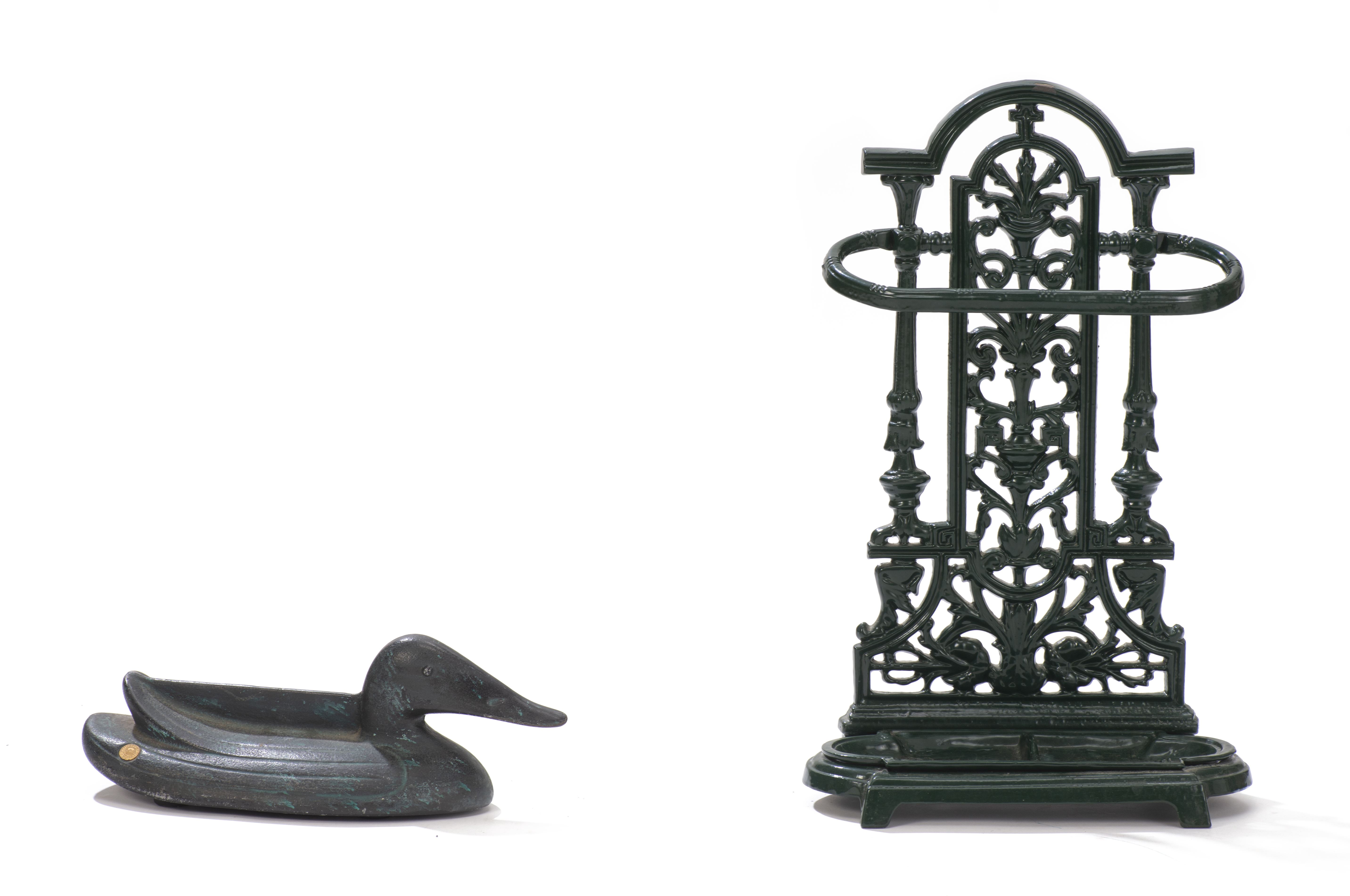 Canard en fonte servant de cale à porte et un porte-parapluie en fonte de fer