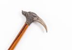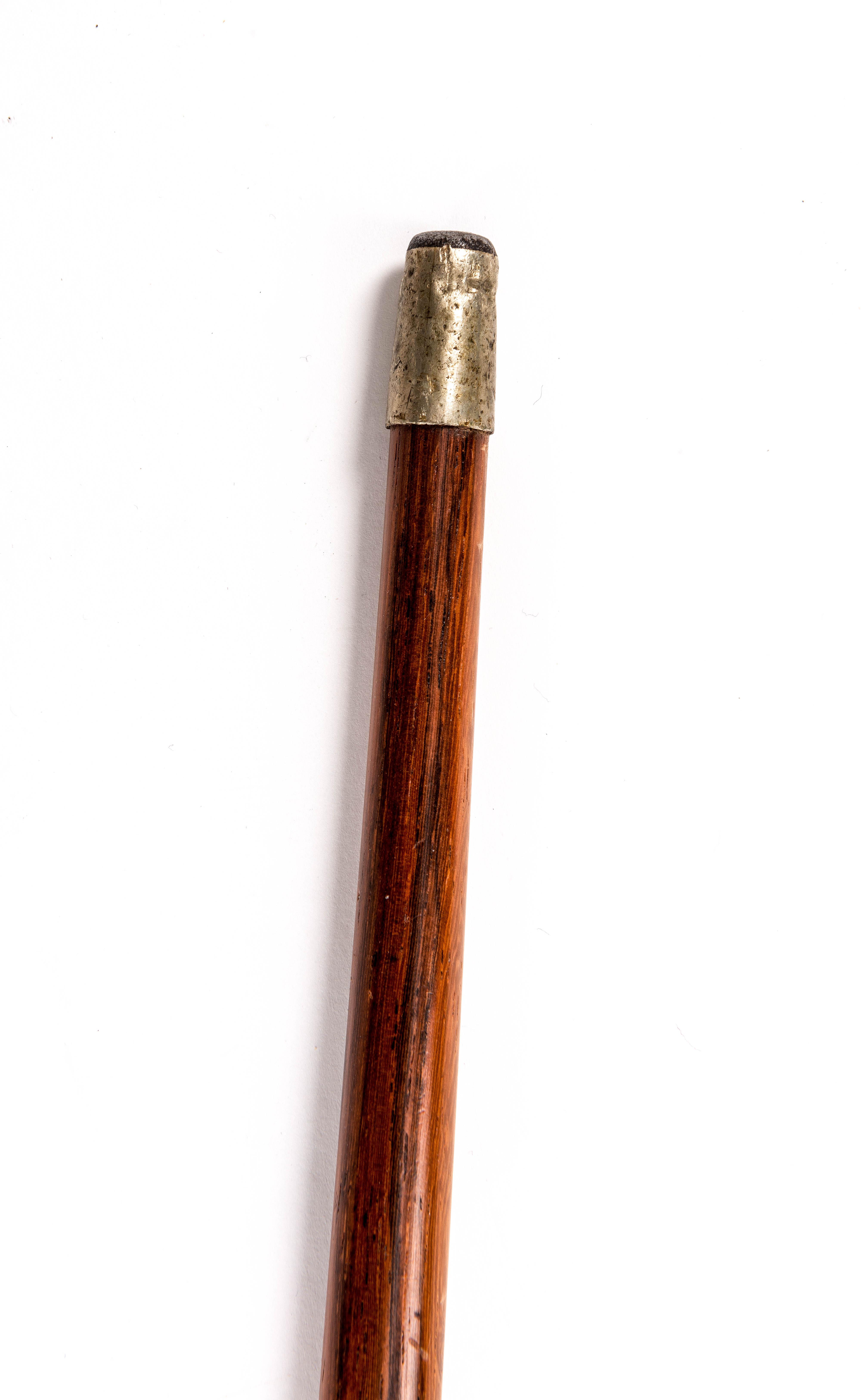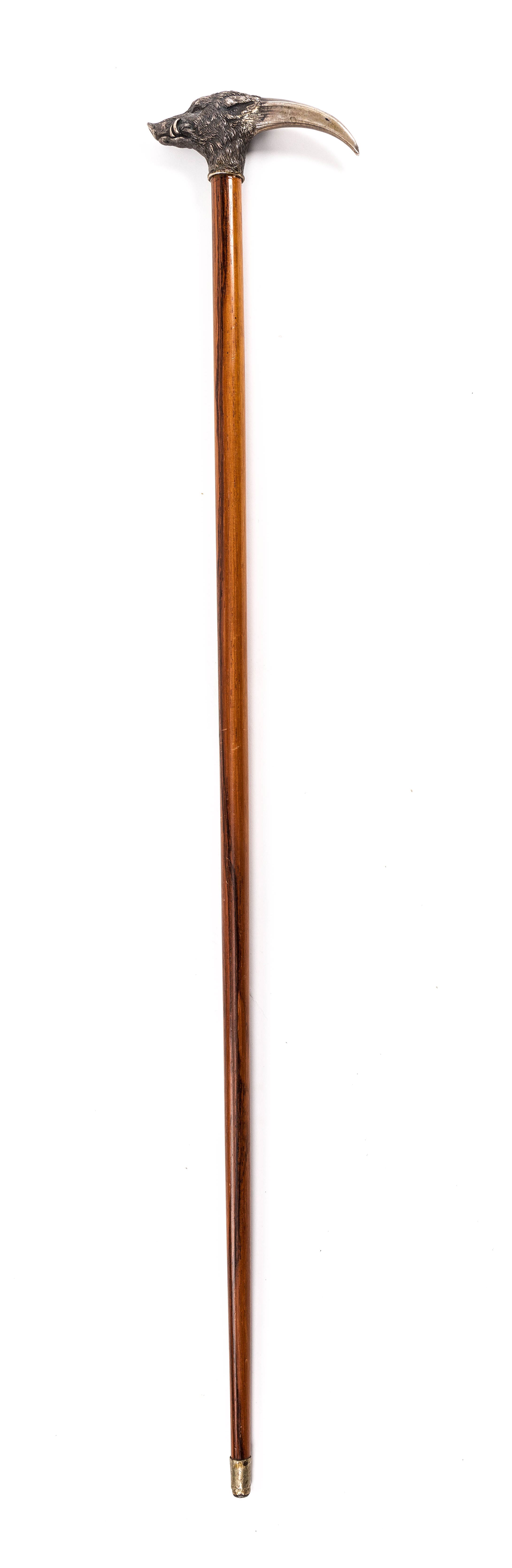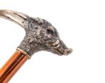 Canne en bois à pommeau tête de sanglier et en pointe.