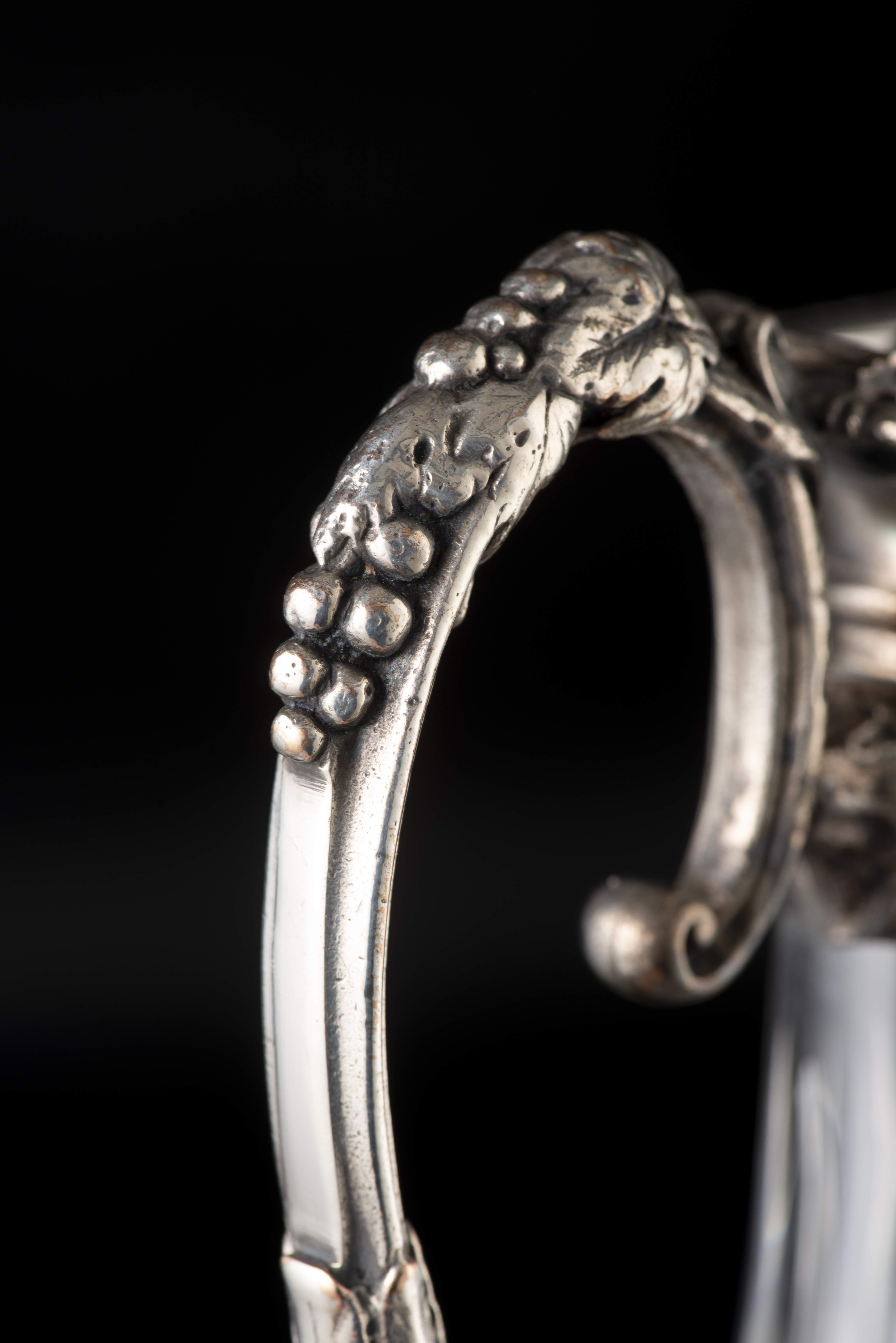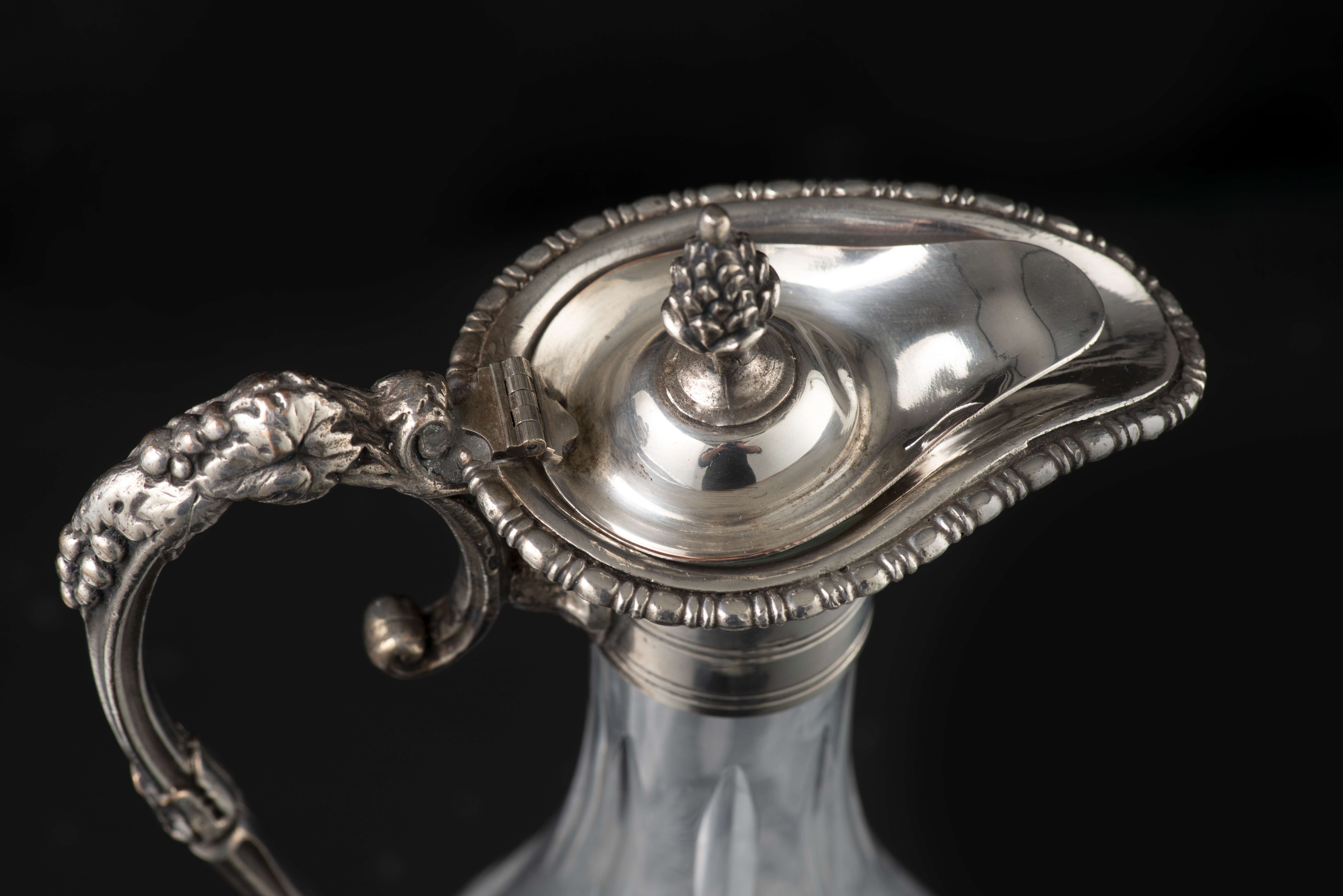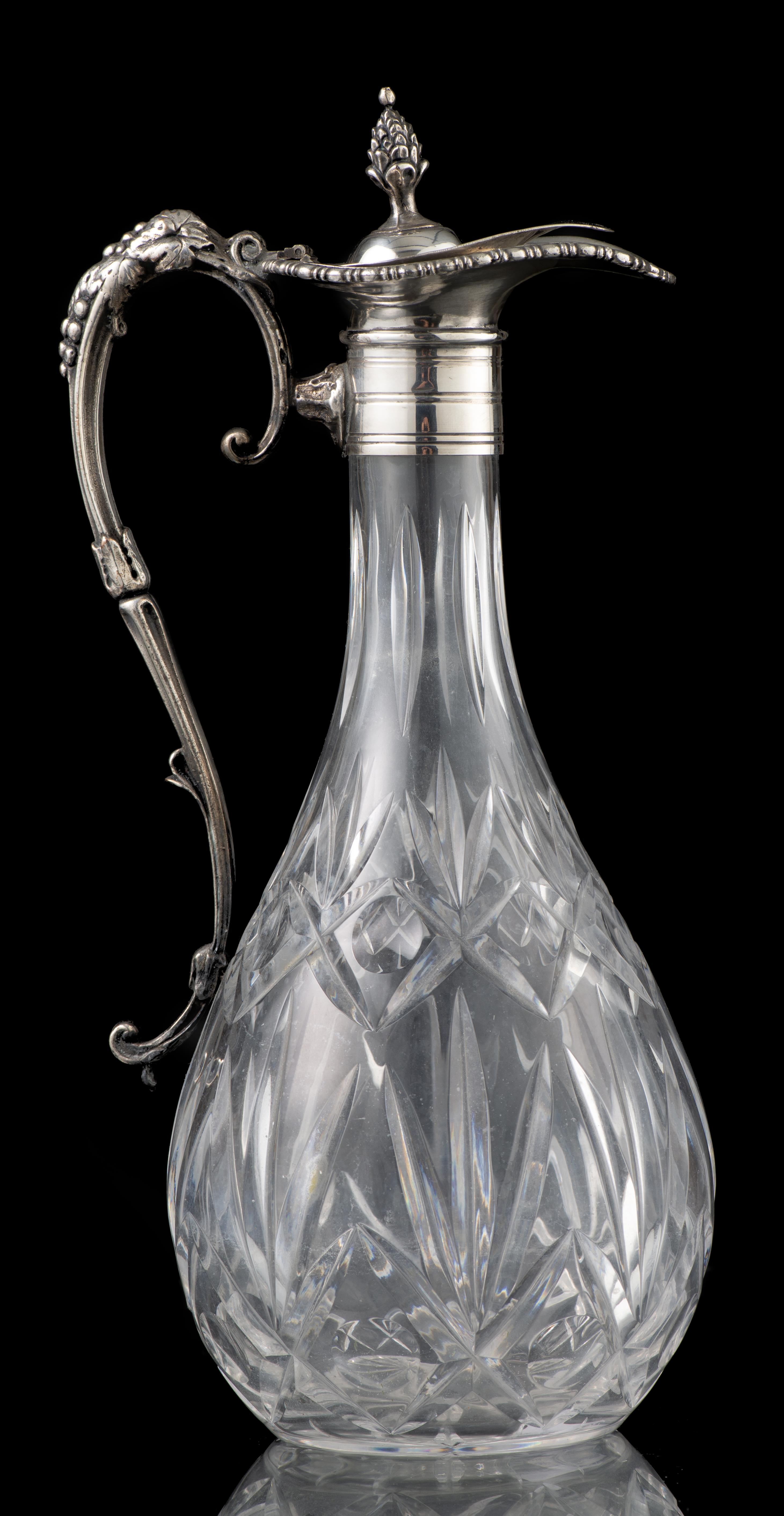 Carafe en cristal taillé avec anse et embouchure en métal argenté.