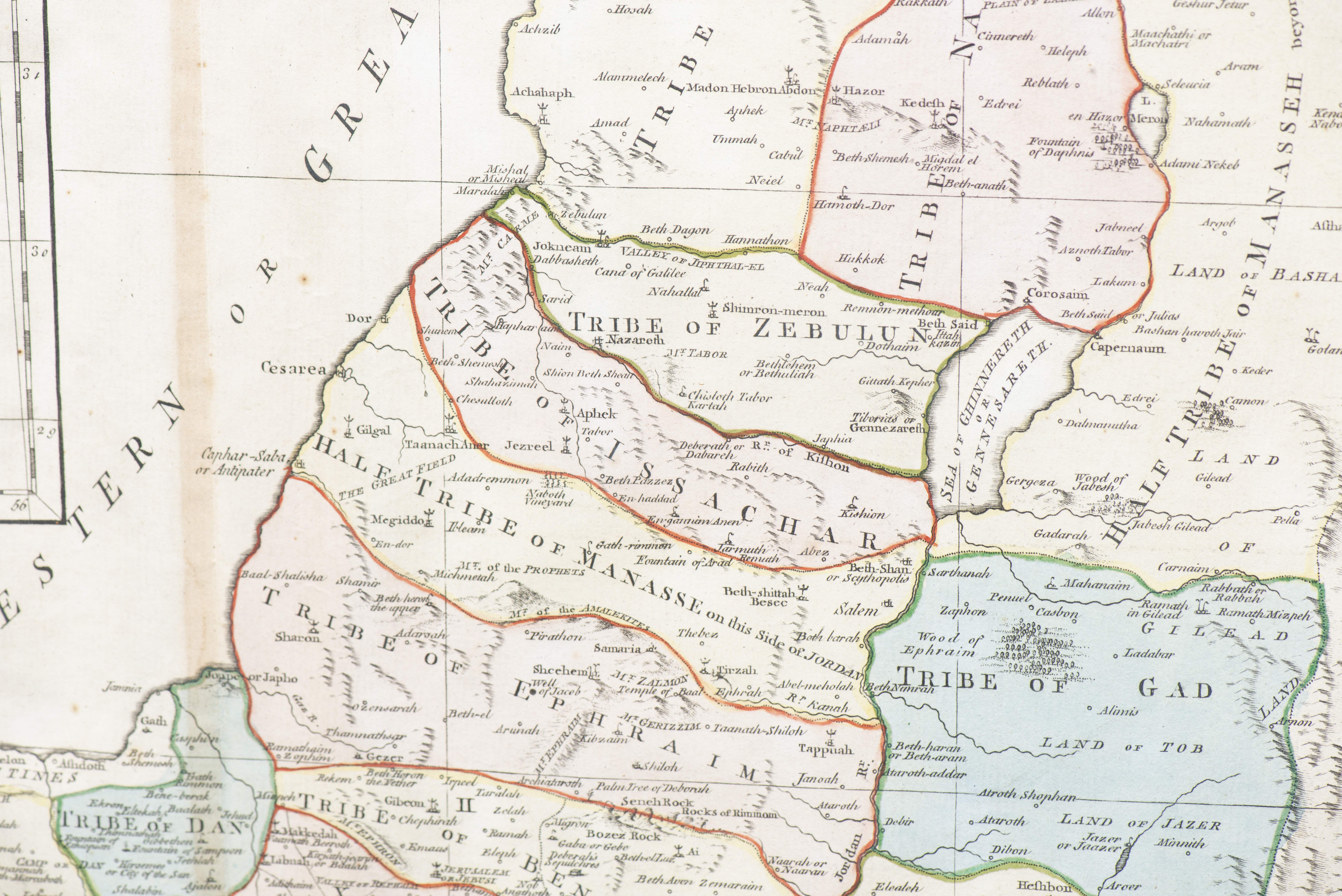 Carte ancienne "The forty Years Sojourning of the children of Israel through the Wildernefs to the Land of Canaan" Bowles's New one-sheet Map of the Land of Canaan, or Holy Land which God promised to Abraham and his seed, as divided among the twelve tribes of Israel together with their forty Years Sojournment thro the Wildernefs to the said land. Printed for the proprietors Bowles & Carver, N°69 in St Paul's Church Yard, London. XIXe