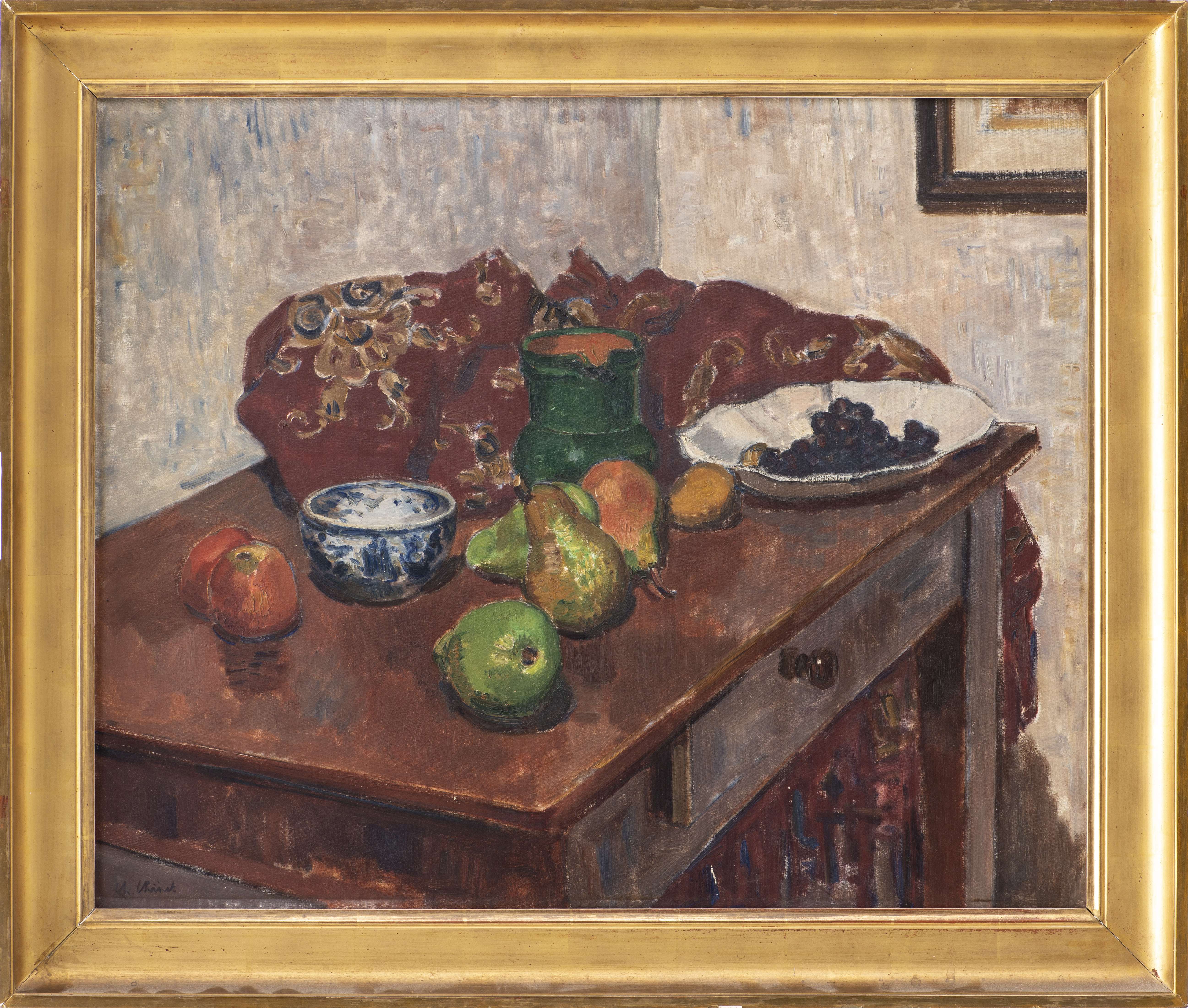 Charles CHINET (1891-1978) "Nature morte aux pommes et aux poires sur une table avec des raisins"