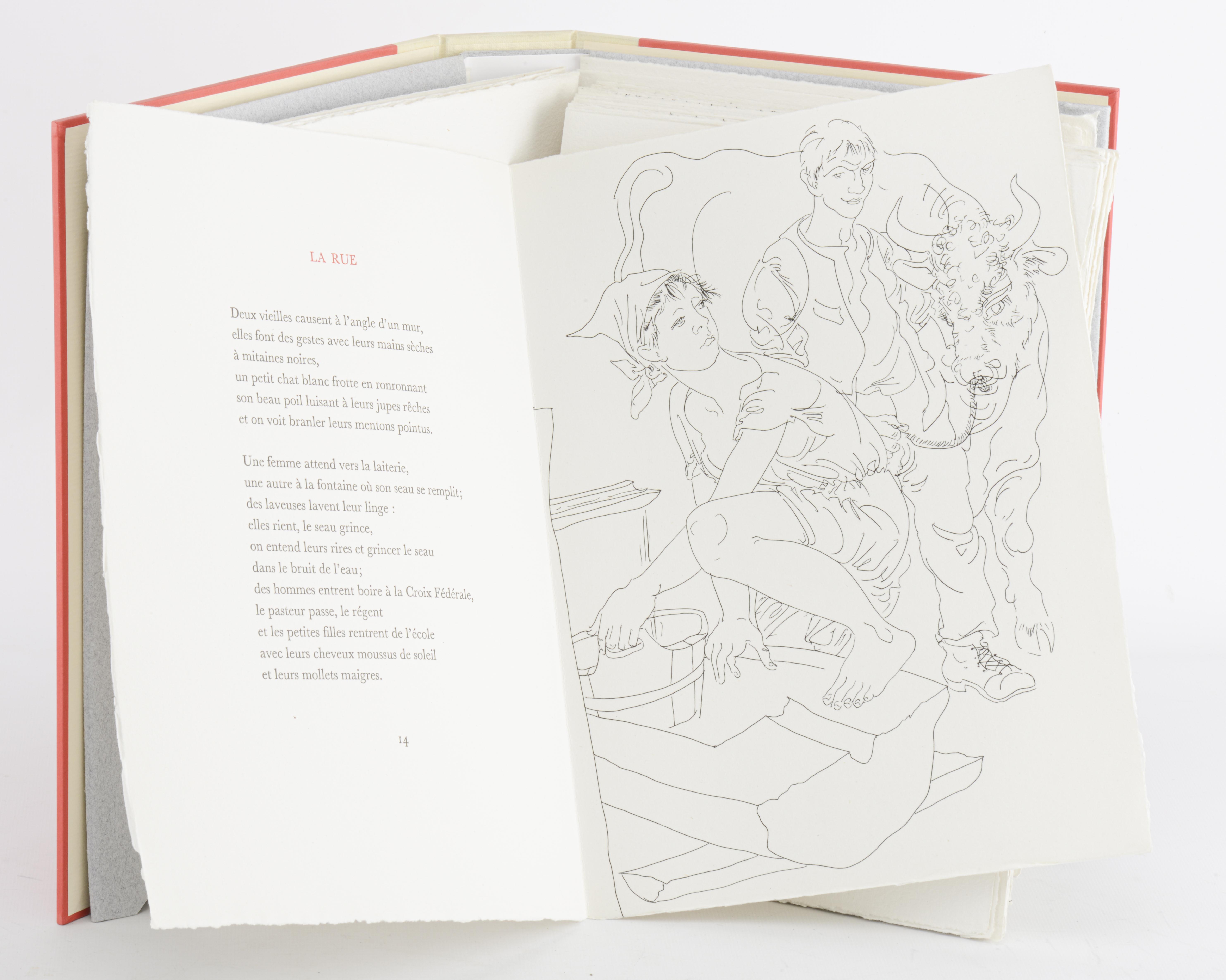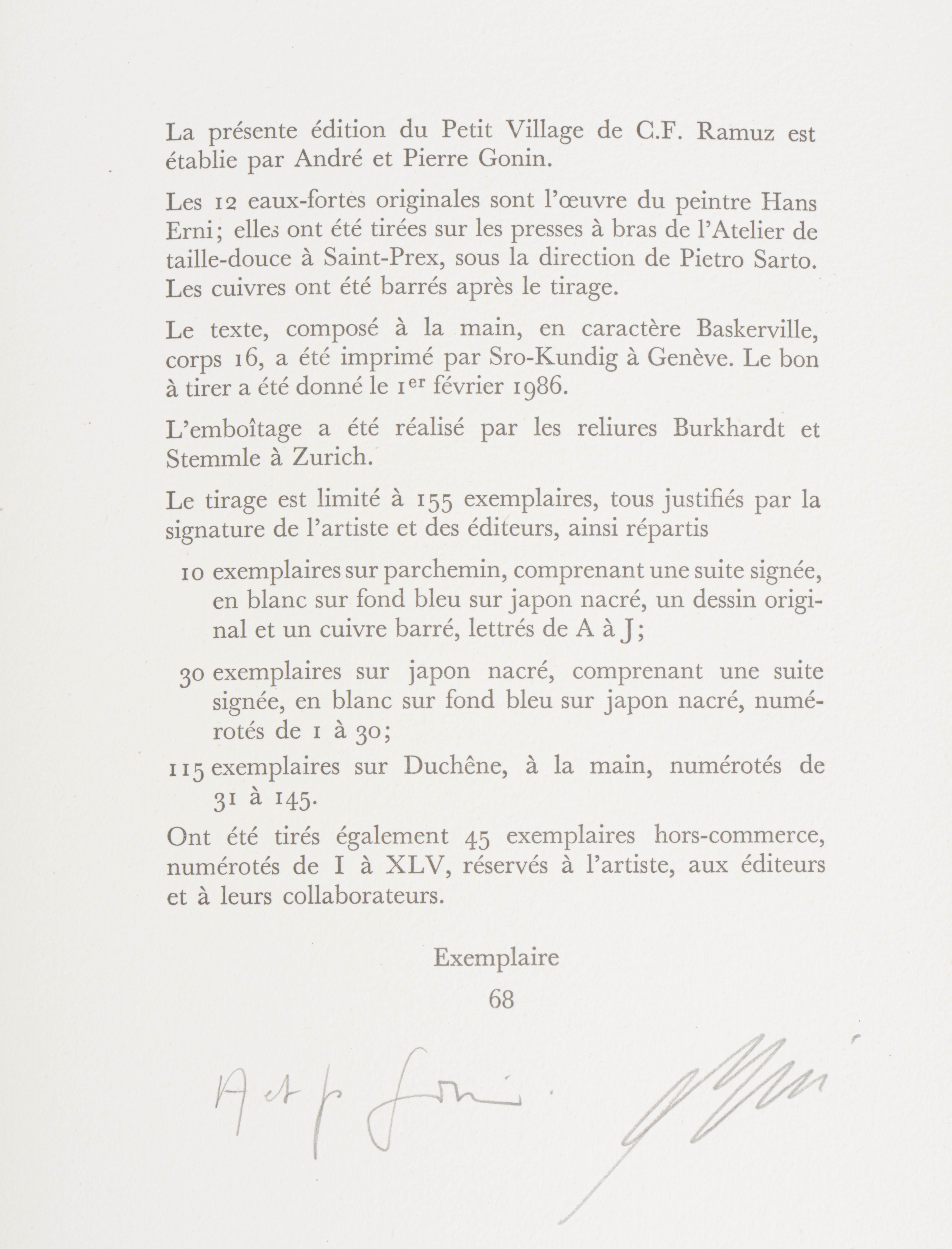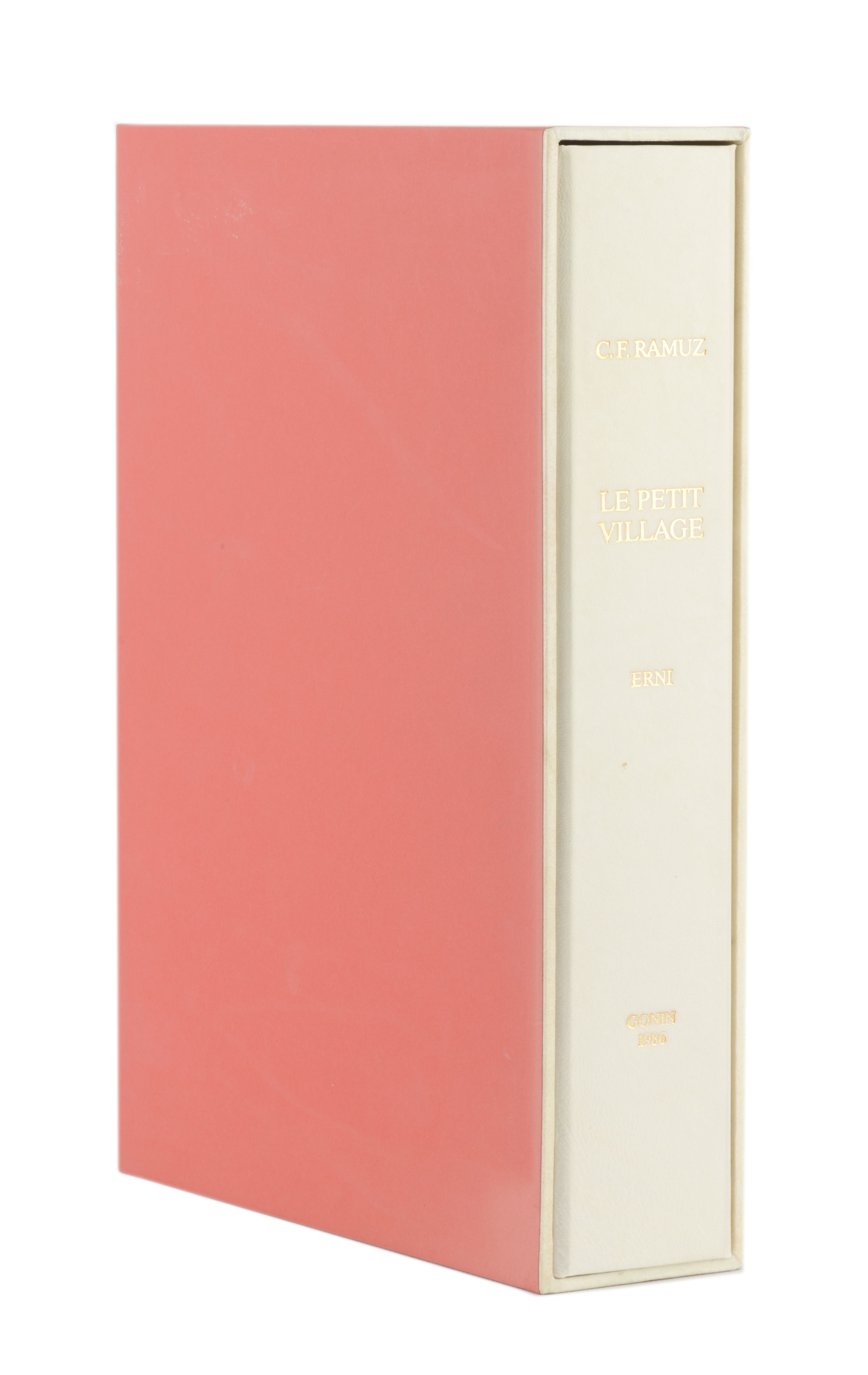 Charles-Ferdinand Ramuz "Le Petit Village", André et Pierre Gonin, 1986, Lausanne, In-4 en feuilles sous emboîtage demi-parchemin, couverture illustrée rempliée, contient 12 eaux-fortes originales de Hans Erni, tirage limité à 155 exemplaires justifiés et signés par l'éditeur et l'artiste, celui-ci N° 68 des 115 exemplaires sur Duchène, numérotés de 31 à 145.