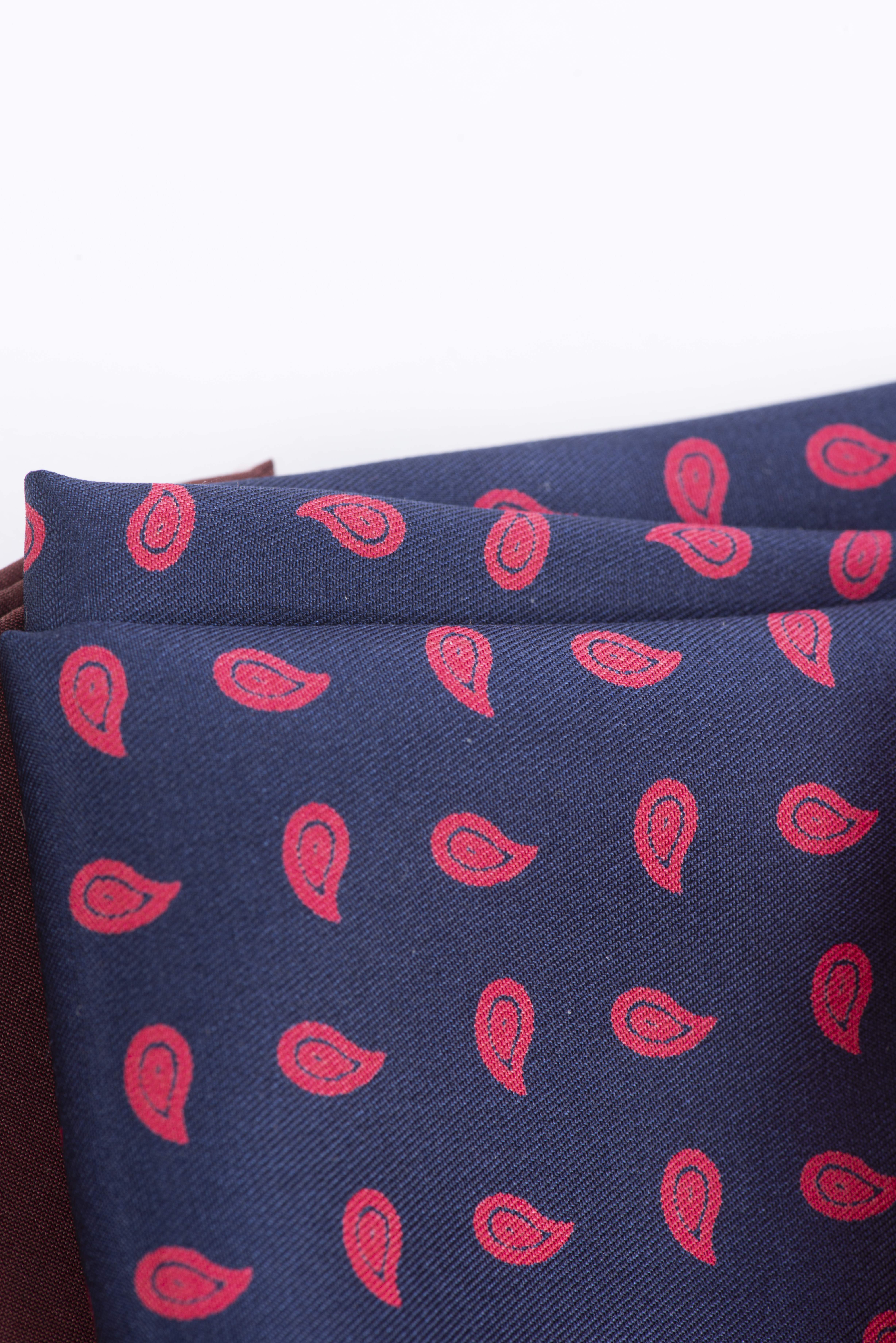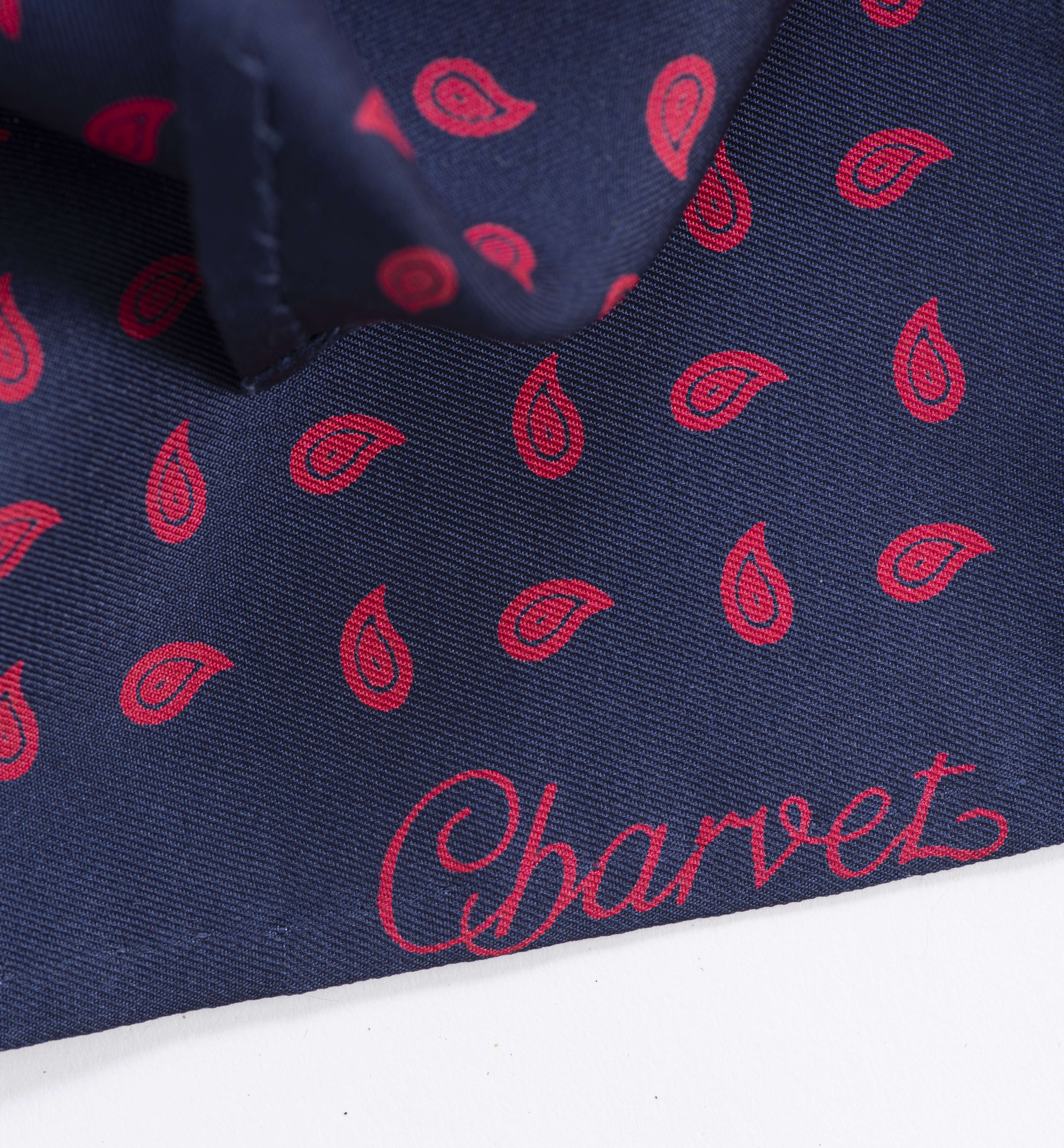 Charvet Place Vendôme, lot de 5 pochettes en soie, dont l'une à motifs paisley rouges sur fond marine et quatre unies, dans les teintes de marine, rouge, marron et vert d'eau.
