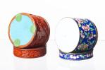 CHINE, deux boîtes cylindriques en métal à couvercle. L'une recouverte de laque de Pékin à décor de scènes de genre, l'autre en émail de Canton à décor de fleurs et pêches sur champ bleu.