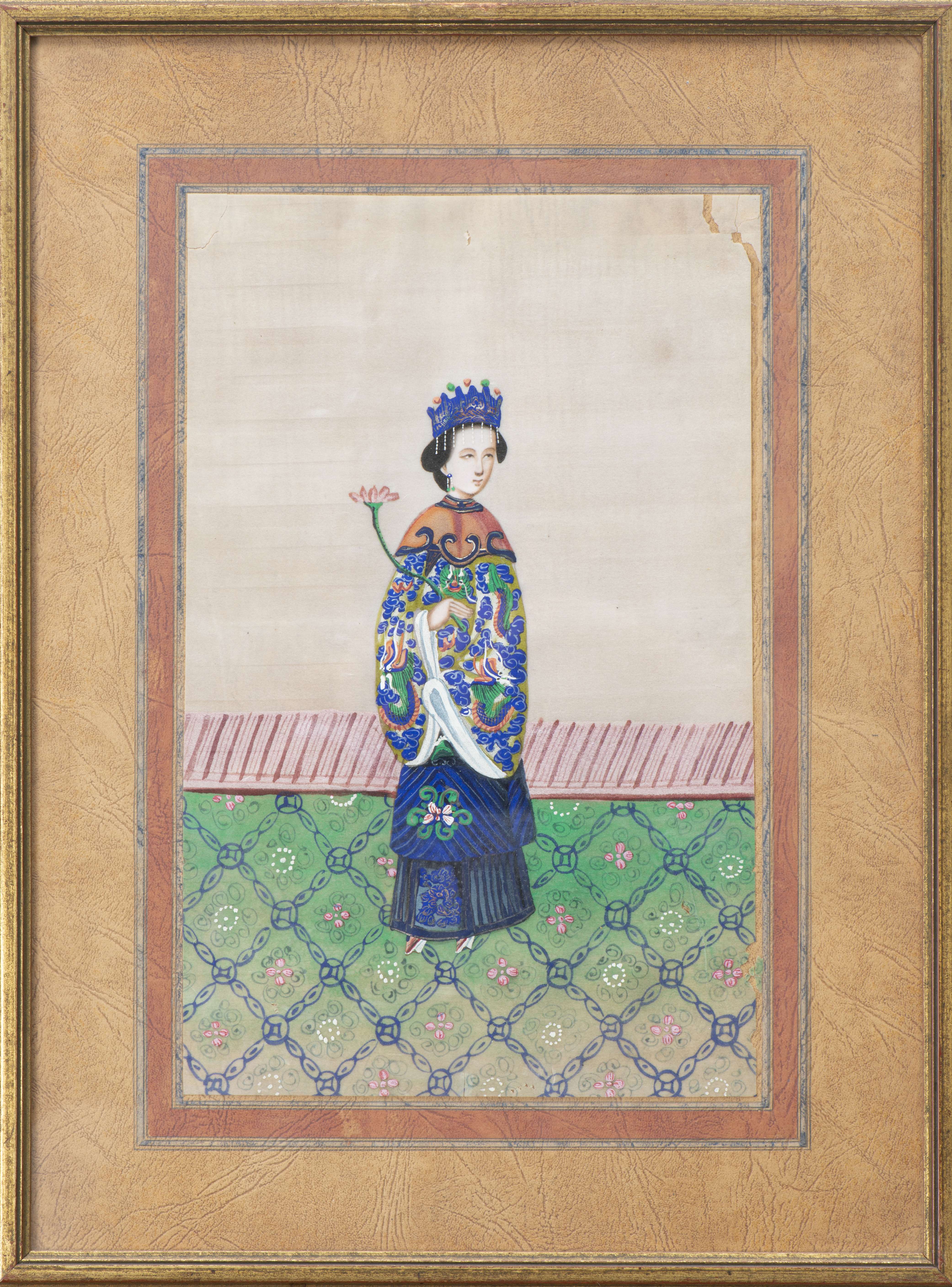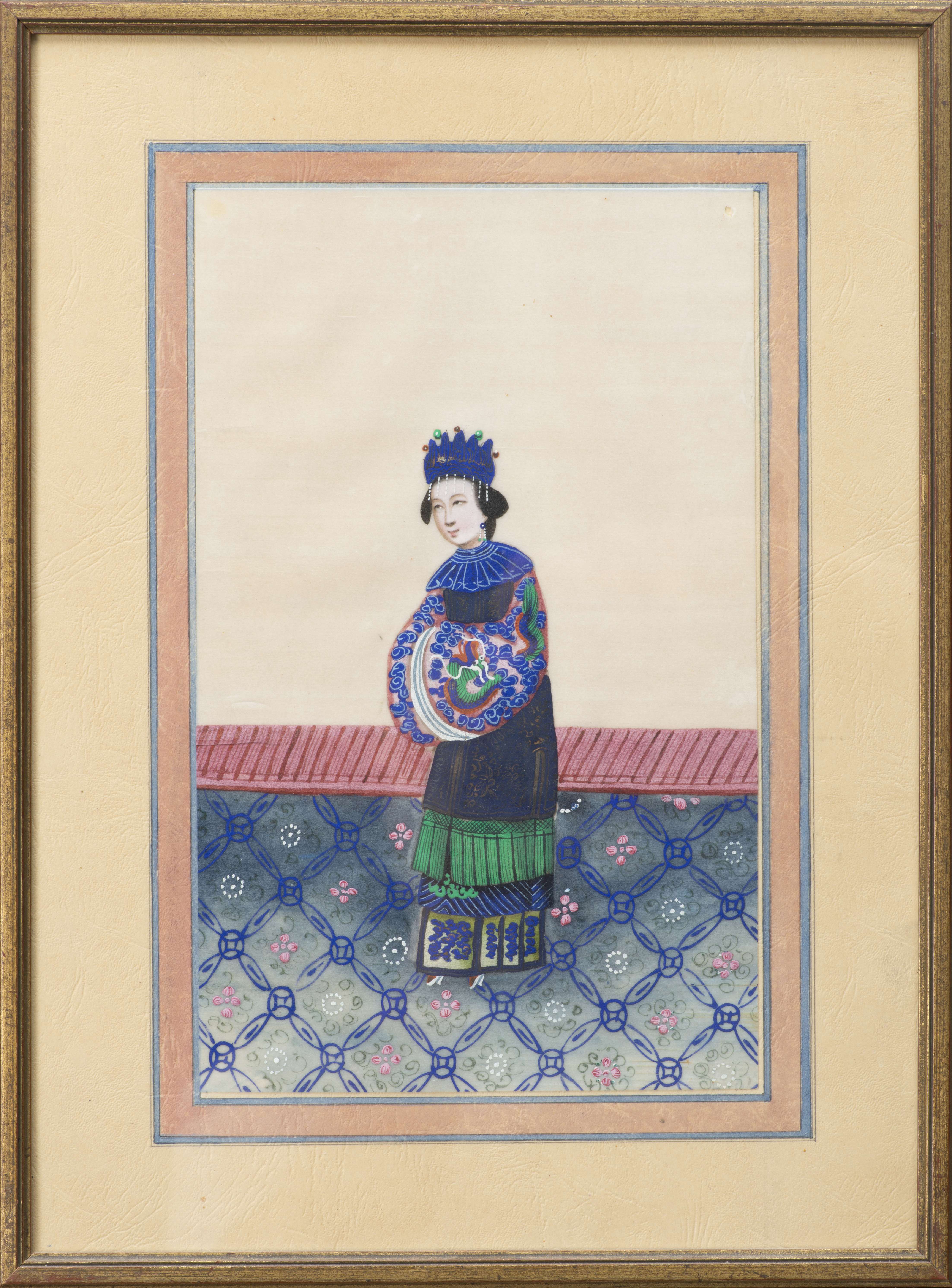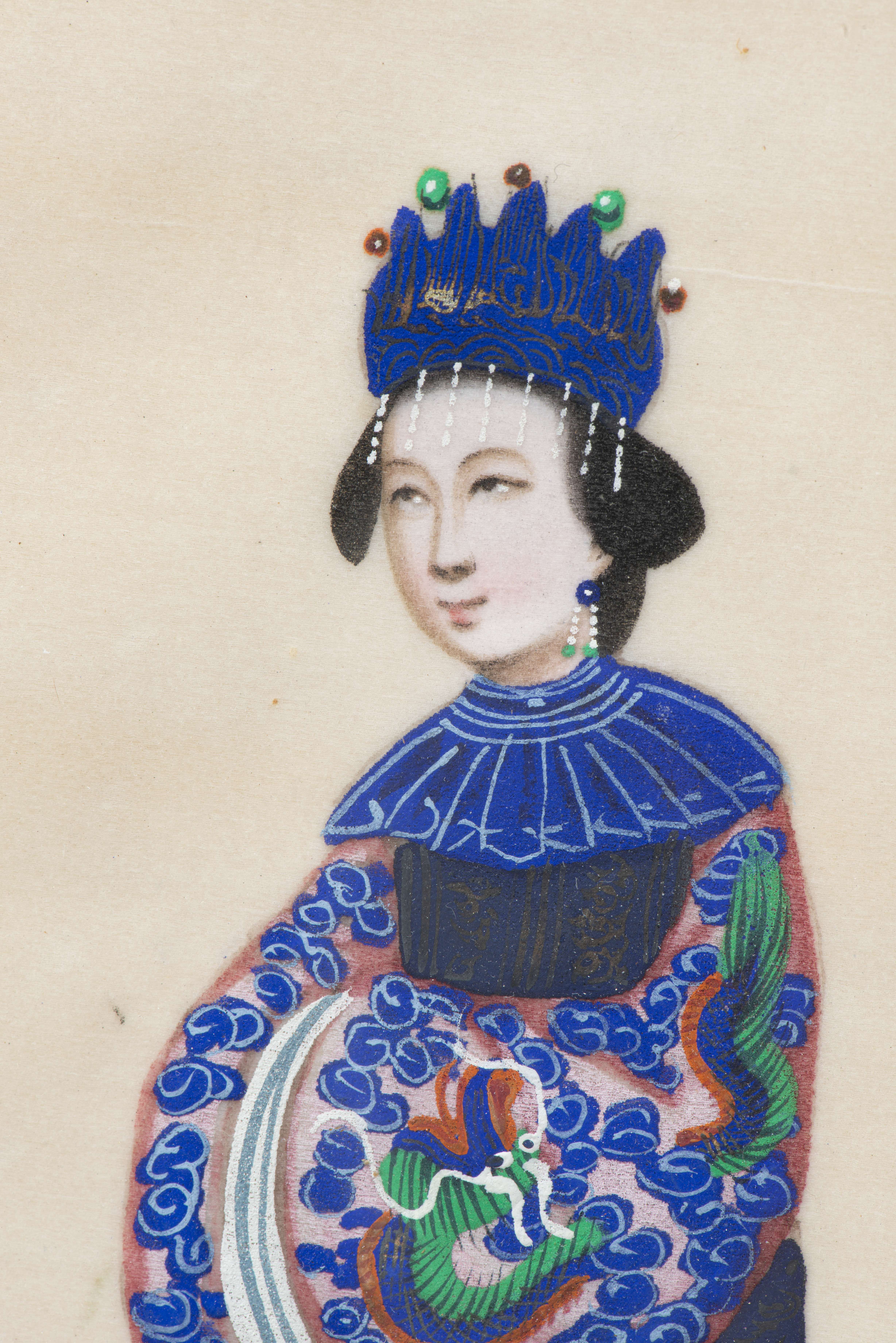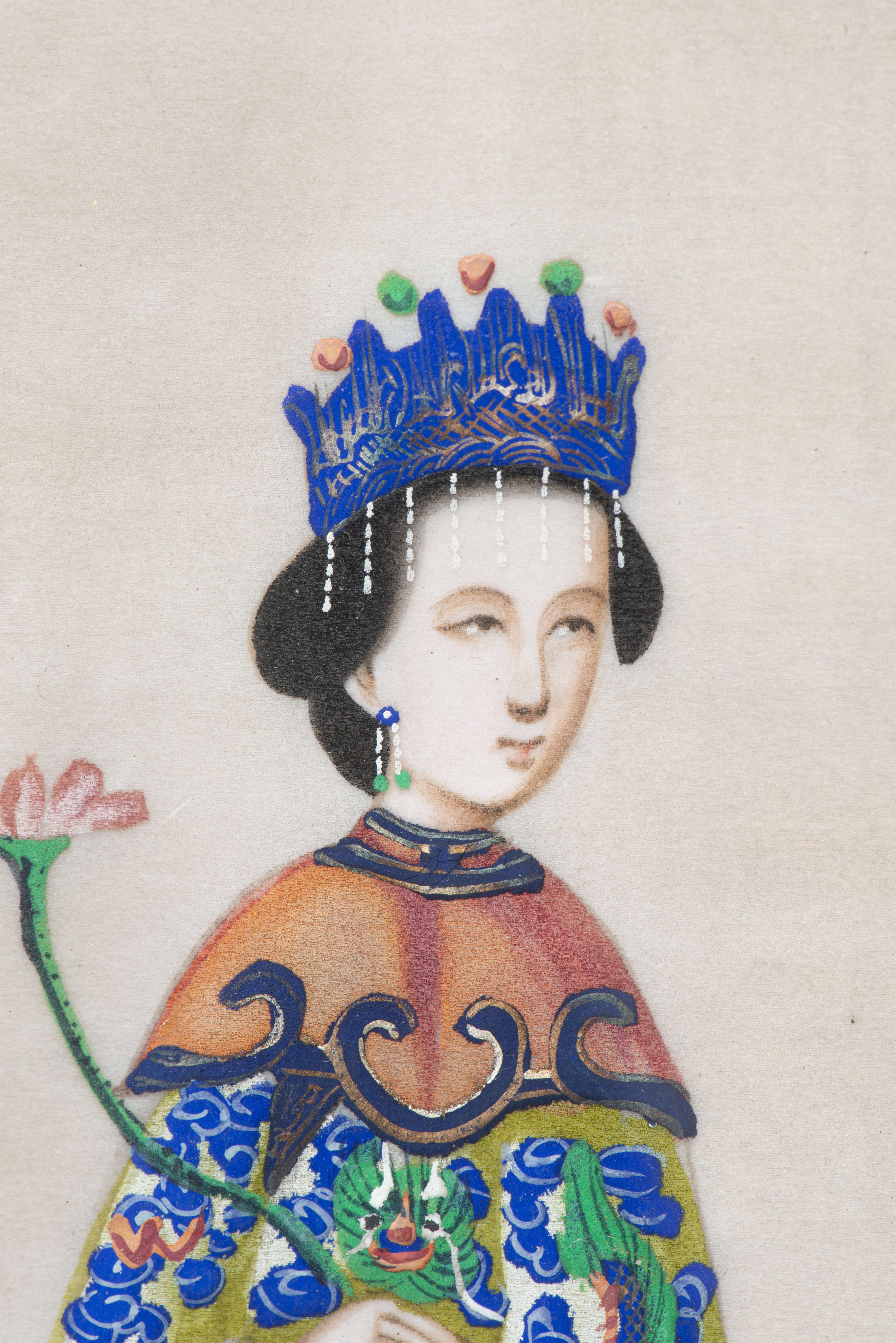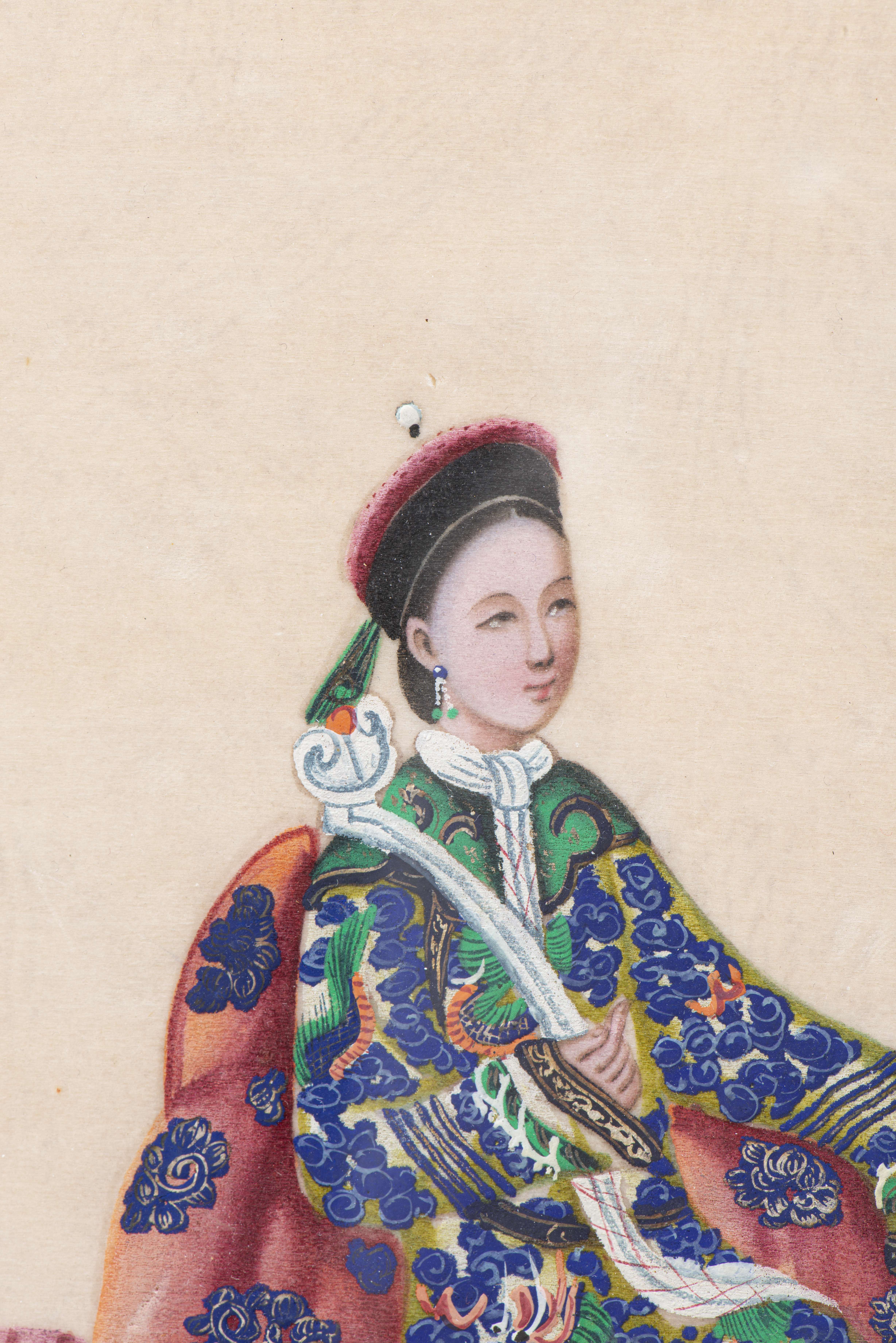 Neuf gouaches chinoises sur papier de riz représentant des femmes en costume traditionnel.