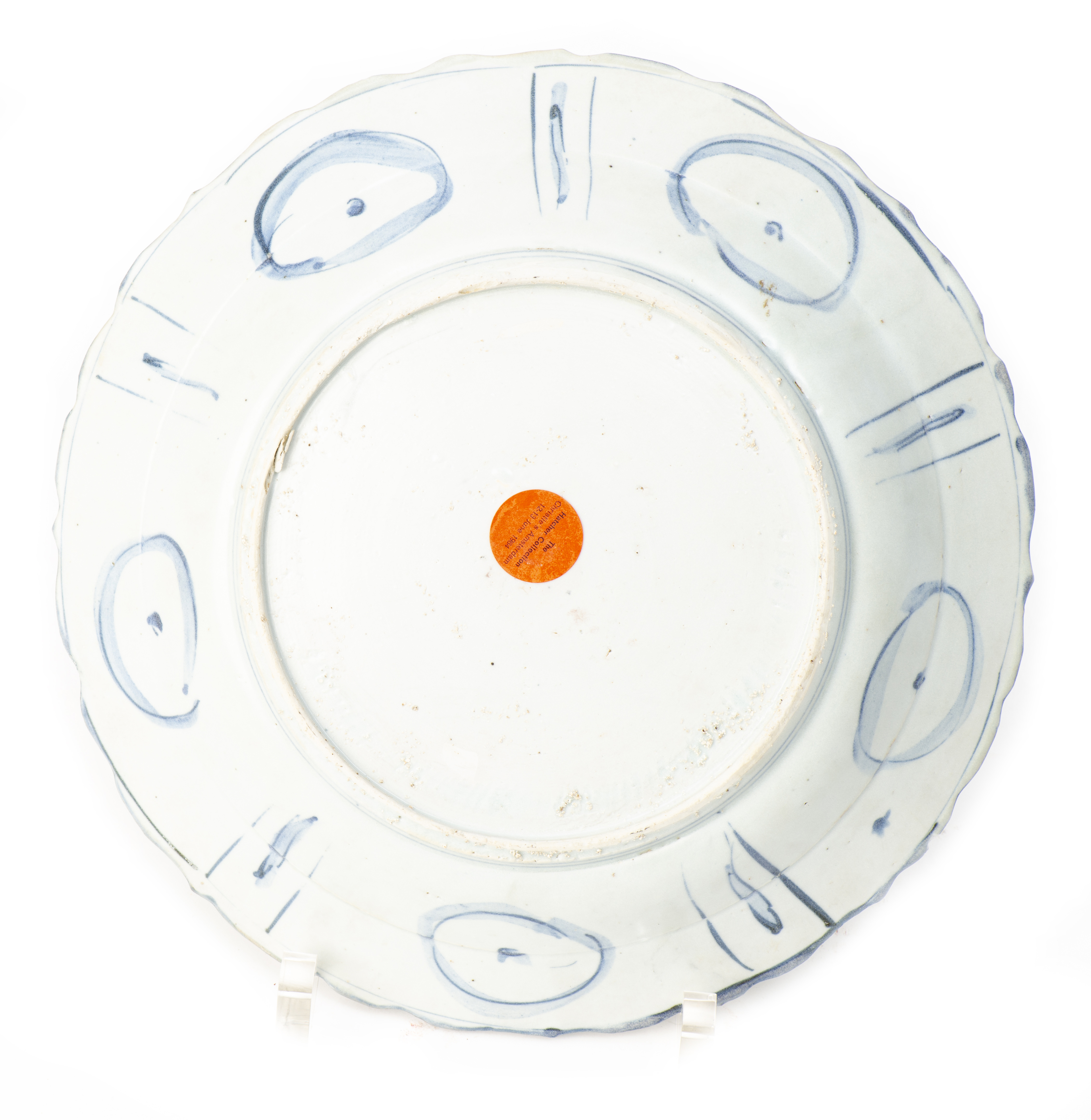 CHINE - 'Hatcher Cargo' kraak dish, circa 1640. Grand plat creux en porcelaine à décor en bleu & blanc d'un oiseau sur un rocher et de pivoines en fleur, la lèvre est divisée en huit pétales à décor de fleurs et de lingzhi en alternance, bordure VII.3.
