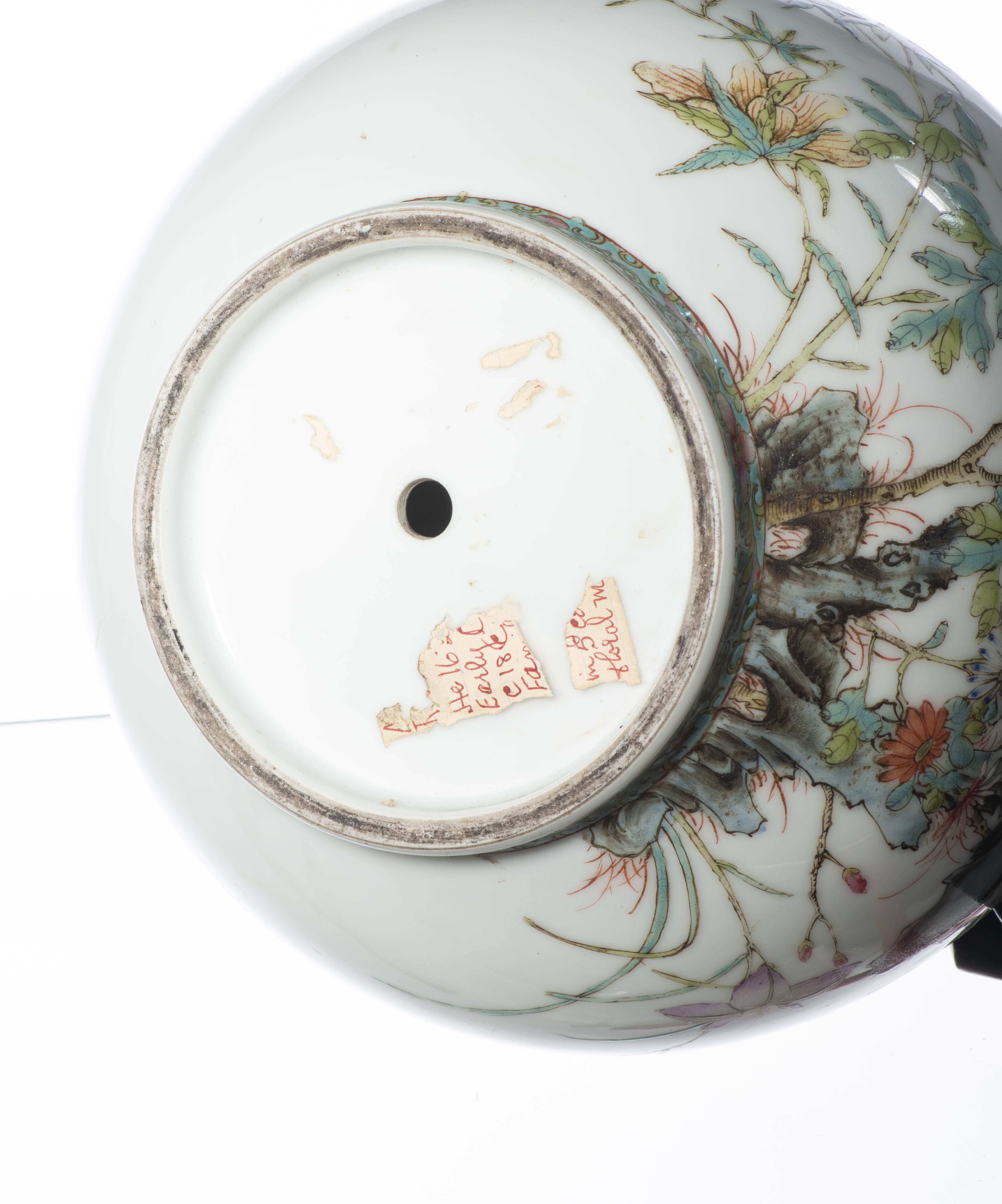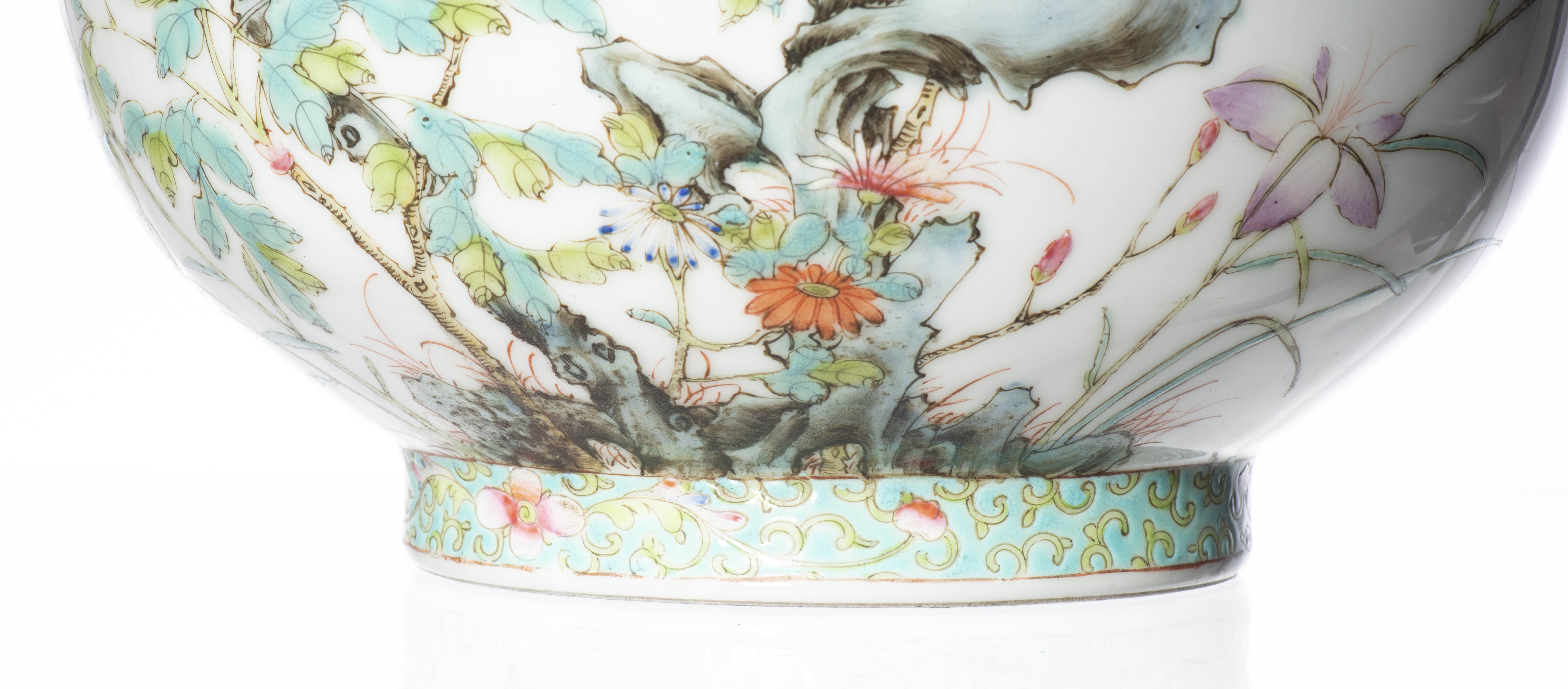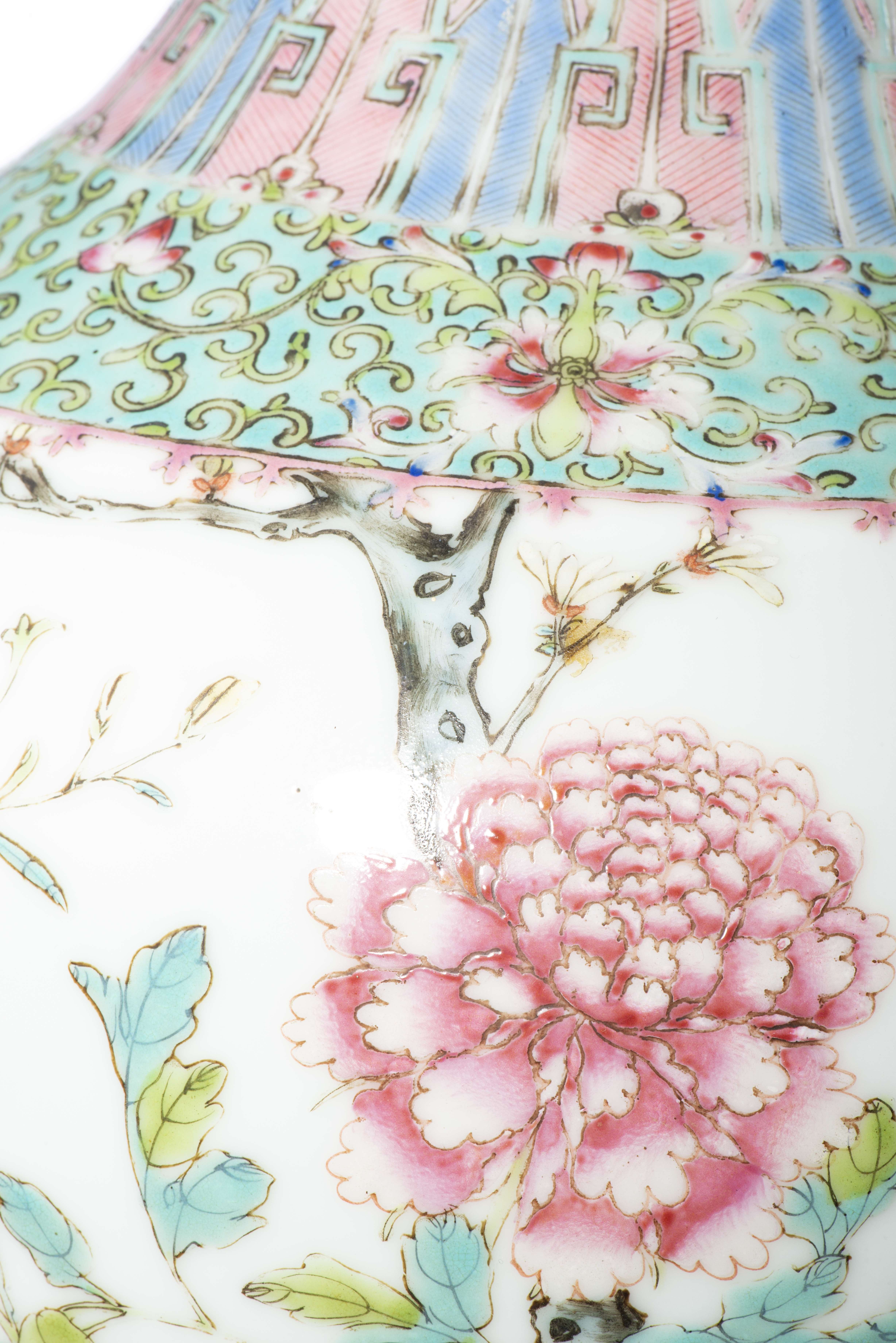 CHINE, Vase boule à long col en porcelaine à décor en famille rose de pivoines et rochers, frise à décor floral sur fond turquoise sur le pied, à l'épaule et une frise de feuilles géométriques alternées rose et bleu à la base du col. La frise sur fond turquoise est reprise sous la lèvre sur le haut du col. Epoque République