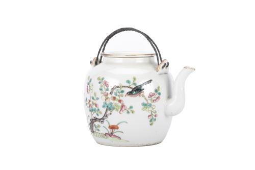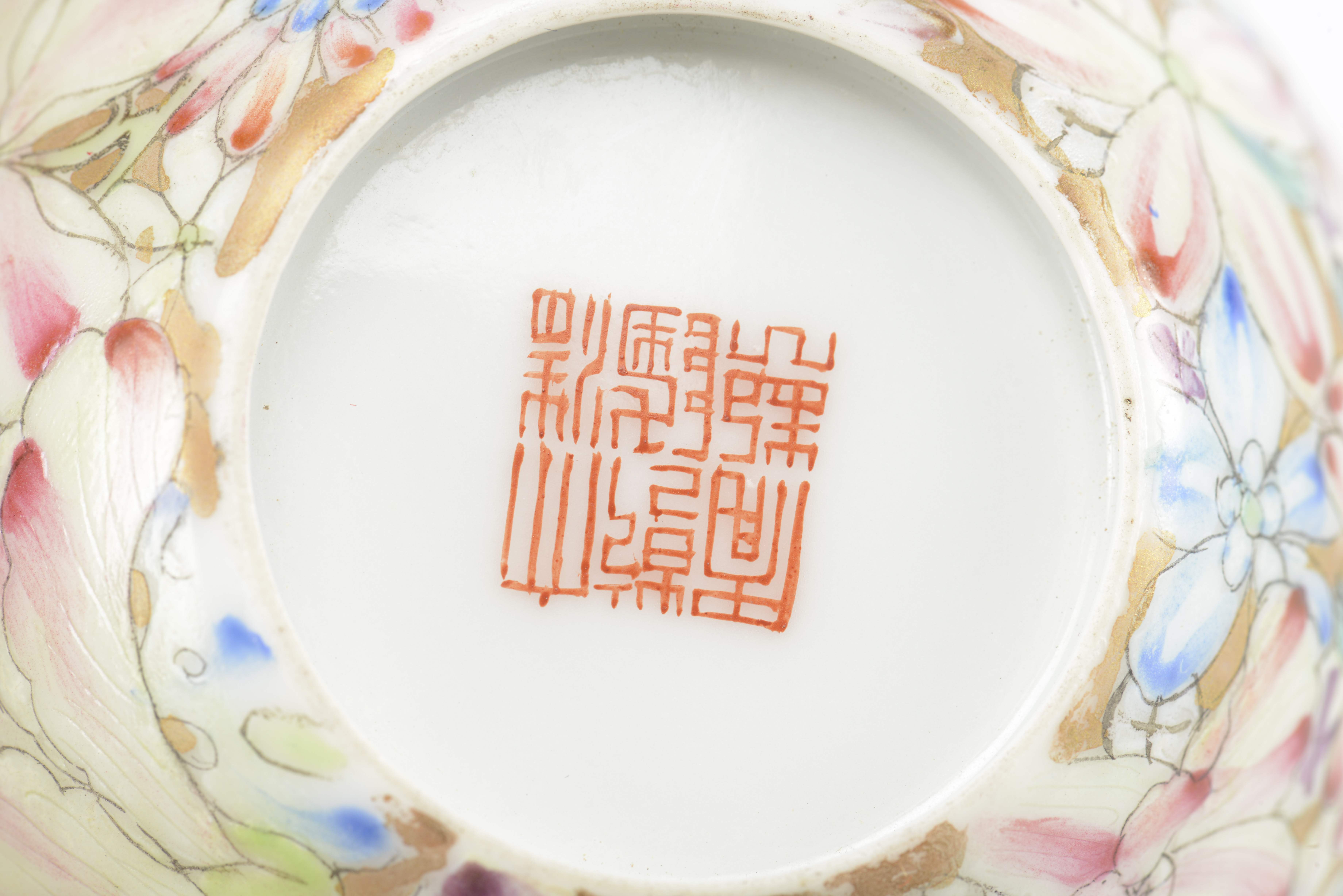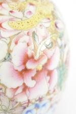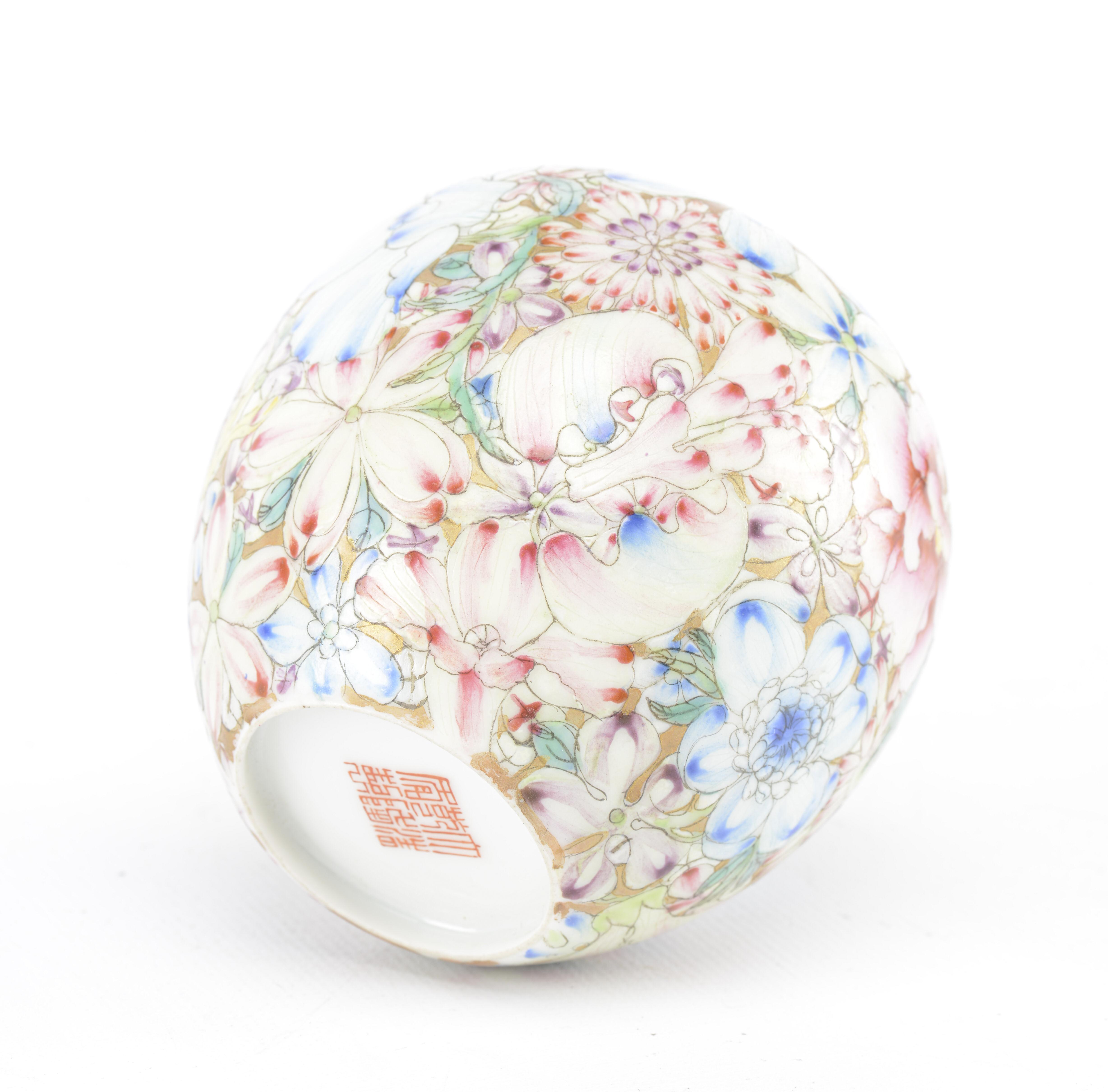 Vase boule en porcelaine de Chine à décor mille-fleurs en famille rose à marque apocryphe en rouge de fer à six caractères Daqing Qianlong nianzhi.