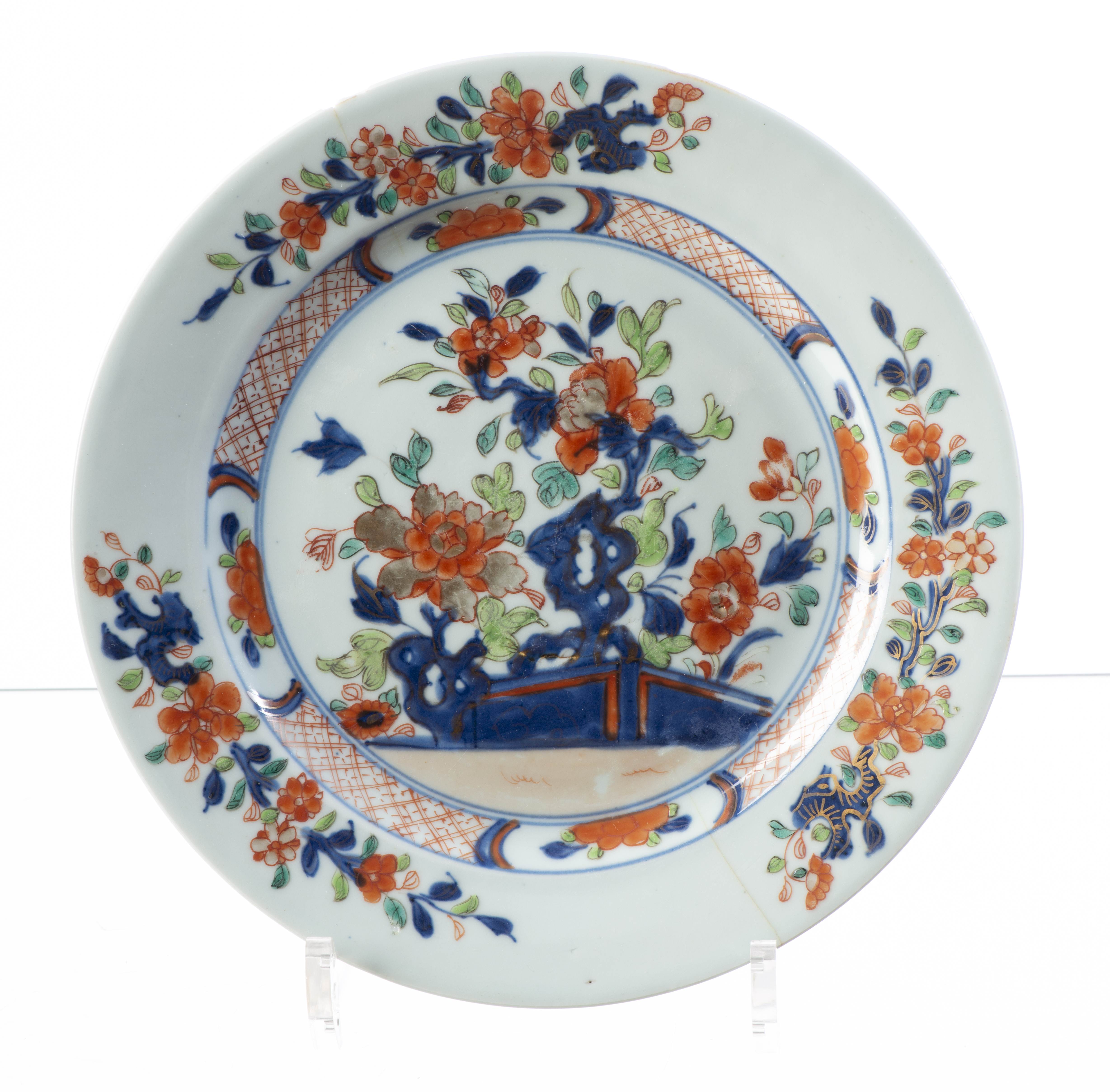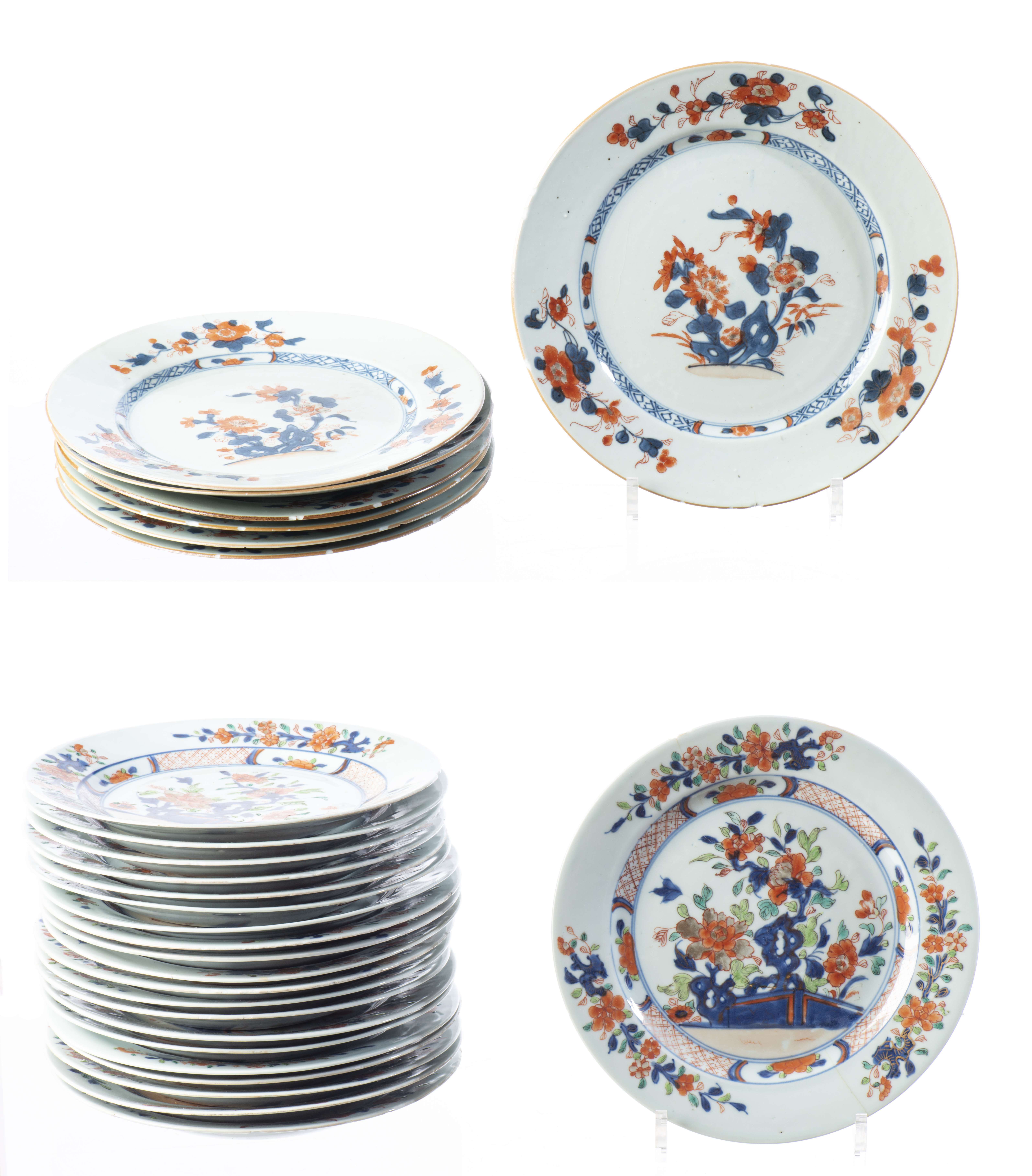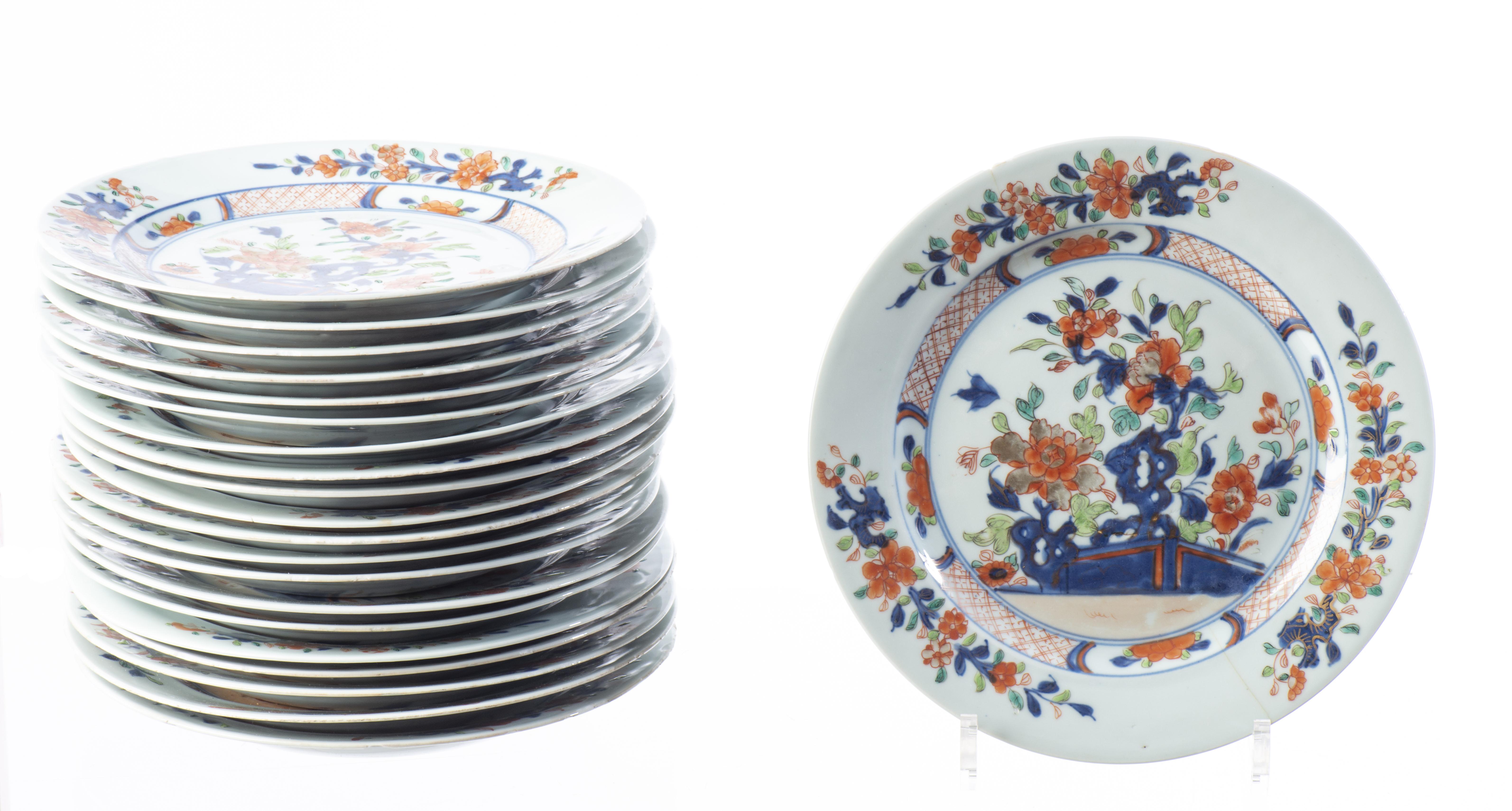 Vingt assiettes en porcelaine de Chine à décor Imari famille verte de fleurs et rocher du taihu dans un jardin, marli à motif en damier et médaillions de fleurs et bordure de fleurs. Epoque Kangxi XVIIIe.
