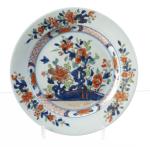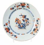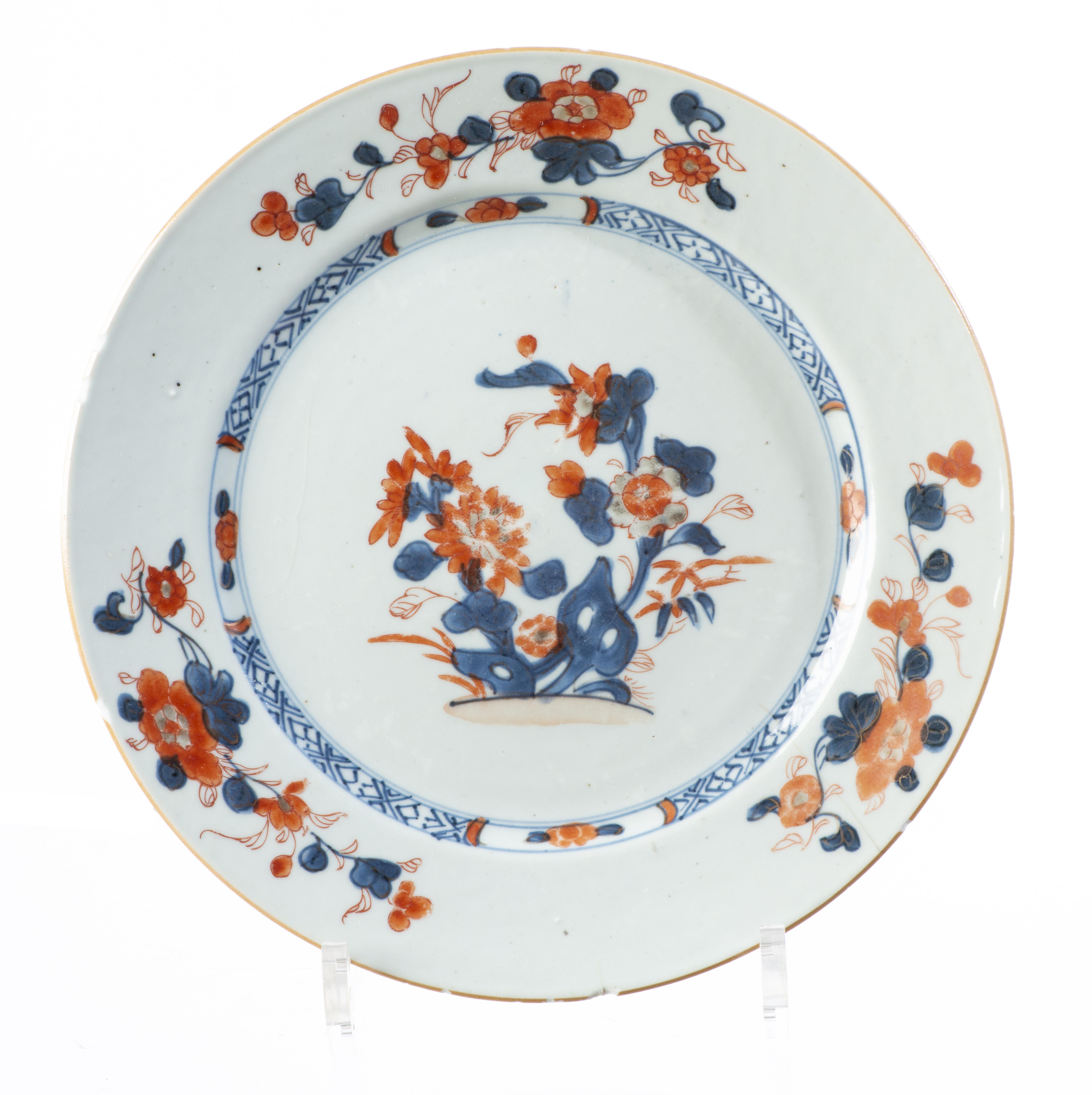 On y joint 7 assiettes en porcelaine de Chine à décor Imari à décor de fleurs et rochers, marli à décor de fleurs en losanges bleus et médaillons de fleurs rouges. Epoque Kangxi XVIIIe.