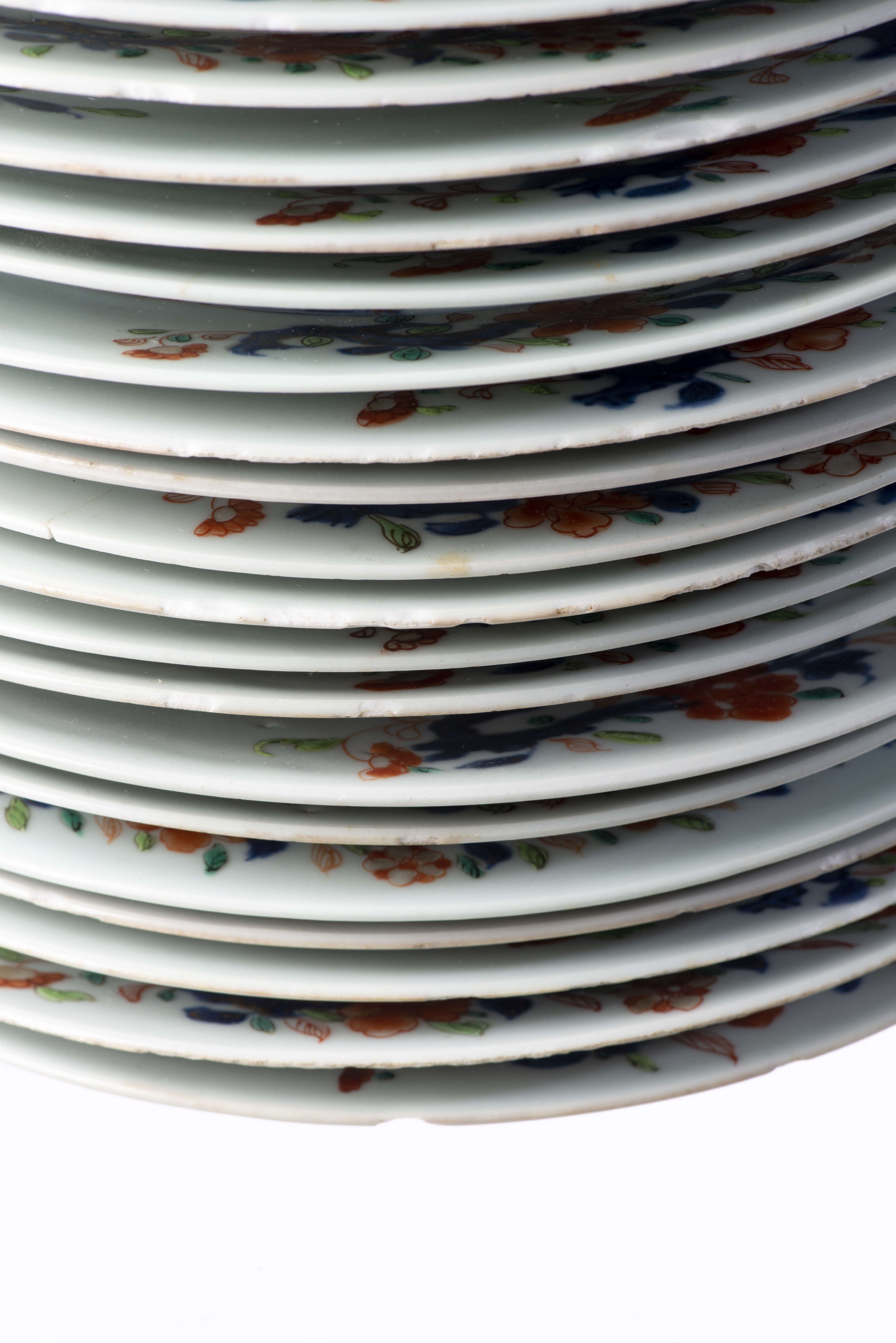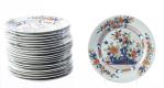 CHINE, vingt assiettes en porcelaine à décor Imari famille verte de motifs floraux et d'un rocher dans un jardin