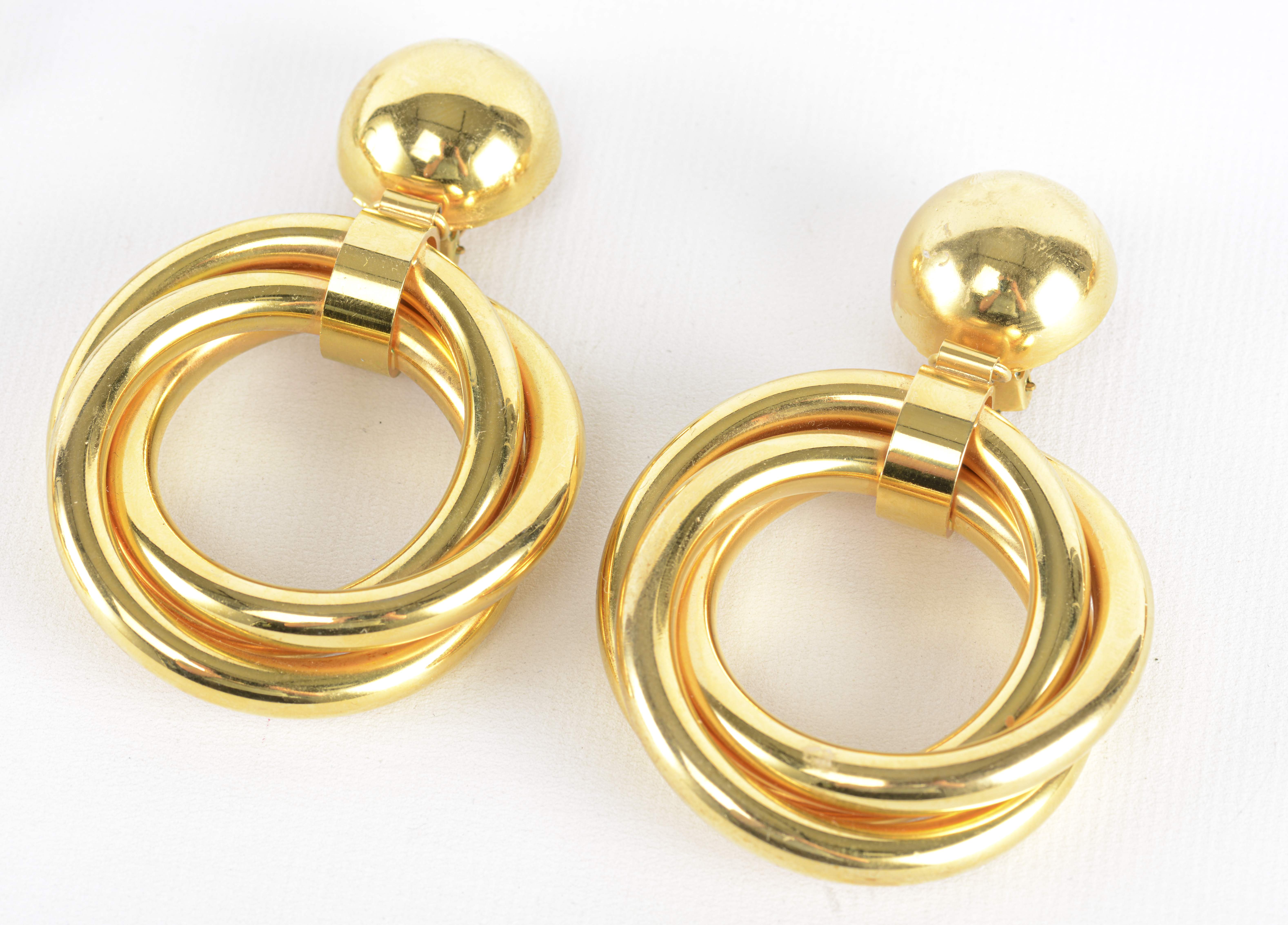 - Une paire de pendants à clips en métal doré, pièce signée Poggi. L. 8 cm