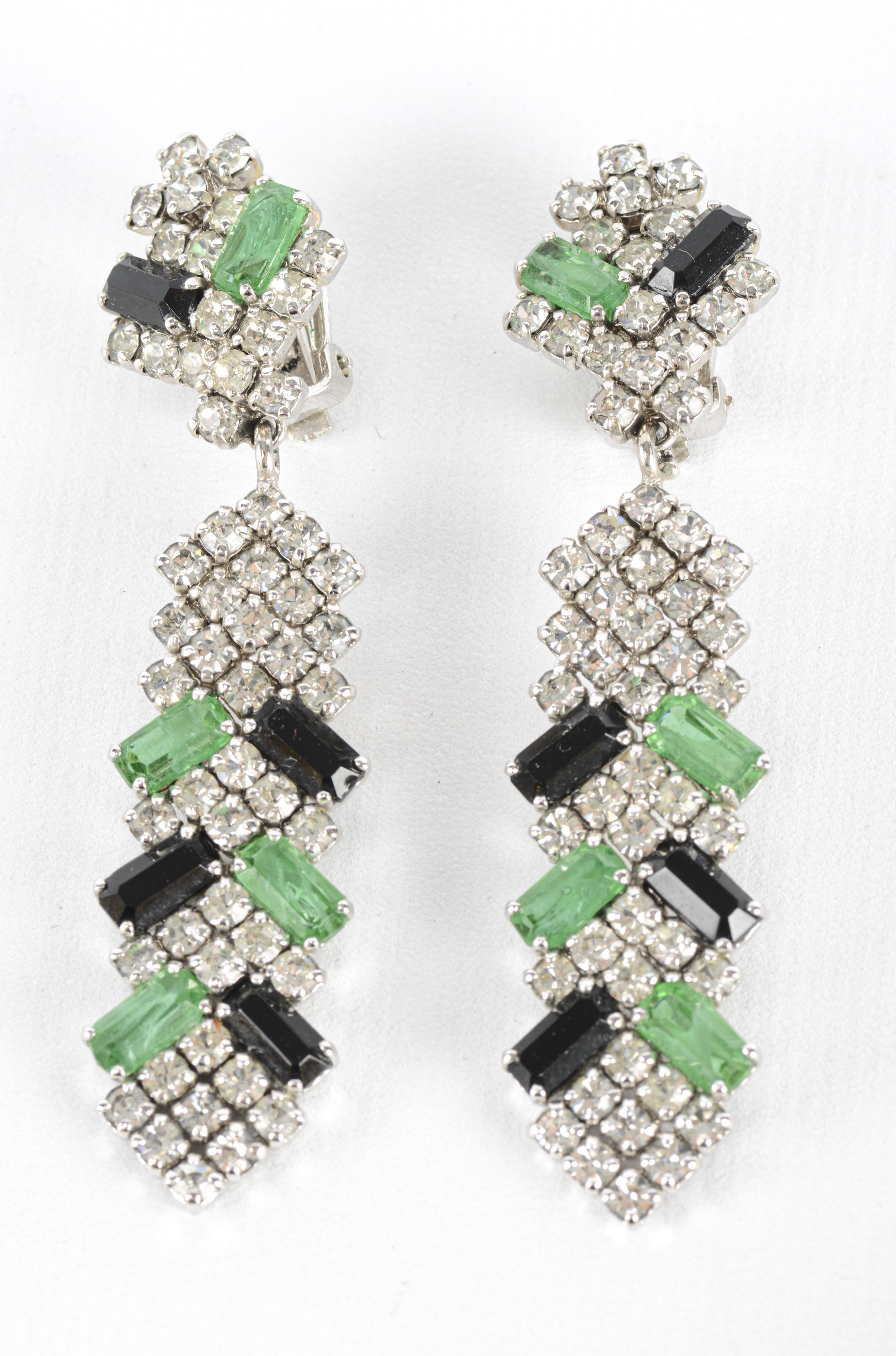 - Une paire de pendants à clips en métal et verrerie, piéce signée Christian Dior. L. 7.5 cm