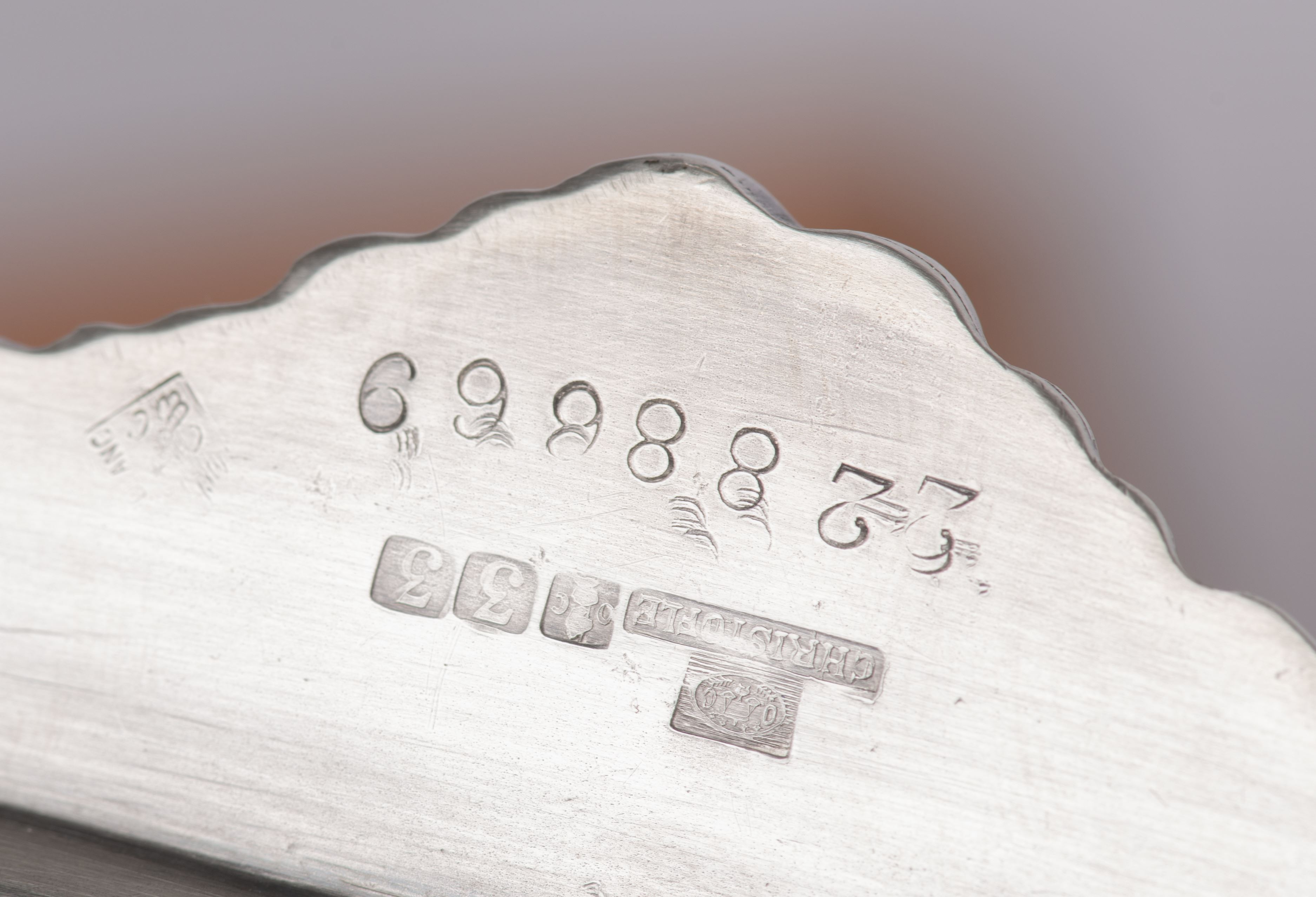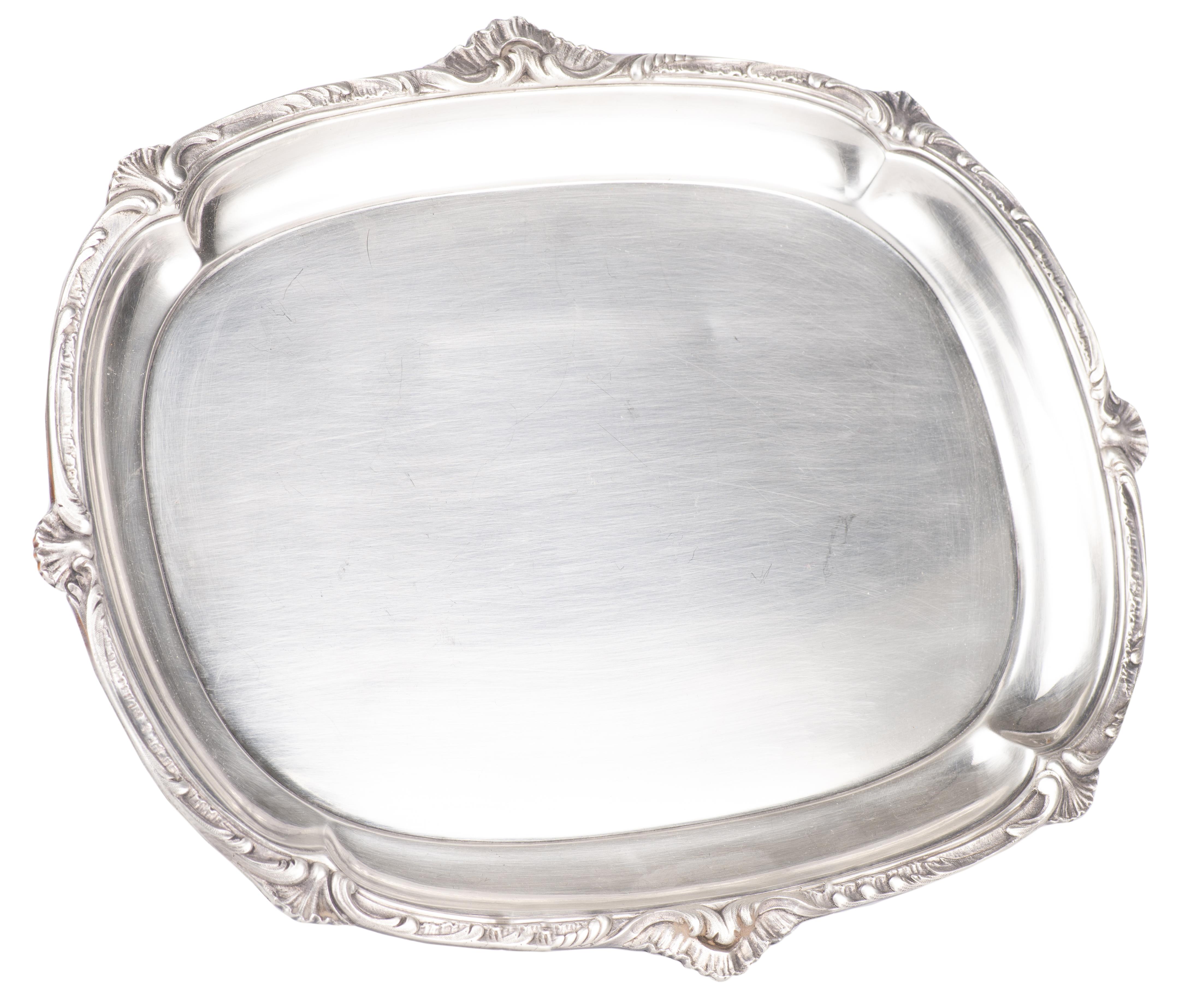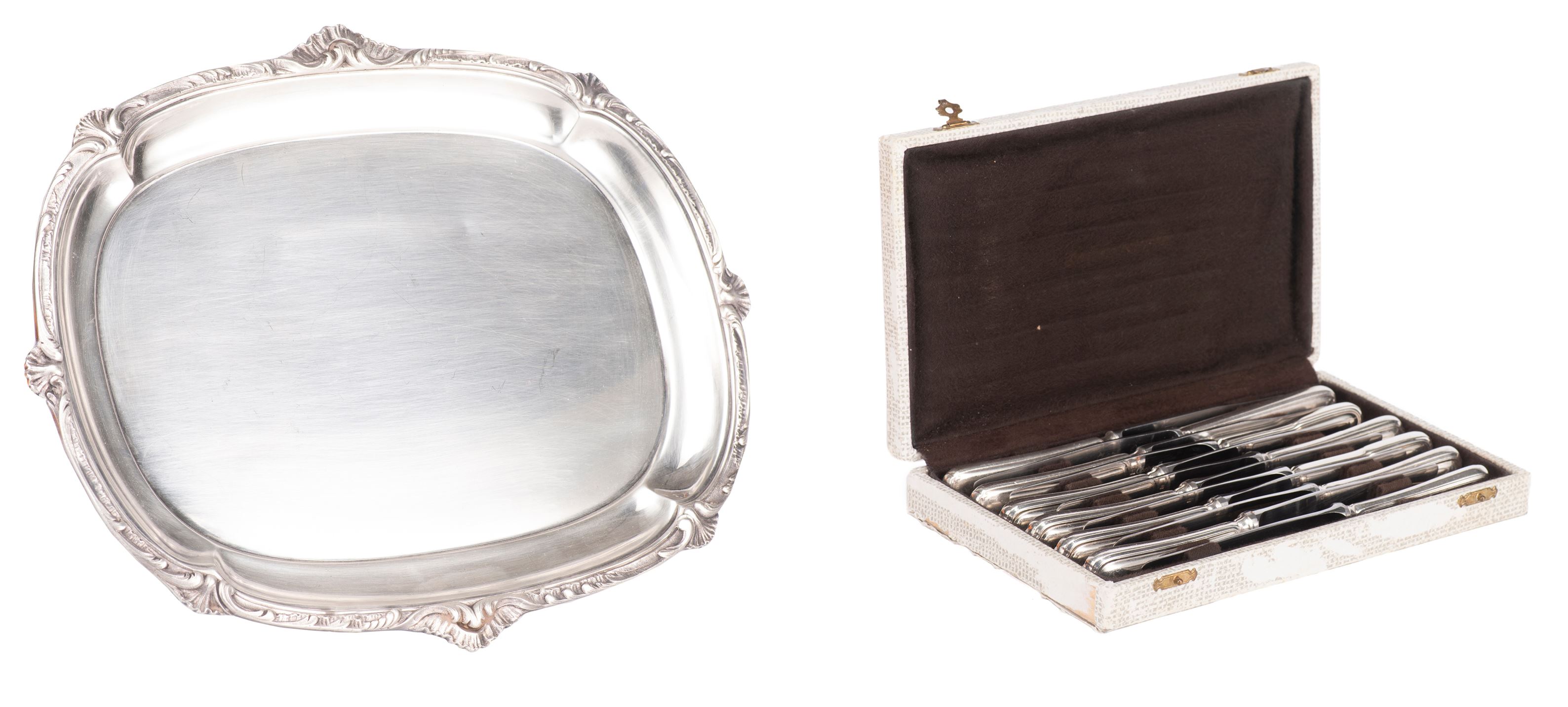 Un plateau à bordure feuillagée et douze petits couteaux en Christofle.