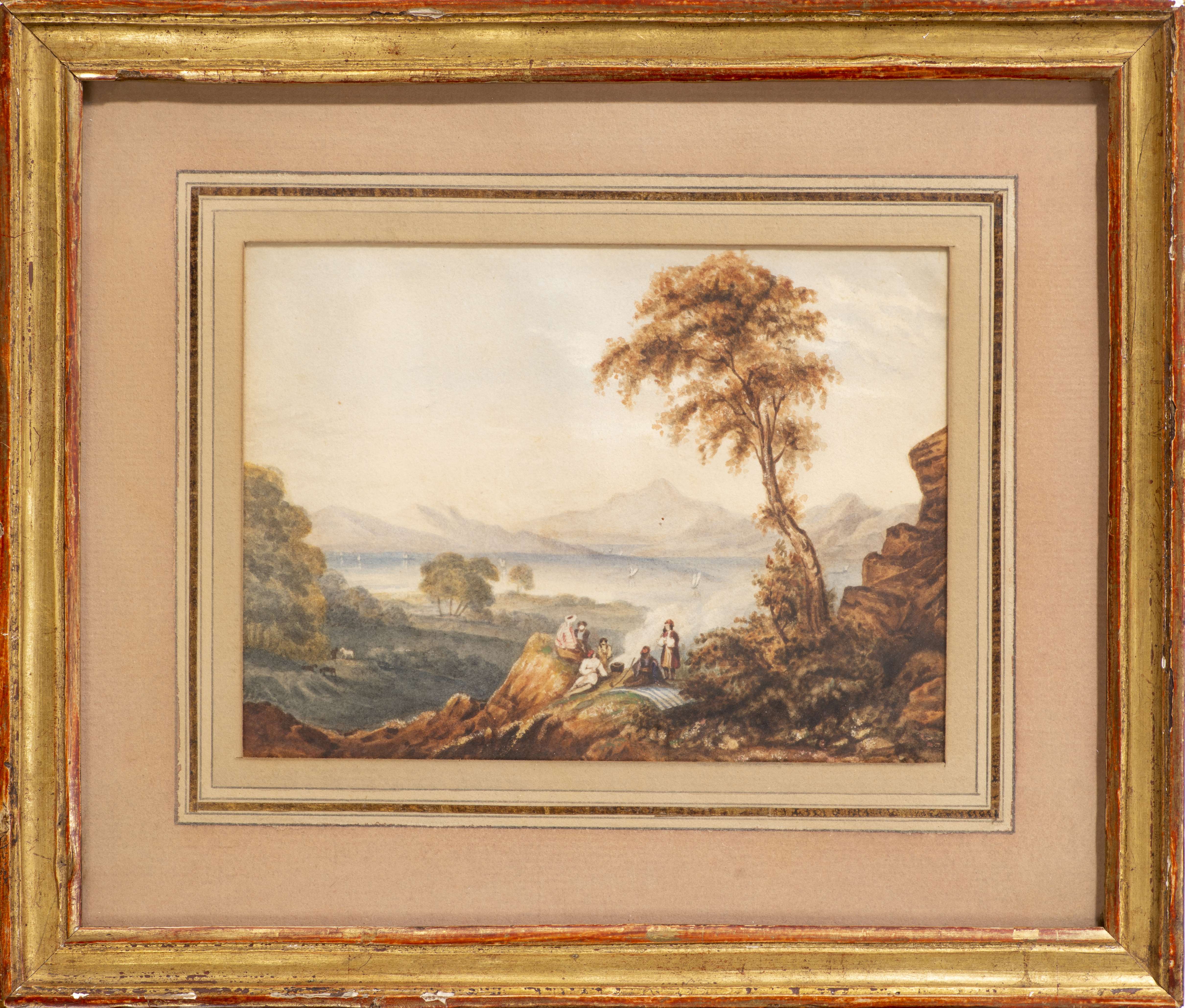 -Anonyme, "Pic-nique dans la campagne proche d'un lac" aquarelle sur papier non signés 13x17.9 cm à vue