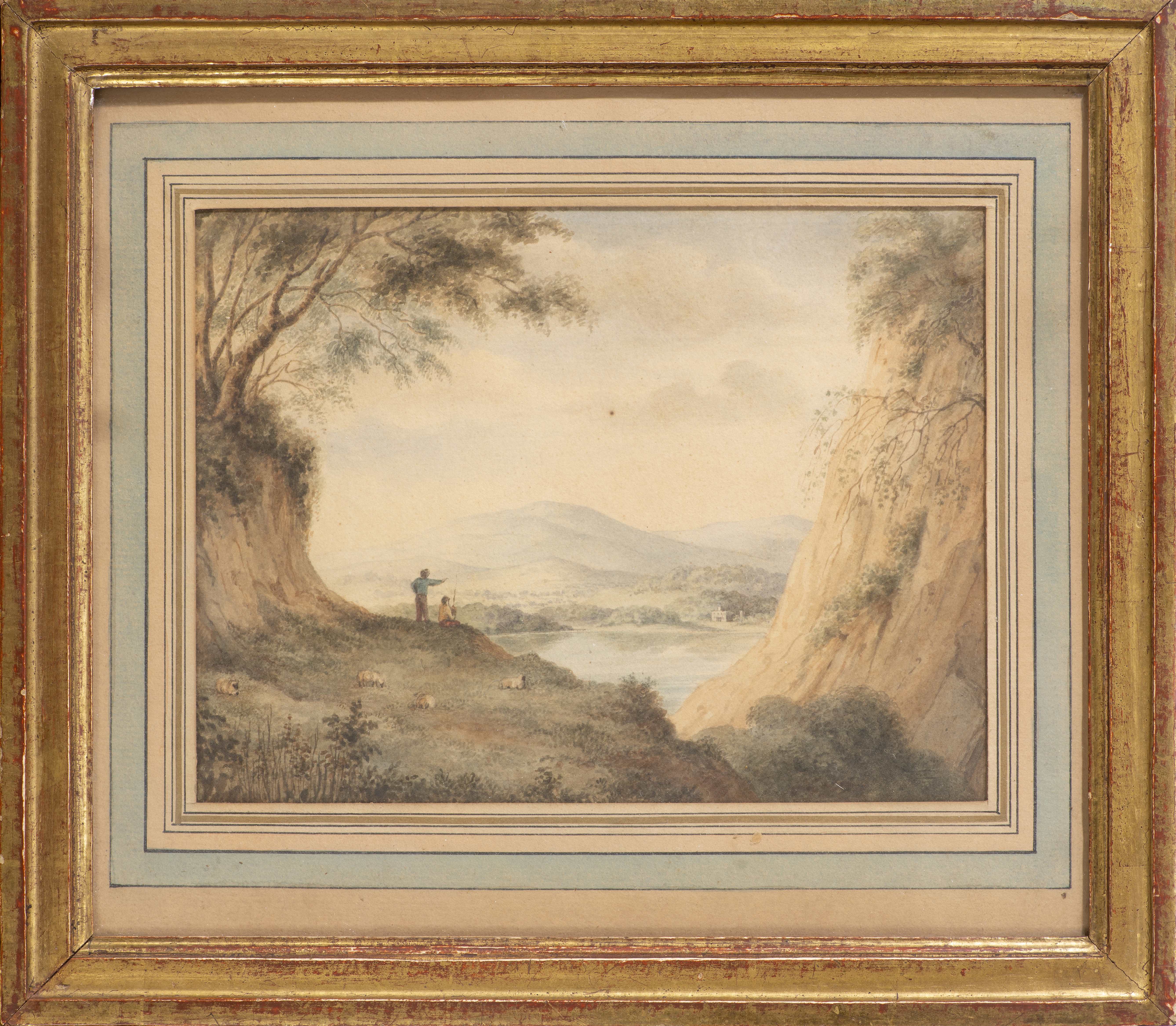 -Anonyme, "Vue du haut d'un lac avec bergers et moutons" aquarelle sur papier non signée