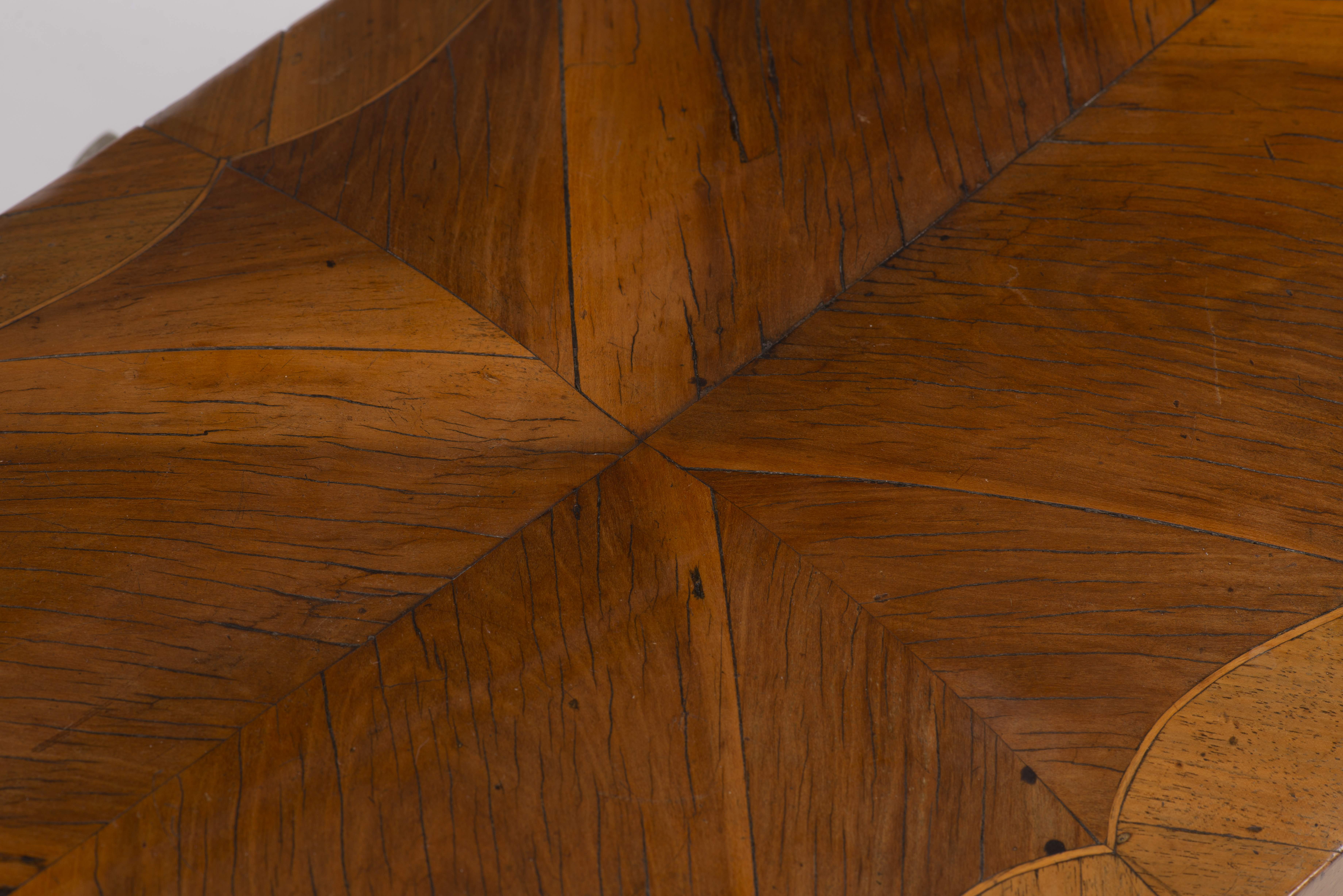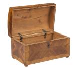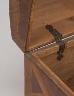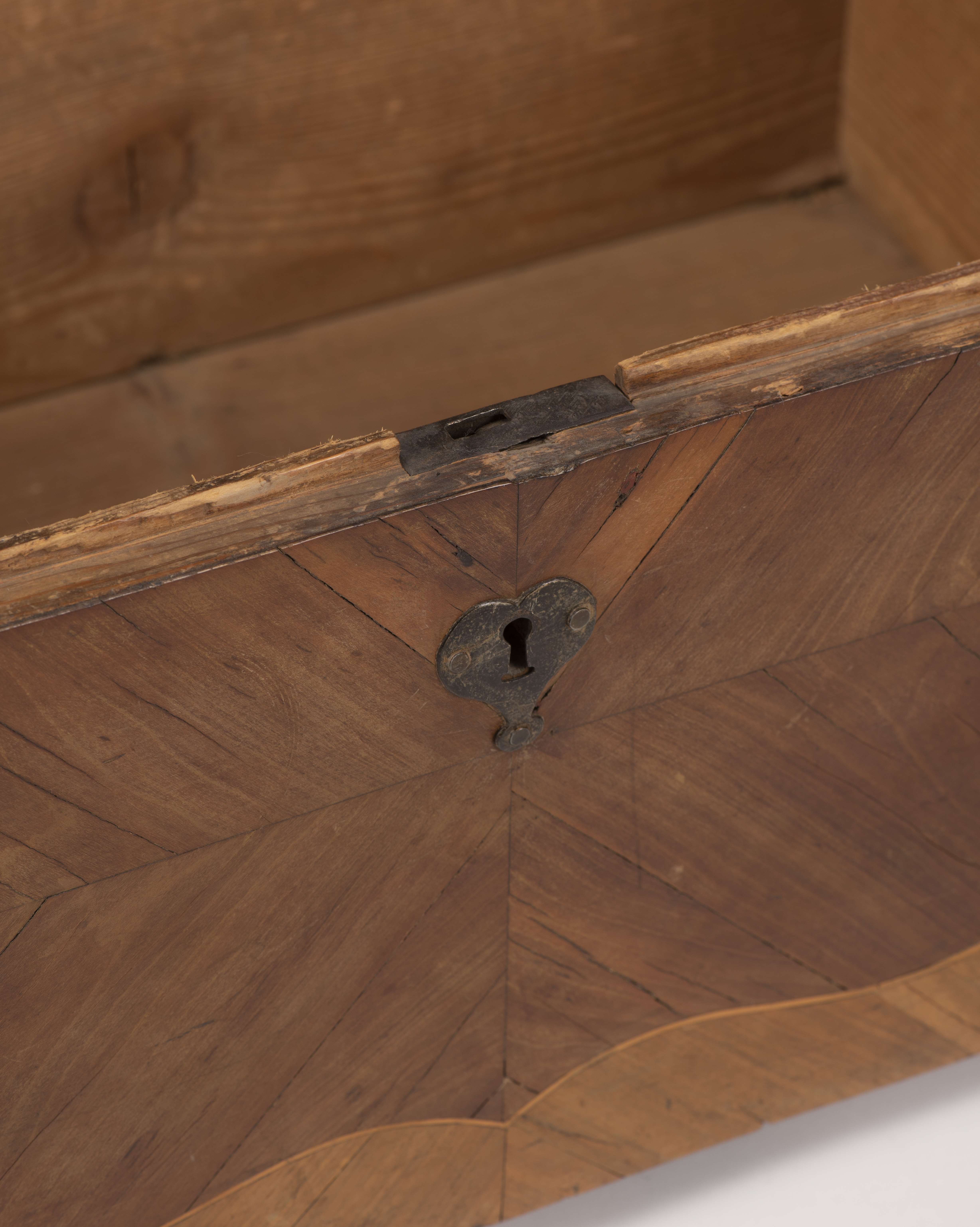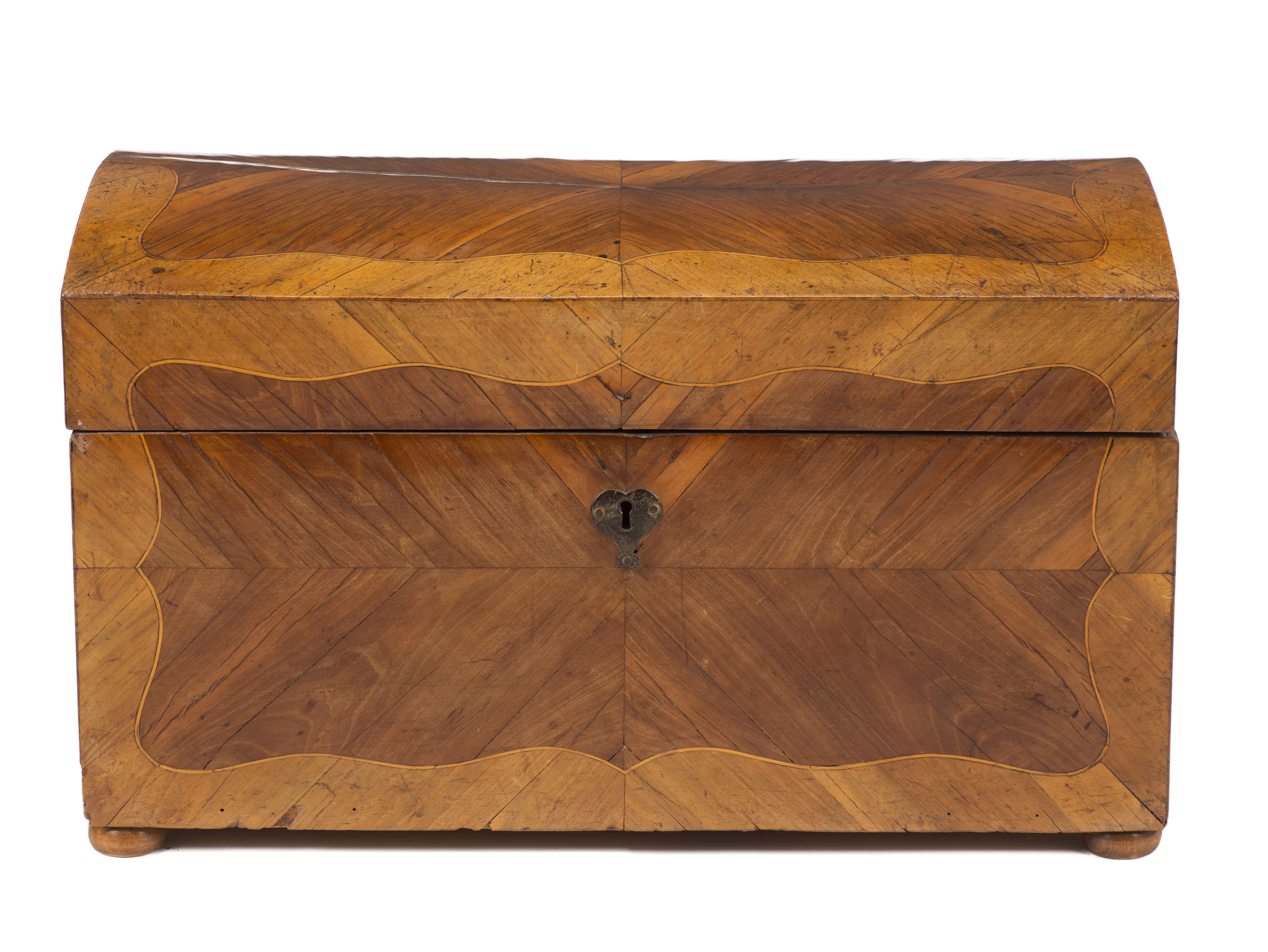 Coffre à papier rectangulaire ancien en placage de bois de rose et couvercle bombé, 4 pieds boules.