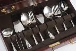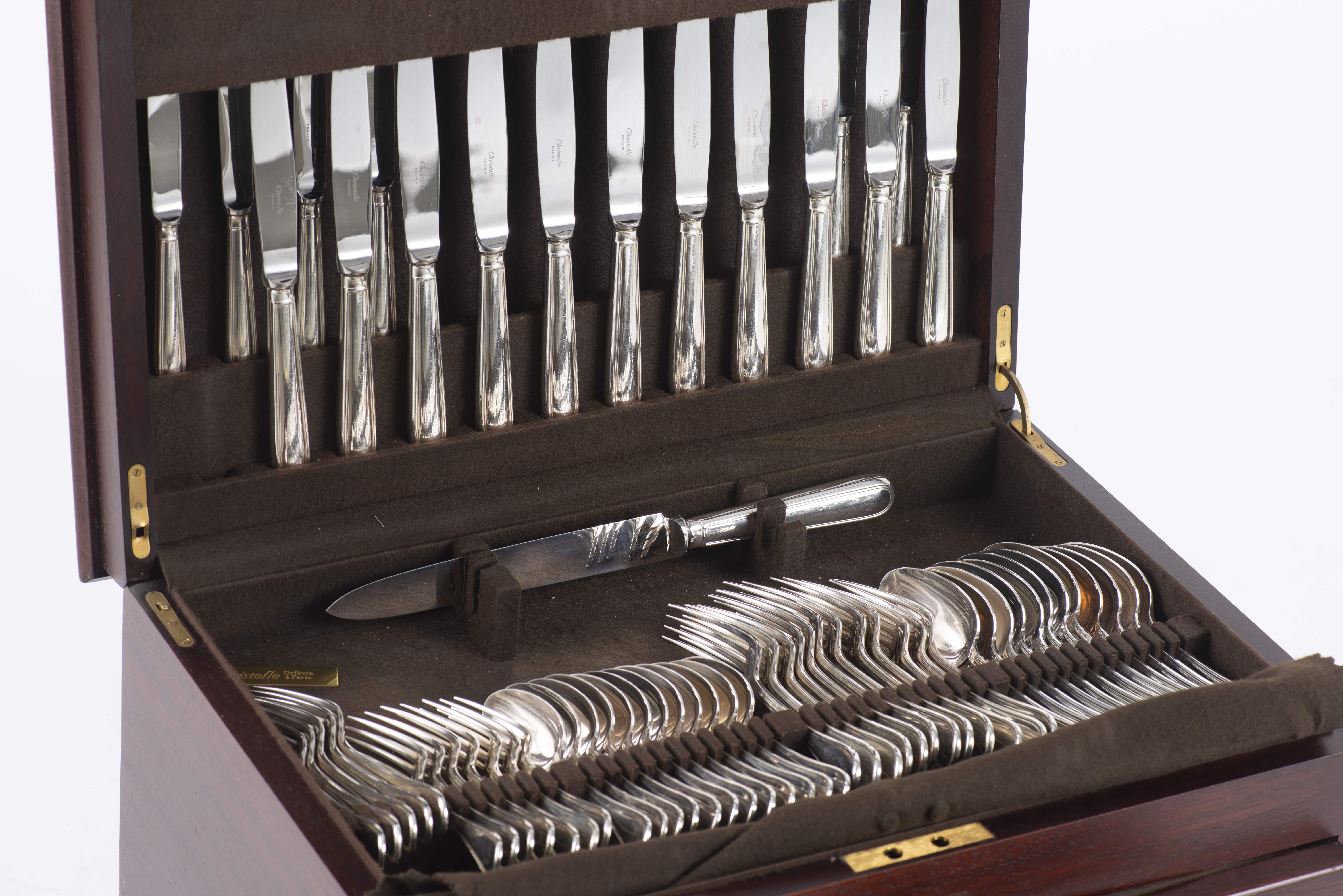 Coffret en acajou comprenant une ménagère en Christofle pour 12 personnes modèle Windsor