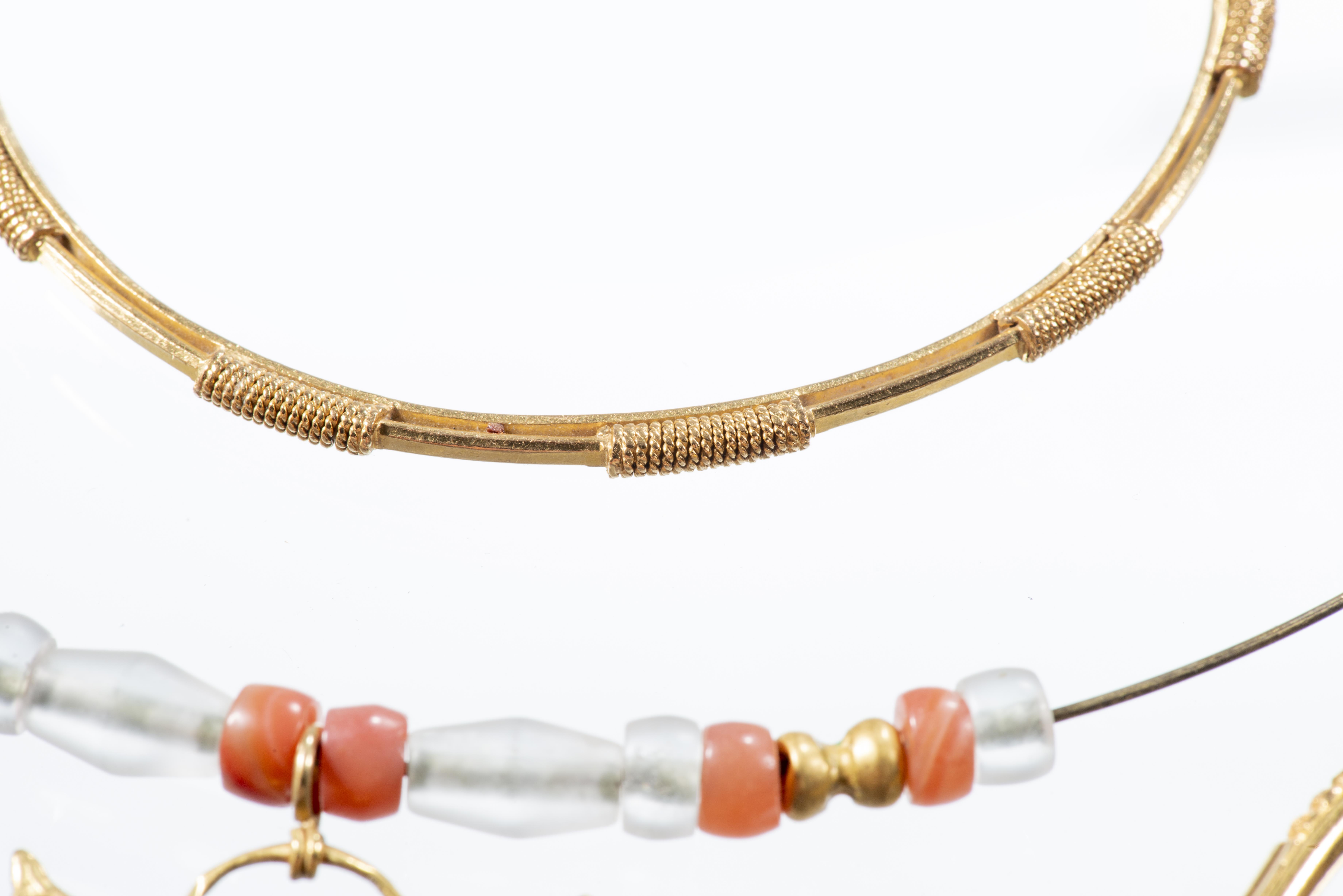 Collier ethnique (12.1 cm de diamètre) et deux bracelets (6.6 cm de diamètre) en or à bas titre.