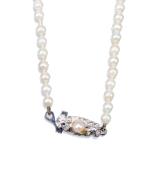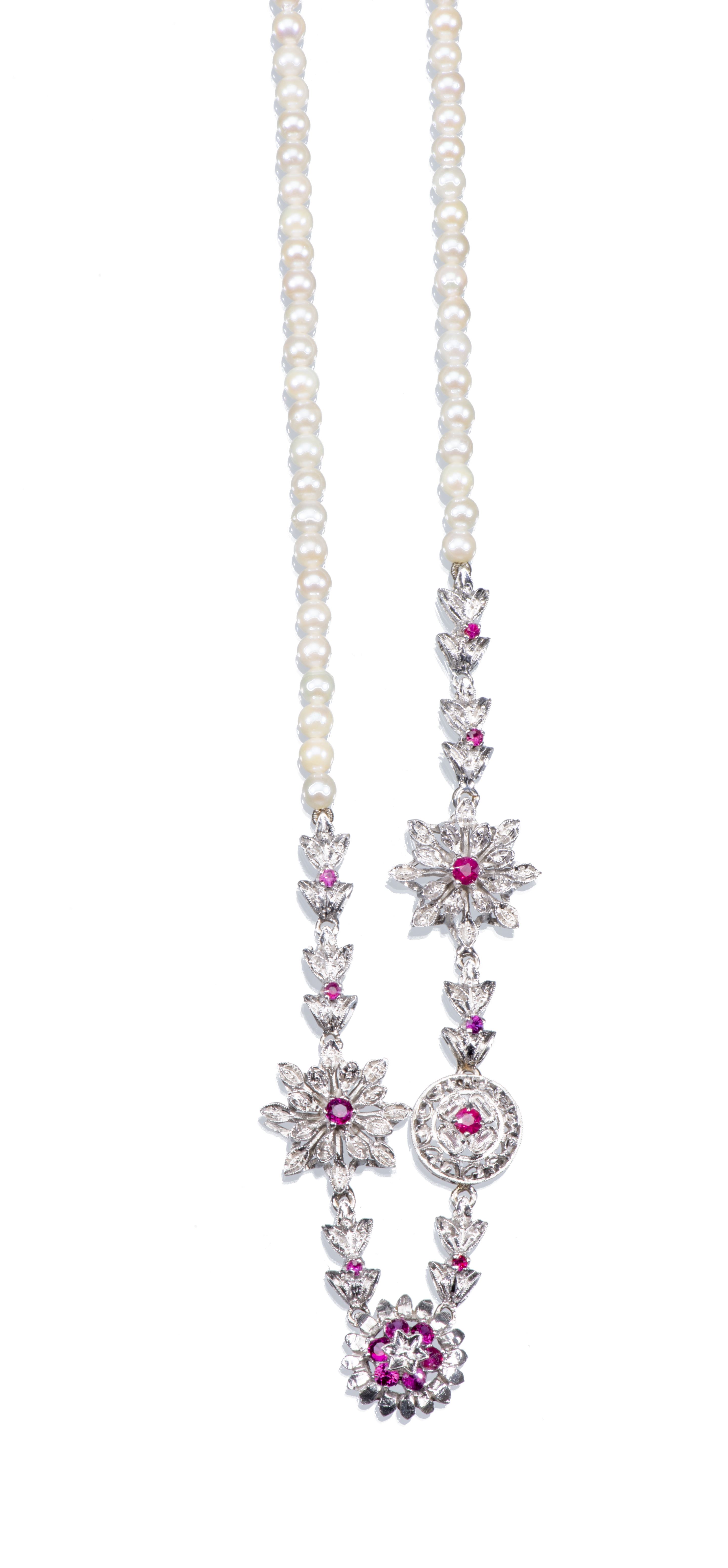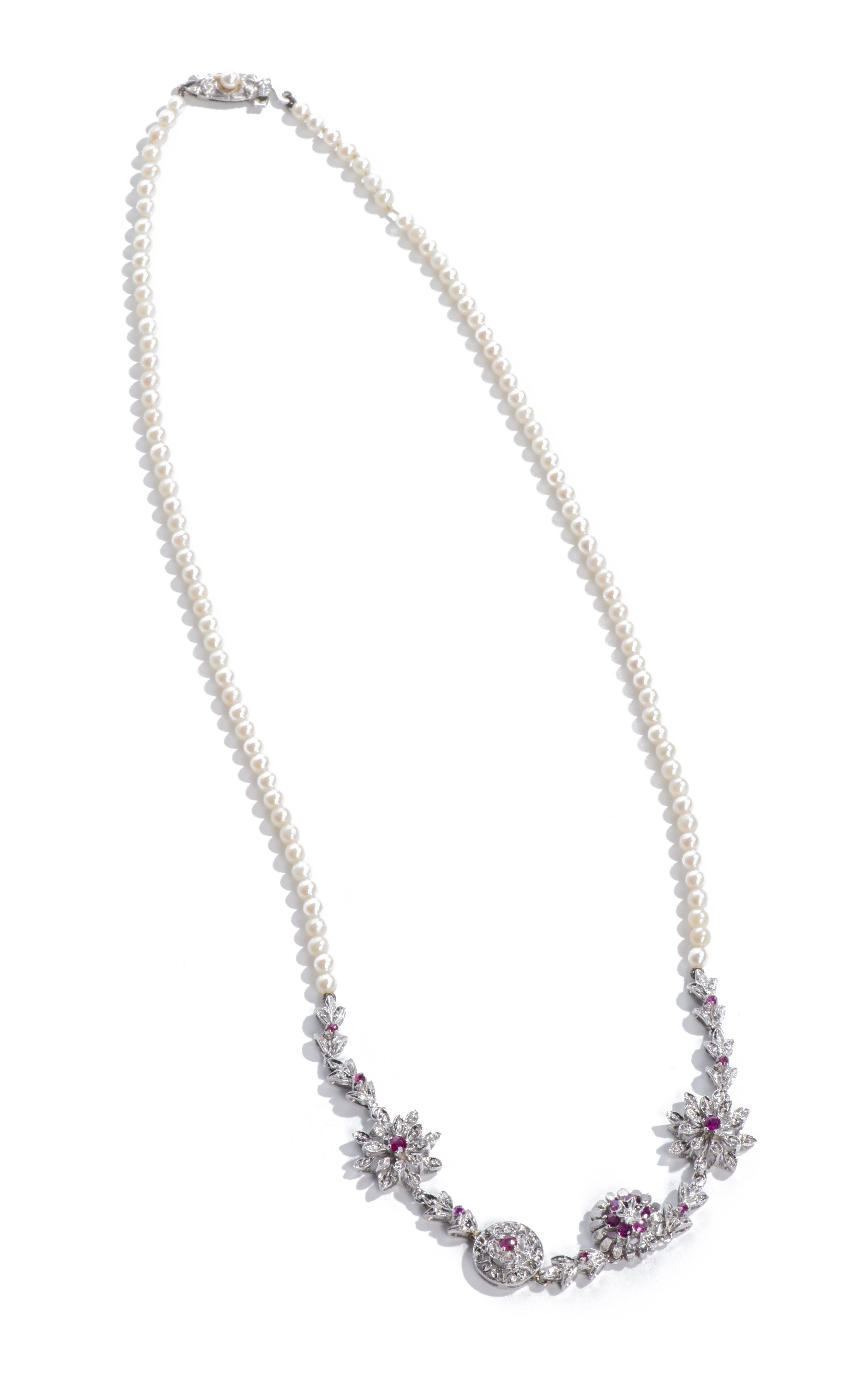 Colier tour de cou de perles rondes Akoya avec inserts en forme de fleurs totalisant 17 rubis pour 0.50 ct, fermoir en or blanc .750.