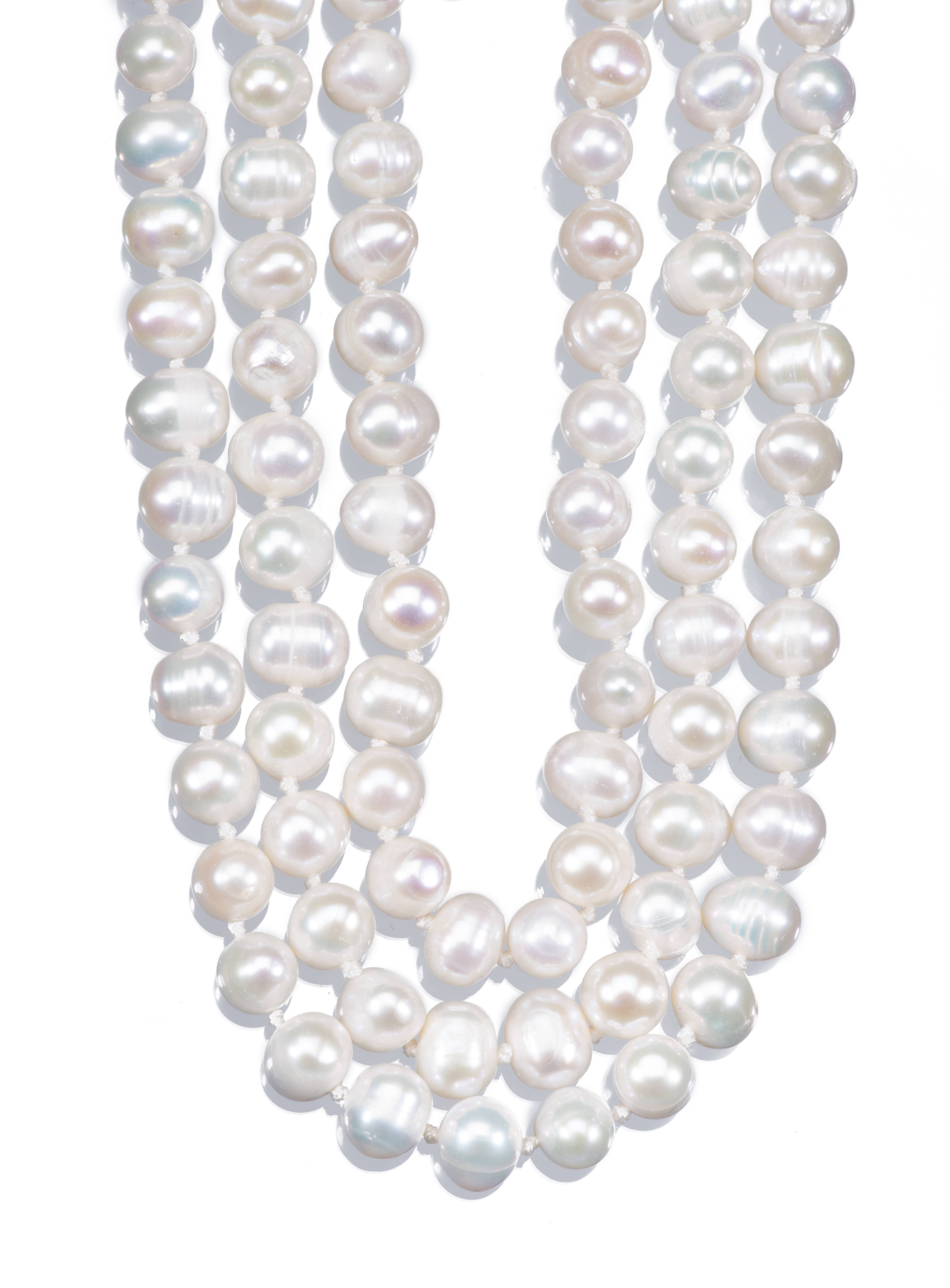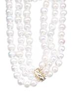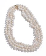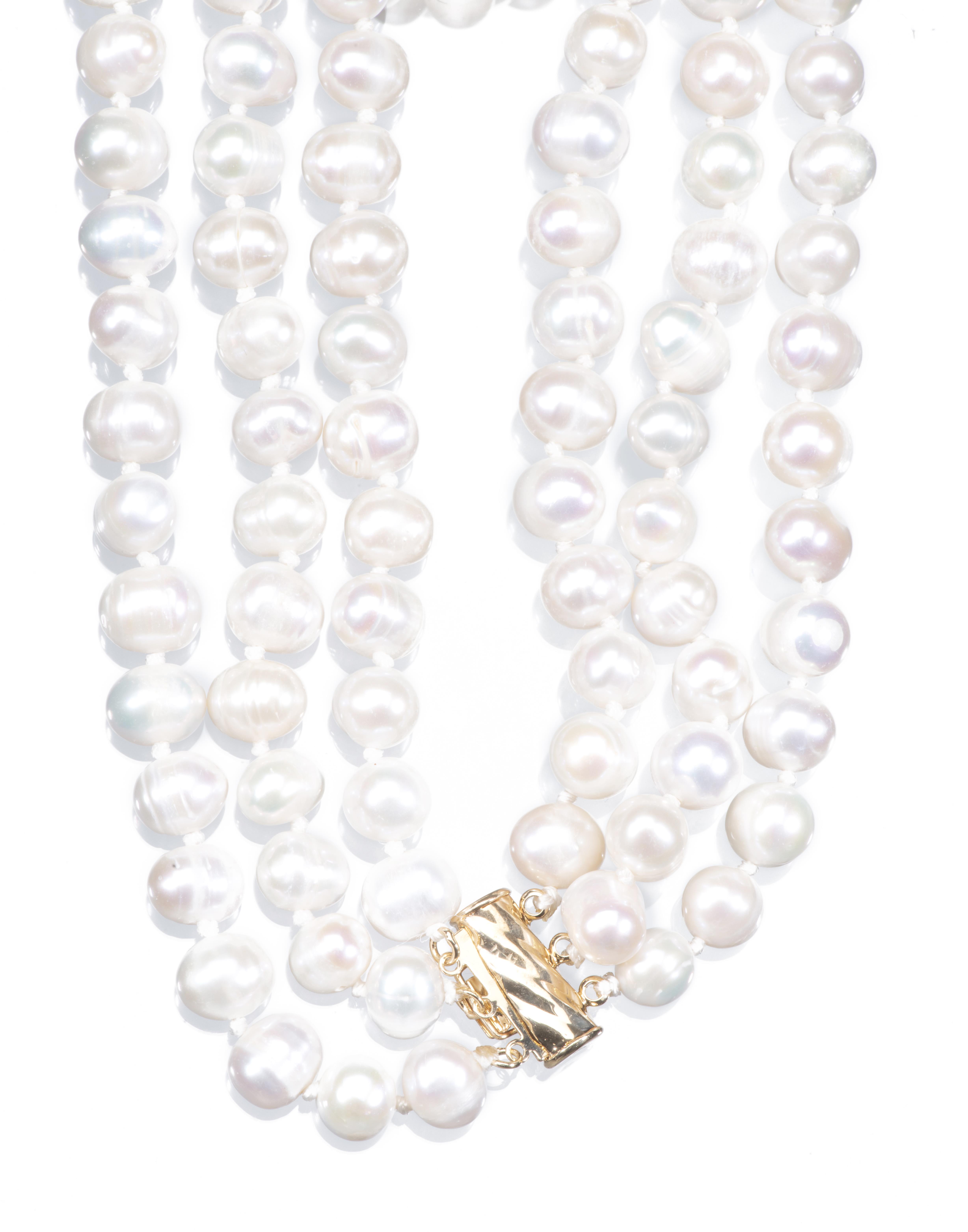 Collier tour de cou de perles d'eau douce semi-baroques à 3 rangs fermoir en métal doré.